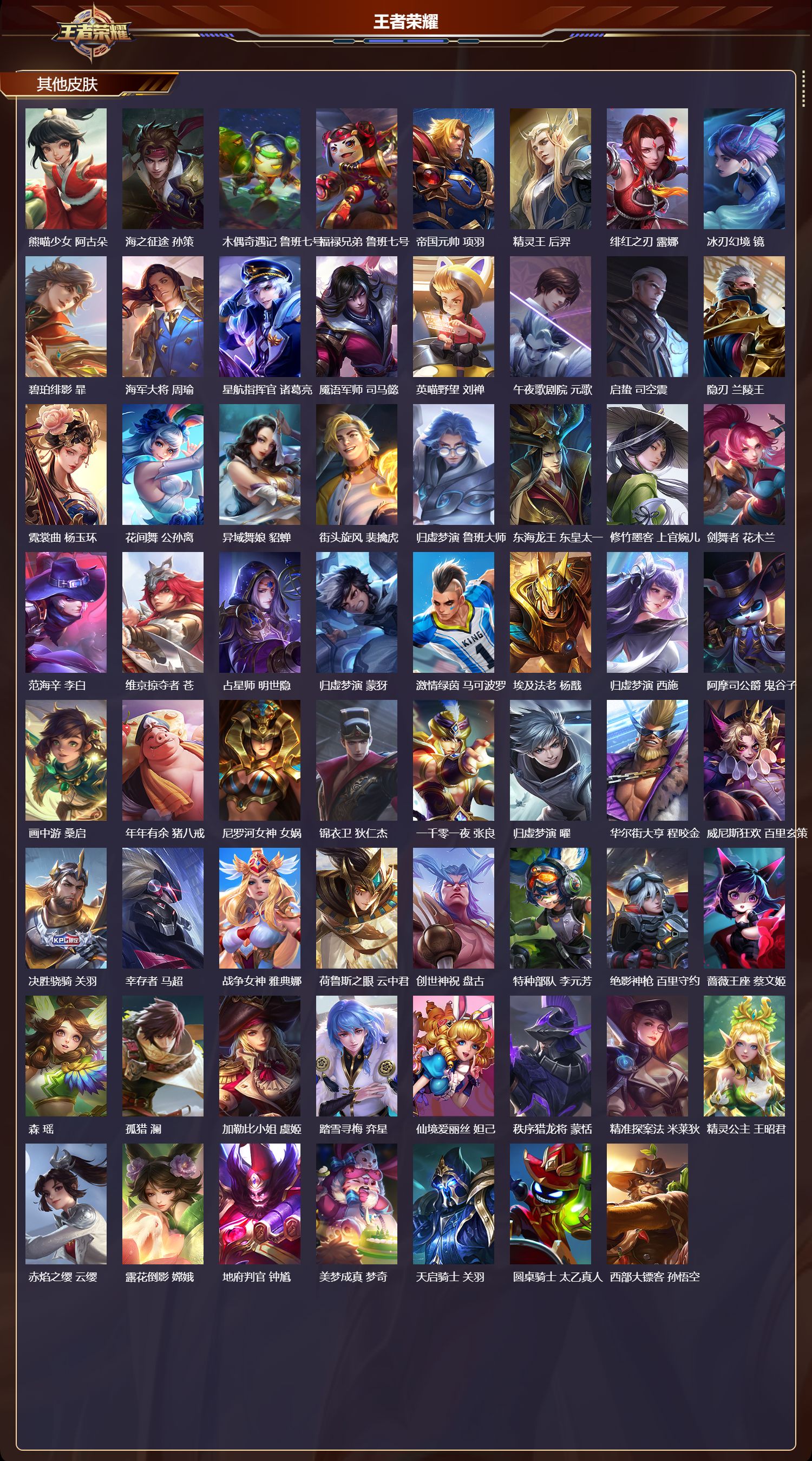 【83,其他皮肤】伊势巫女,大乔,金属狂潮,高渐离,前尘,金蝉,战争骑士,夏侯惇,圣殿之光,刘邦,芝加哥教父,黄忠,潮流仙人,老夫子,三太子,哪吒,棒球奇才,沈梦溪,极冰防御线,盾山,龙域领主,铠,生化警戒,钟无艳,超能战警,曹操,花见巫女,伽罗,爱与和平,苏烈,未来旅行,孙膑,第七人偶,干将莫邪,幻珠鲛人,朵莉亚,万圣前夜,小乔,灼热之刃,李信,熊喵少女,阿古朵,海之征途,孙策,木偶奇遇记,鲁班七号,福禄兄弟,鲁班七号,帝国元帅,项羽,精灵王,后羿,绯红之刃,露娜,冰刃幻境,镜,碧珀绯影,暃,海军大将,周瑜,星航指挥官,诸葛亮,魇语军师,司马懿,英喵野望,刘禅,午夜歌剧院,元歌,启蛰,司空震,隐刃,兰陵王,霓裳曲,杨玉环,花间舞,公孙离,异域舞娘,貂蝉,街头旋风,裴擒虎,归虚梦演,鲁班大师,东海龙王,东皇太一,修竹墨客,上官婉儿,剑舞者,花木兰,范海辛,李白,维京掠夺者,苍,占星师,明世隐,归虚梦演,蒙犽,激情绿茵,马可波罗,埃及法老,杨戬,归虚梦演,西施,阿摩司公爵,鬼谷子,画中游,桑启,年年有余,猪八戒,尼罗河女神,女娲,锦衣卫,狄仁杰,一千零一夜,张良,归虚梦演,曜,华尔街大亨,程咬金,威尼斯狂欢,百里玄策,决胜骁骑,关羽,幸存者,马超,战争女神,雅典娜,荷鲁斯之眼,云中君,创世神祝,盘古,特种部队,李元芳,绝影神枪,百里守约,蔷薇王座,蔡文姬,森,瑶,孤猎,澜,加勒比小姐,虞姬,踏雪寻梅,弈星,仙境爱丽丝,妲己,秩序猎龙将,蒙恬,精准探案法,米莱狄,精灵公主,王昭君,赤焰之缨,云缨,露花倒影,嫦娥,地府判官,钟馗,美梦成真,梦奇,天启骑士,关羽,圆桌骑士,太乙真人,西部大镖客,孙悟空,
