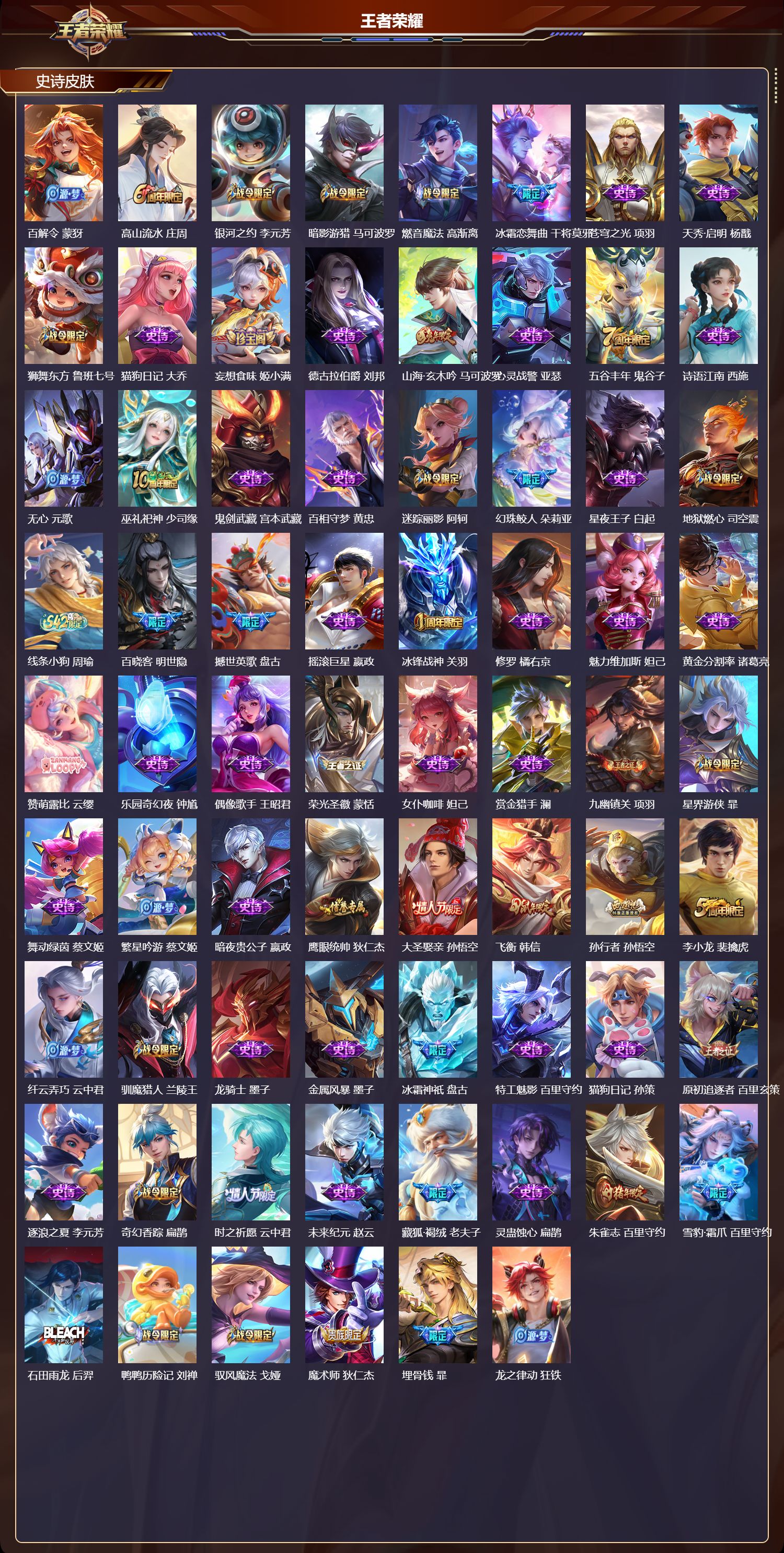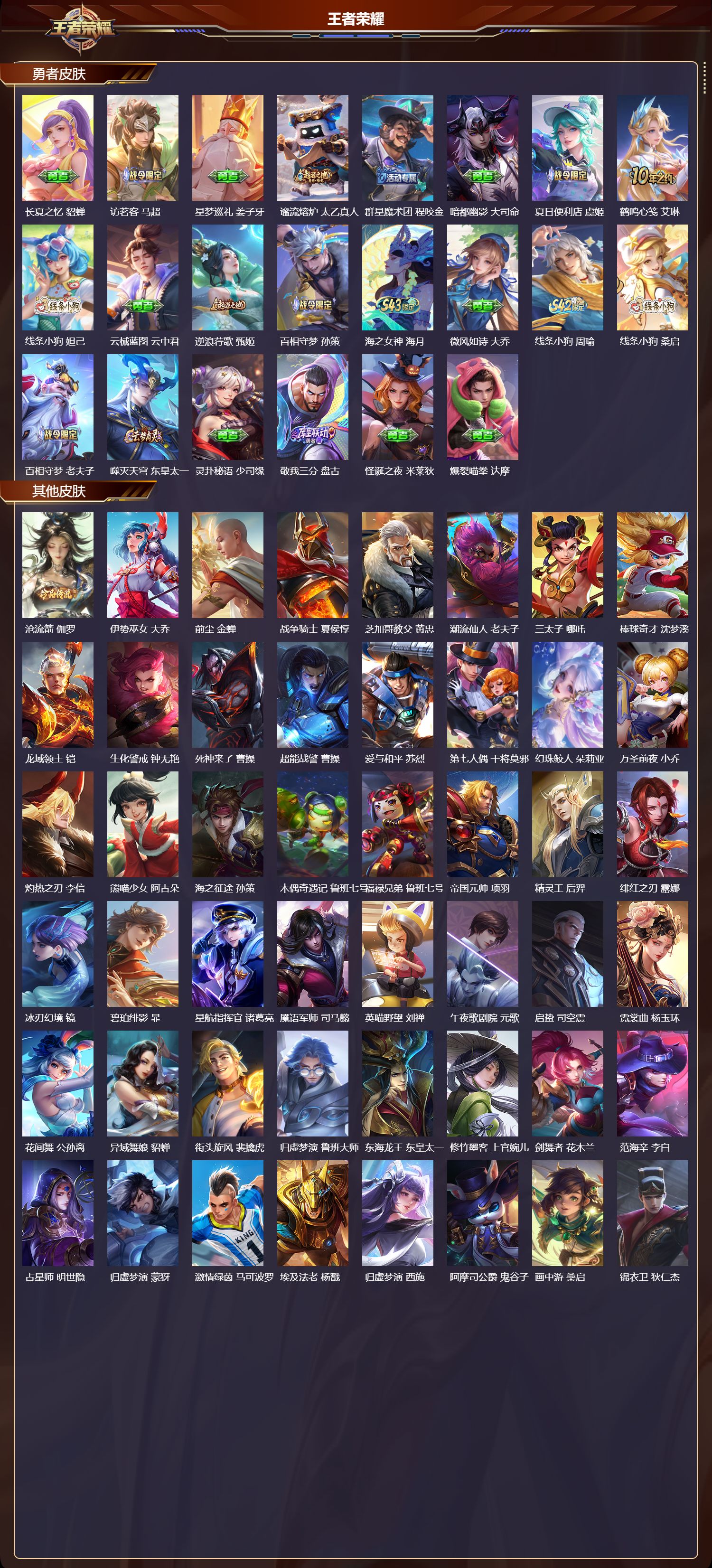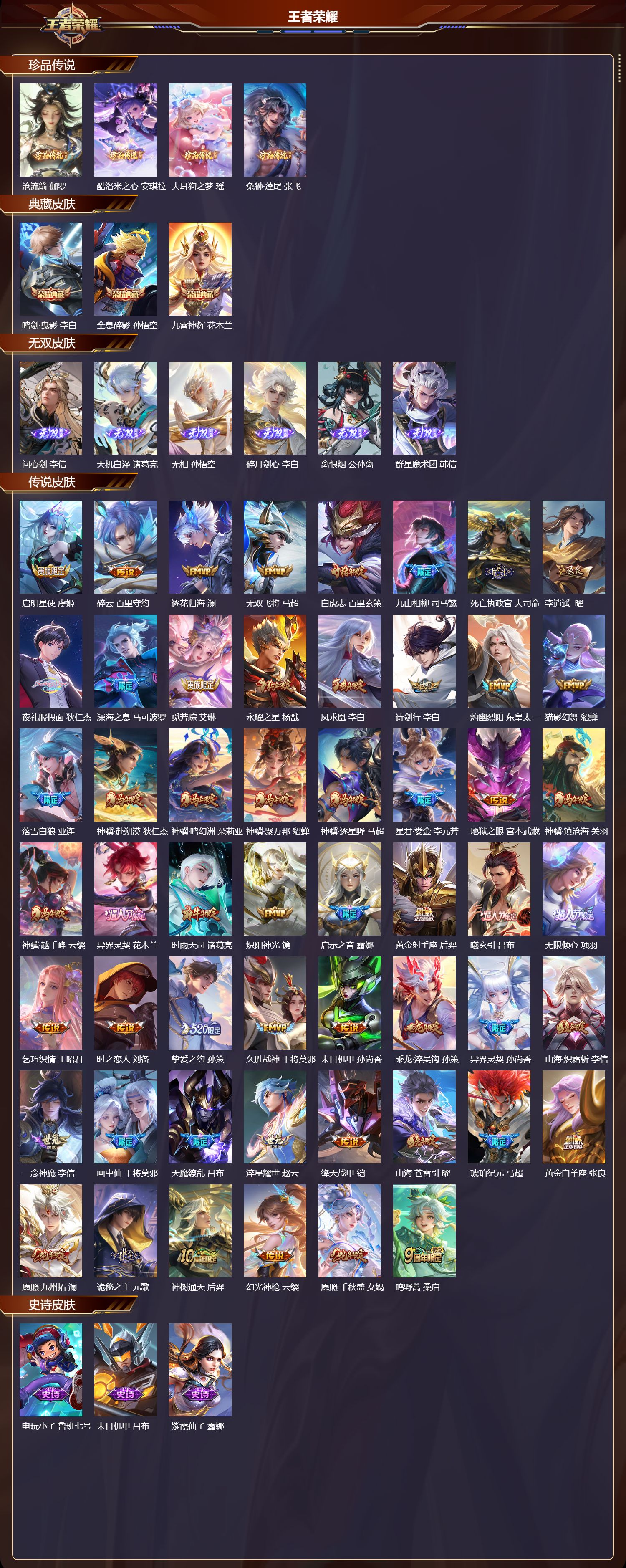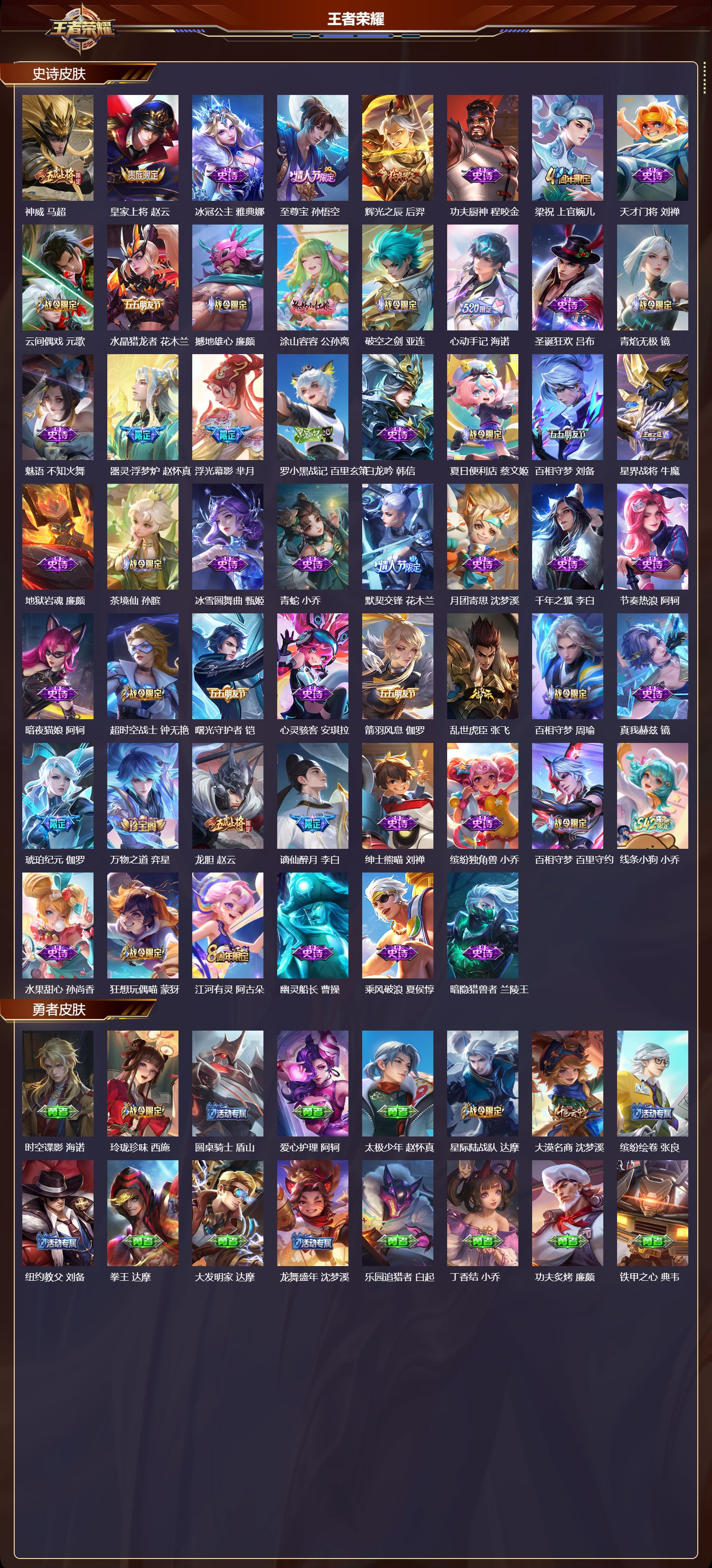 【127,史诗皮肤】电玩小子,鲁班七号,末日机甲,吕布,紫霞仙子,露娜,百解令,蒙犽,高山流水,庄周,银河之约,李元芳,暗影游猎,马可波罗,燃音魔法,高渐离,冰霜恋舞曲,干将莫邪,苍穹之光,项羽,天秀·启明,杨戬,狮舞东方,鲁班七号,猫狗日记,大乔,妄想食味,姬小满,德古拉伯爵,刘邦,山海·玄木吟,马可波罗,心灵战警,亚瑟,五谷丰年,鬼谷子,诗语江南,西施,无心,元歌,巫礼祀神,少司缘,鬼剑武藏,宫本武藏,百相守梦,黄忠,迷踪丽影,阿轲,幻珠鲛人,朵莉亚,星夜王子,白起,地狱燃心,司空震,线条小狗,周瑜,百晓客,明世隐,撼世英歌,盘古,摇滚巨星,嬴政,冰锋战神,关羽,修罗,橘右京,魅力维加斯,妲己,黄金分割率,诸葛亮,赞萌露比,云缨,乐园奇幻夜,钟馗,偶像歌手,王昭君,荣光圣徽,蒙恬,女仆咖啡,妲己,赏金猎手,澜,九幽镇关,项羽,星界游侠,暃,舞动绿茵,蔡文姬,繁星吟游,蔡文姬,暗夜贵公子,嬴政,鹰眼统帅,狄仁杰,大圣娶亲,孙悟空,飞衡,韩信,孙行者,孙悟空,李小龙,裴擒虎,纤云弄巧,云中君,驯魔猎人,兰陵王,龙骑士,墨子,金属风暴,墨子,冰霜神祇,盘古,特工魅影,百里守约,猫狗日记,孙策,原初追逐者,百里玄策,逐浪之夏,李元芳,奇幻香踪,扁鹊,时之祈愿,云中君,未来纪元,赵云,藏狐·褐绒,老夫子,灵蛊蚀心,扁鹊,朱雀志,百里守约,雪豹·霜爪,百里守约,石田雨龙,后羿,鸭鸭历险记,刘禅,驭风魔法,戈娅,魔术师,狄仁杰,埋骨钱,暃,龙之律动,狂铁,神威,马超,皇家上将,赵云,冰冠公主,雅典娜,至尊宝,孙悟空,辉光之辰,后羿,功夫厨神,程咬金,梁祝,上官婉儿,天才门将,刘禅,云间偶戏,元歌,水晶猎龙者,花木兰,撼地雄心,廉颇,涂山容容,公孙离,破空之剑,亚连,心动手记,海诺,圣诞狂欢,吕布,青焰无极,镜,魅语,不知火舞,器灵·浮梦炉,赵怀真,浮光幕影,芈月,罗小黑战记,百里玄策,白龙吟,韩信,夏日便利店,蔡文姬,百相守梦,刘备,星界战将,牛魔,地狱岩魂,廉颇,茶境仙,孙膑,冰雪圆舞曲,甄姬,青蛇,小乔,默契交锋,花木兰,月团寄思,沈梦溪,千年之狐,李白,节奏热浪,阿轲,暗夜猫娘,阿轲,超时空战士,钟无艳,曙光守护者,铠,心灵骇客,安琪拉,箭羽风息,伽罗,乱世虎臣,张飞,百相守梦,周瑜,真我赫兹,镜,琥珀纪元,伽罗,万物之道,弈星,龙胆,赵云,谪仙醉月,李白,绅士熊喵,刘禅,缤纷独角兽,小乔,百相守梦,百里守约,线条小狗,小乔,水果甜心,孙尚香,狂想玩偶喵,蒙犽,江河有灵,阿古朵,幽灵船长,曹操,乘风破浪,夏侯惇,暗隐猎兽者,兰陵王,