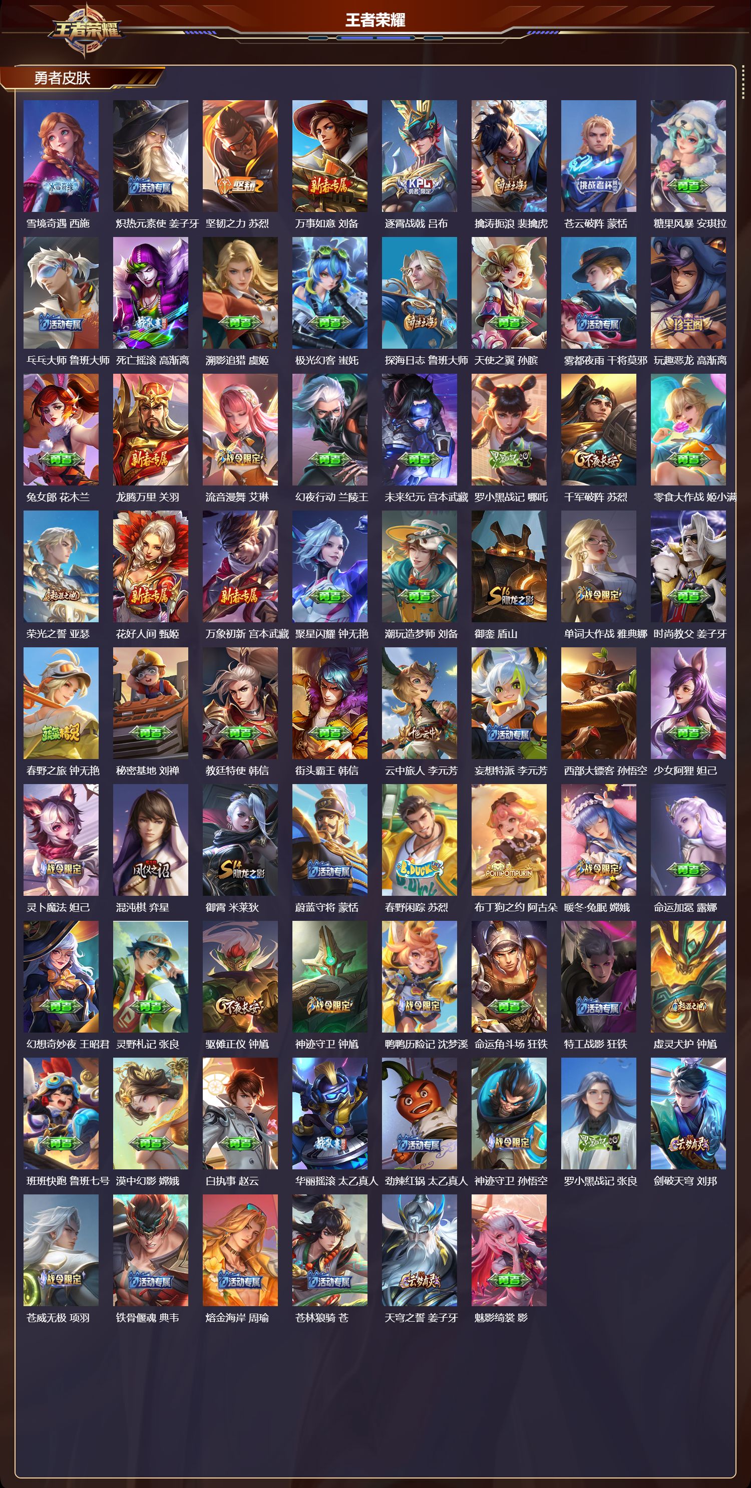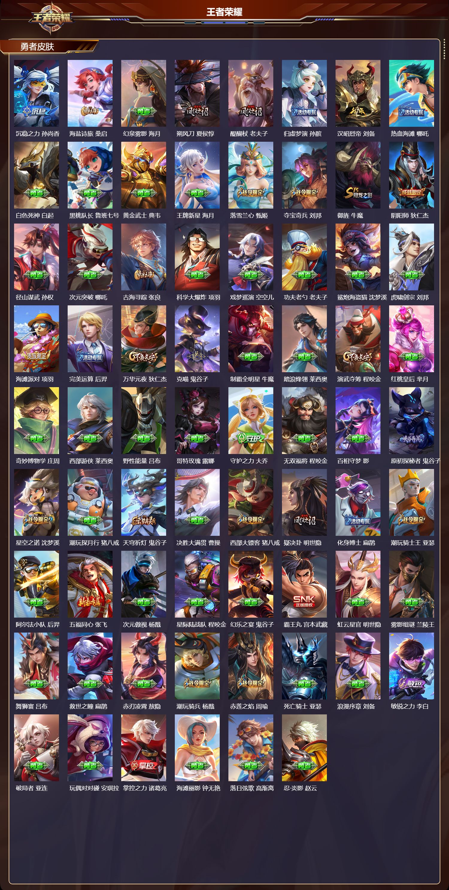 【178,勇者皮肤】时空谍影,海诺,玲珑珍味,西施,圆桌骑士,盾山,爱心护理,阿轲,太极少年,赵怀真,星际陆战队,达摩,大漠名商,沈梦溪,缤纷绘卷,张良,纽约教父,刘备,拳王,达摩,大发明家,达摩,龙舞盛年,沈梦溪,乐园追猎者,白起,丁香结,小乔,功夫炙烤,廉颇,铁甲之心,典韦,沉稳之力,孙尚香,海盐诗旅,桑启,幻泉雾影,海月,朔风刀,夏侯惇,醍醐杖,老夫子,归虚梦演,孙膑,汉昭烈帝,刘备,热血海滩,哪吒,白色死神,白起,黑桃队长,鲁班七号,黄金武士,典韦,王牌新星,海月,落雪兰心,甄姬,夺宝奇兵,刘邦,御旌,牛魔,阴阳师,狄仁杰,径山谋武,孙权,次元突破,哪吒,古海寻踪,张良,科学大爆炸,项羽,戏梦巡演,空空儿,功夫老勺,老夫子,鲨炮海盗猫,沈梦溪,虎啸剑宗,刘邦,海滩派对,项羽,完美运算,后羿,万华元夜,狄仁杰,克喵,鬼谷子,制霸全明星,牛魔,踏浪烽翎,莱西奥,演武夺筹,程咬金,红桃皇后,芈月,奇妙博物学,庄周,西部游侠,莱西奥,野性能量,吕布,哥特玫瑰,露娜,守护之力,大乔,无双福将,程咬金,百相守梦,影,原初探秘者,鬼谷子,星空之诺,沈梦溪,潮玩探月行,猪八戒,天穹祈灯,鬼谷子,决胜大满贯,曹操,西部大镖客,猪八戒,疑决卦,明世隐,化身博士,扁鹊,潮玩骑士王,亚瑟,阿尔法小队,后羿,五福同心,张飞,次元傲视,杨戬,星际陆战队,程咬金,幻乐之宴,鬼谷子,霸王丸,宫本武藏,虹云星官,明世隐,雾影缉谜,兰陵王,舞狮寰,吕布,救世之瞳,扁鹊,赤刃凌霄,敖隐,潮玩骑兵,杨戬,赤莲之焰,周瑜,死亡骑士,亚瑟,浪漫序章,刘备,敏锐之力,李白,破局者,亚连,玩偶对对碰,安琪拉,掌控之力,诸葛亮,海滩丽影,钟无艳,落日弦歌,高渐离,忍·炎影,赵云,雪境奇遇,西施,炽热元素使,姜子牙,坚韧之力,苏烈,万事如意,刘备,逐霄战戟,吕布,擒涛扼浪,裴擒虎,苍云破阵,蒙恬,糖果风暴,安琪拉,乓乓大师,鲁班大师,死亡摇滚,高渐离,溯影追猎,虞姬,极光幻客,蚩奼,探海日志,鲁班大师,天使之翼,孙膑,雾都夜雨,干将莫邪,玩趣恶龙,高渐离,兔女郎,花木兰,龙腾万里,关羽,流音漫舞,艾琳,幻夜行动,兰陵王,未来纪元,宫本武藏,罗小黑战记,哪吒,千军破阵,苏烈,零食大作战,姬小满,荣光之誓,亚瑟,花好人间,甄姬,万象初新,宫本武藏,聚星闪耀,钟无艳,潮玩造梦师,刘备,御銮,盾山,单词大作战,雅典娜,时尚教父,姜子牙,春野之旅,钟无艳,秘密基地,刘禅,教廷特使,韩信,街头霸王,韩信,云中旅人,李元芳,妄想特派,李元芳,西部大镖客,孙悟空,少女阿狸,妲己,灵卜魔法,妲己,混沌棋,弈星,御霄,米莱狄,蔚蓝守将,蒙恬,春野闲踪,苏烈,布丁狗之约,阿古朵,暖冬·兔眠,嫦娥,命运加冕,露娜,幻想奇妙夜,王昭君,灵野札记,张良,驱傩正仪,钟馗,神迹守卫,钟馗,鸭鸭历险记,沈梦溪,命运角斗场,狂铁,特工战影,狂铁,虚灵犬护,钟馗,班班快跑,鲁班七号,漠中幻影,嫦娥,白执事,赵云,华丽摇滚,太乙真人,劲辣红锅,太乙真人,神迹守卫,孙悟空,罗小黑战记,张良,剑破天穹,刘邦,苍威无极,项羽,铁骨偃魂,典韦,熔金海岸,周瑜,苍林狼骑,苍,天穹之誓,姜子牙,魅影绮裳,影,长夏之忆,貂蝉,访茗客,马超,星梦巡礼,姜子牙,谧流熔炉,太乙真人,群星魔术团,程咬金,暗都幽影,大司命,夏日便利店,虞姬,鹤鸣心笺,艾琳,线条小狗,妲己,云械蓝图,云中君,逆浪荇歌,甄姬,百相守梦,孙策,海之女神,海月,微风如诗,大乔,线条小狗,周瑜,线条小狗,桑启,百相守梦,老夫子,噬灭天穹,东皇太一,灵卦秘语,少司缘,敬我三分,盘古,怪诞之夜,米莱狄,爆裂喵拳,达摩,