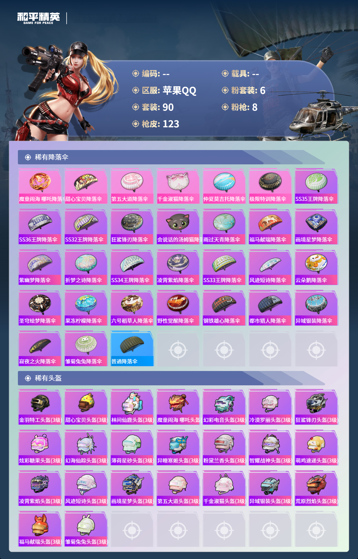 【38稀有降落伞】SS35王牌降落伞,SS36王牌降落伞,幻彩电音降落伞,冷漠罗丽降落伞,SS32王牌降落伞,炫彩糖果降落伞,狂鲨锋刃降落伞,会说话的汤姆猫降落伞,雨过天青降落伞,福马献瑞降落伞,画境星梦降落伞,紫幽梦降落伞,桃源时光降落伞,折梦之诗降落伞,SS34王牌降落伞,喜羊羊与灰太狼降落伞,辉羽雀灵降落伞,异瞳寒姬降落伞,凌霄紫焰降落伞,SS33王牌降落伞,风迹短诗降落伞,云朵鹅降落伞,圣穹绘梦降落伞,果冻柠檬降落伞,六号稻草人降落伞,野性觉醒降落伞,魔童闹海,哪吒降落伞,甜心宝贝降落伞,第五大道降落伞,钢铁雄心降落伞,都市猎人降落伞,普通降落伞,千金淑猫降落伞,异域银装降落伞,寂夜之火降落伞,仲夏莫吉托降落伞,雏菊兔兔降落伞,极限特训降落伞