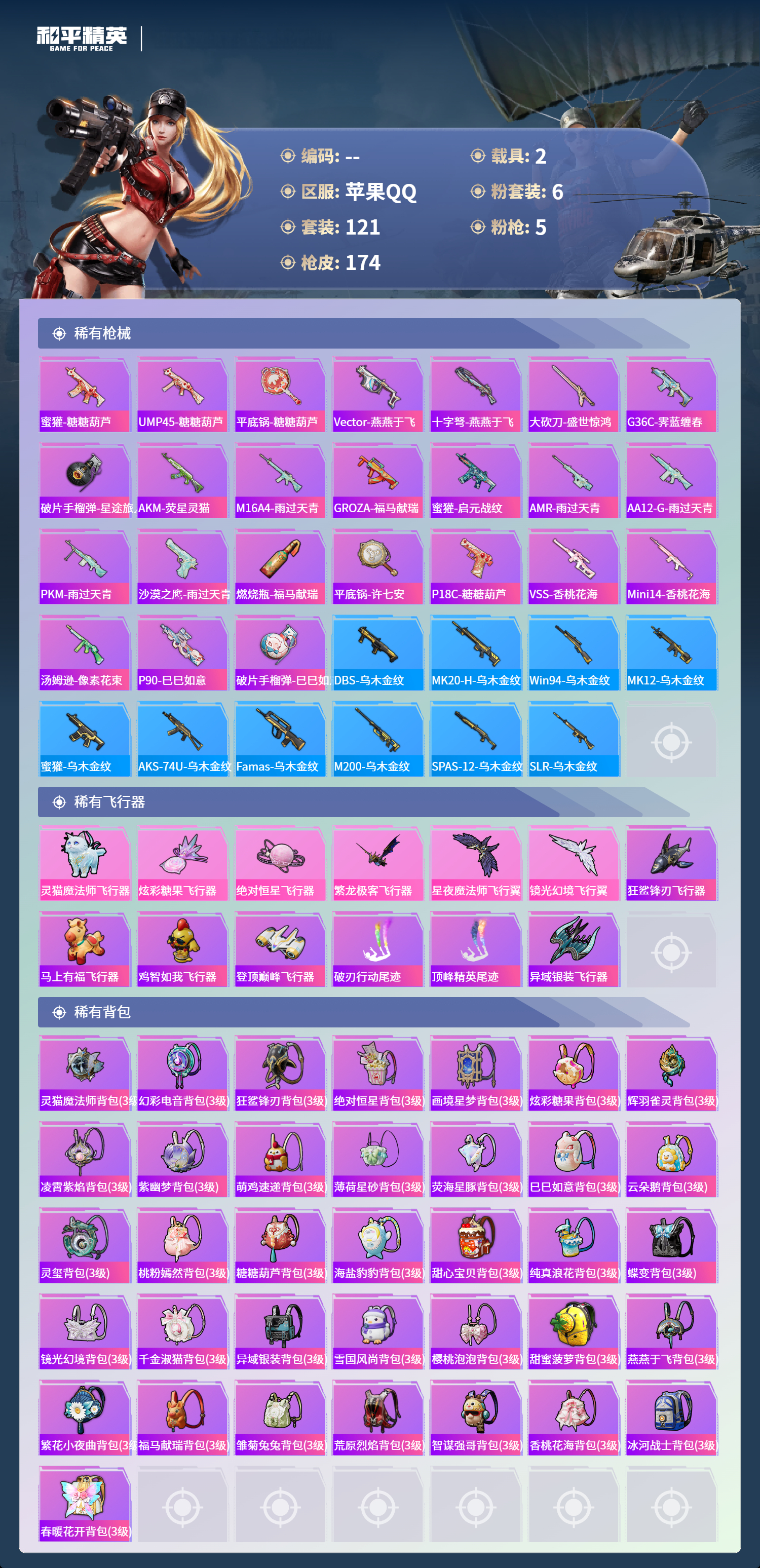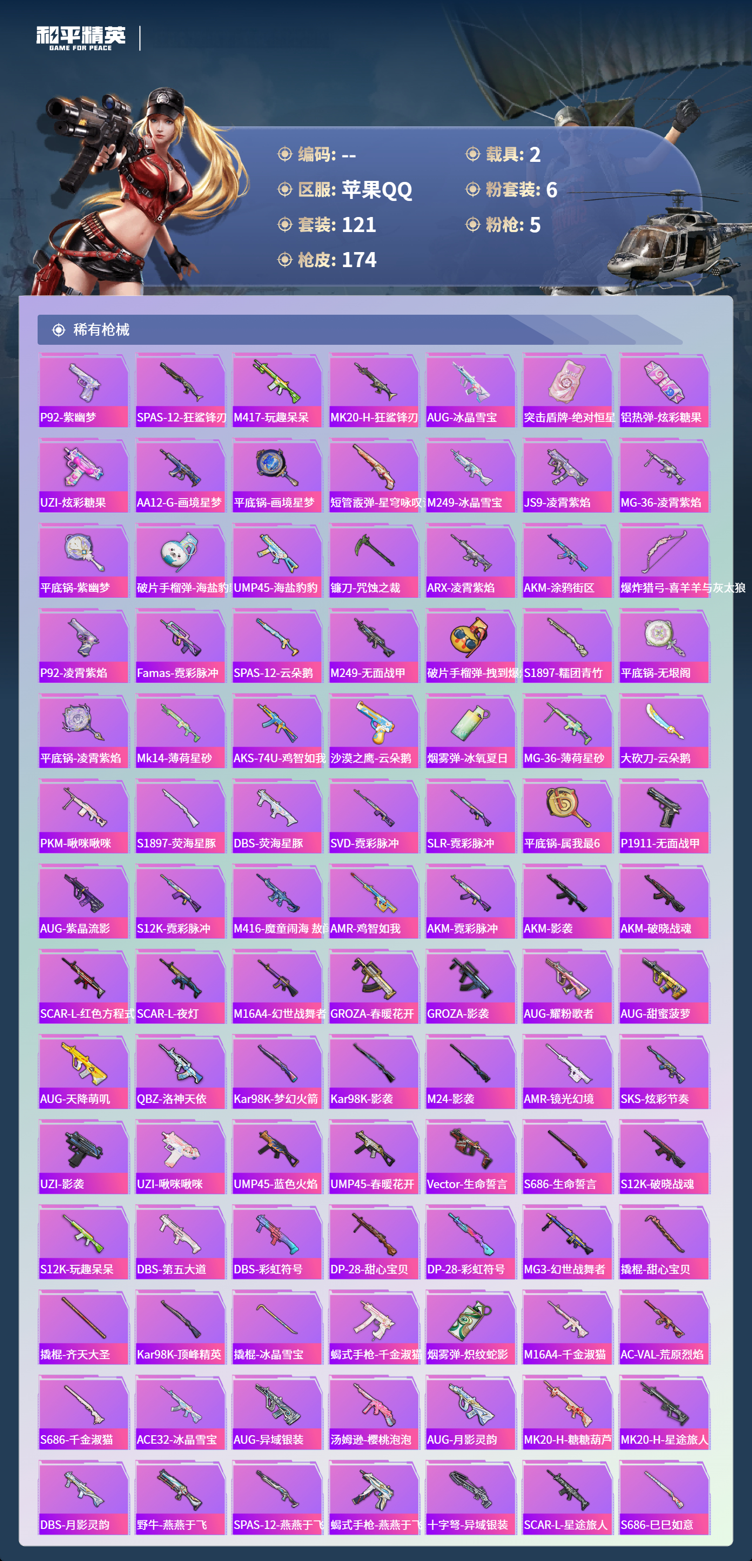 【174稀有枪械】P90-魔童闹海,敖丙/3级,M416-风花雪月/7级,Kar98K-巳巳如意/5级,Mk14-福马献瑞/5级,DP-28-豹影疾电/5级,QBZ-纯真浪花,AWM-纯真浪花,汤姆逊-纯真浪花,DBS-乌木金纹,AA12-G-纯真浪花,平底锅-纯真浪花,P1911-创世·救赎,蝎式手枪-奶油梦幻熊,S1897-精灵梦叶罗丽,平底锅-精灵梦叶罗丽,GROZA-海盐豹豹,野牛-雏菊兔兔,Mk14-冰河战士,平底锅-雏菊兔兔,M762-雏菊兔兔,Mini14-雏菊兔兔,R1895-雏菊兔兔,平底锅-魔法神域,M416-极冰使者,M249-金丰海韵,UZI-冰河战士,M16A4-冰河战士,MK20-H-乌木金纹,Win94-乌木金纹,野牛-魔童闹海,敖闰,MK12-乌木金纹,F57-魔童闹海,敖闰,SVD-冷漠罗丽,破片手榴弹-爆破雪人,AKM-灵猫魔法师,PKM-紫幽梦,撬棍-灵猫魔法师,MG3-霓彩脉冲,R45-幻彩电音,ACE32-画境星梦,M1加兰德-画境星梦,MP5K-画境星梦,Mk14-紫幽梦,蜜獾-乌木金纹,M762-云朵鹅,S1897-紫幽梦,SVD-云朵鹅,P92-紫幽梦,SPAS-12-狂鲨锋刃,M417-玩趣呆呆,MK20-H-狂鲨锋刃,AUG-冰晶雪宝,突击盾牌-绝对恒星,铝热弹-炫彩糖果,UZI-炫彩糖果,AA12-G-画境星梦,平底锅-画境星梦,短管霰弹-星穹咏叹调,M249-冰晶雪宝,JS9-凌霄紫焰,MG-36-凌霄紫焰,平底锅-紫幽梦,破片手榴弹-海盐豹豹,UMP45-海盐豹豹,镰刀-咒蚀之裁,ARX-凌霄紫焰,AKS-74U-乌木金纹,AKM-涂鸦街区,爆炸猎弓-喜羊羊与灰太狼,P92-凌霄紫焰,Famas-乌木金纹,Famas-霓彩脉冲,SPAS-12-云朵鹅,M249-无面战甲,破片手榴弹-拽到爆炸,S1897-糯团青竹,平底锅-无垠阁,平底锅-凌霄紫焰,Mk14-薄荷星砂,AKS-74U-鸡智如我,沙漠之鹰-云朵鹅,烟雾弹-冰氧夏日,MG-36-薄荷星砂,大砍刀-云朵鹅,PKM-啾咪啾咪,S1897-荧海星豚,DBS-荧海星豚,SVD-霓彩脉冲,SLR-霓彩脉冲,平底锅-属我最6,P1911-无面战甲,AUG-紫晶流影,S12K-霓彩脉冲,M416-魔童闹海,敖闰,AMR-鸡智如我,AKM-霓彩脉冲,AKM-影袭,AKM-破晓战魂,SCAR-L-红色方程式,SCAR-L-夜灯,M16A4-幻世战舞者,GROZA-春暖花开,GROZA-影袭,AUG-耀粉歌者,AUG-甜蜜菠萝,AUG-天降萌叽,QBZ-洛神天依,Kar98K-梦幻火箭,Kar98K-影袭,M24-影袭,AMR-镜光幻境,SKS-炫彩节奏,UZI-影袭,UZI-啾咪啾咪,UMP45-蓝色火焰,UMP45-春暖花开,Vector-生命誓言,S686-生命誓言,S12K-破晓战魂,S12K-玩趣呆呆,DBS-第五大道,DBS-彩虹符号,DP-28-甜心宝贝,DP-28-彩虹符号,MG3-幻世战舞者,撬棍-甜心宝贝,撬棍-齐天大圣,Kar98K-顶峰精英,撬棍-冰晶雪宝,蝎式手枪-千金淑猫,烟雾弹-炽纹蛇影,M16A4-千金淑猫,AC-VAL-荒原烈焰,S686-千金淑猫,ACE32-冰晶雪宝,AUG-异域银装,汤姆逊-樱桃泡泡,AUG-月影灵韵,MK20-H-糖糖葫芦,MK20-H-星途旅人,DBS-月影灵韵,野牛-燕燕于飞,M200-乌木金纹,SPAS-12-燕燕于飞,蝎式手枪-燕燕于飞,十字弩-异域银装,SCAR-L-星途旅人,S686-巳巳如意,蜜獾-糖糖葫芦,UMP45-糖糖葫芦,SPAS-12-乌木金纹,平底锅-糖糖葫芦,Vector-燕燕于飞,十字弩-燕燕于飞,大砍刀-盛世惊鸿,G36C-霁蓝缠春,破片手榴弹-星途旅人,AKM-荧星灵猫,M16A4-雨过天青,GROZA-福马献瑞,蜜獾-启元战纹,AMR-雨过天青,SLR-乌木金纹,AA12-G-雨过天青,PKM-雨过天青,沙漠之鹰-雨过天青,燃烧瓶-福马献瑞,平底锅-许七安,P18C-糖糖葫芦,VSS-香桃花海,Mini14-香桃花海,汤姆逊-像素花束,P90-巳巳如意,破片手榴弹-巳巳如意
