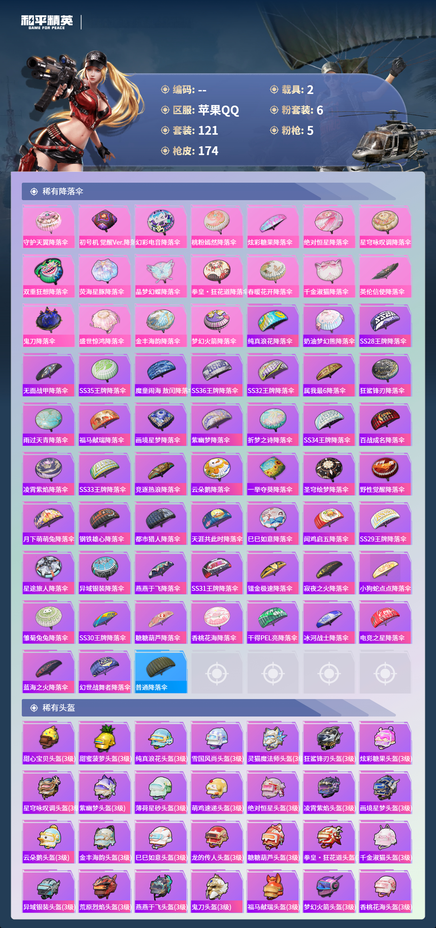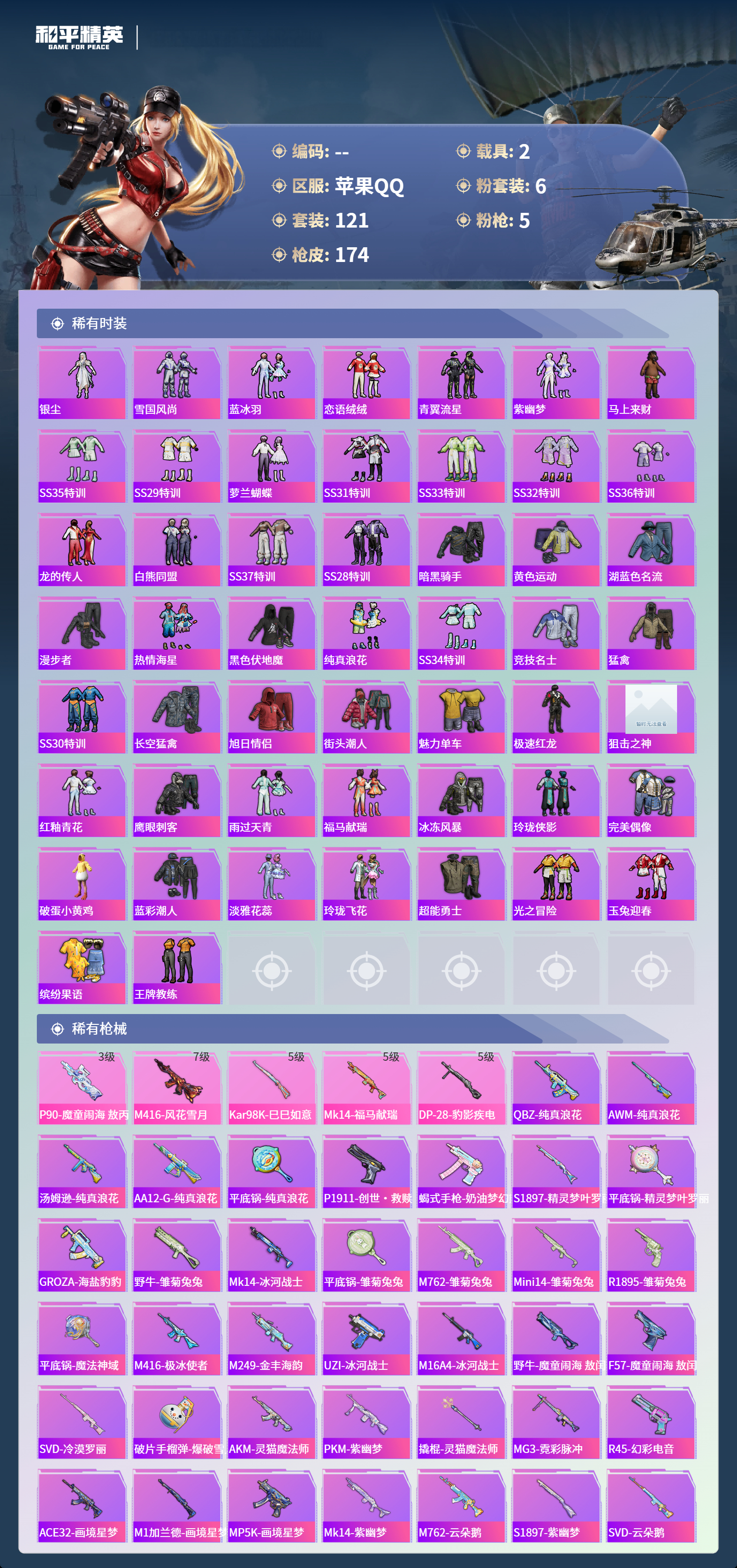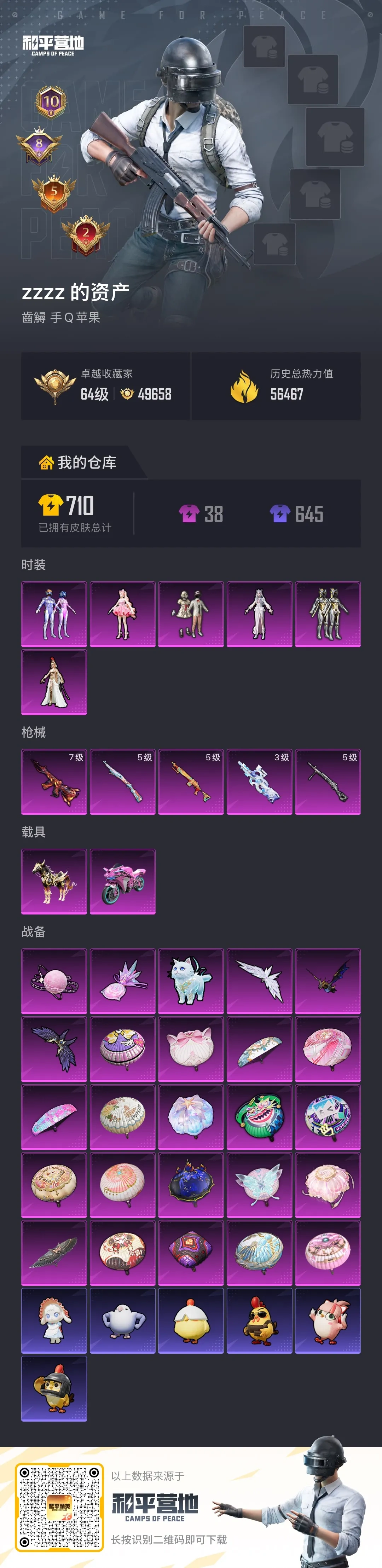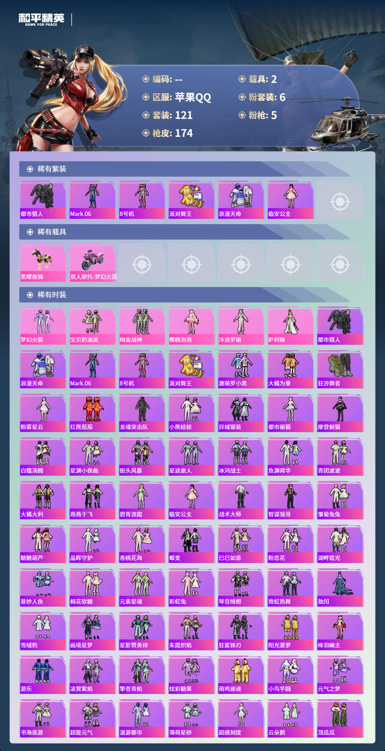 PX_2548633-苹果手Q-10王牌印记-6粉装-5特效枪-2载具-56467热力值-121套装-174枪皮-8卓越印记-5传奇印记