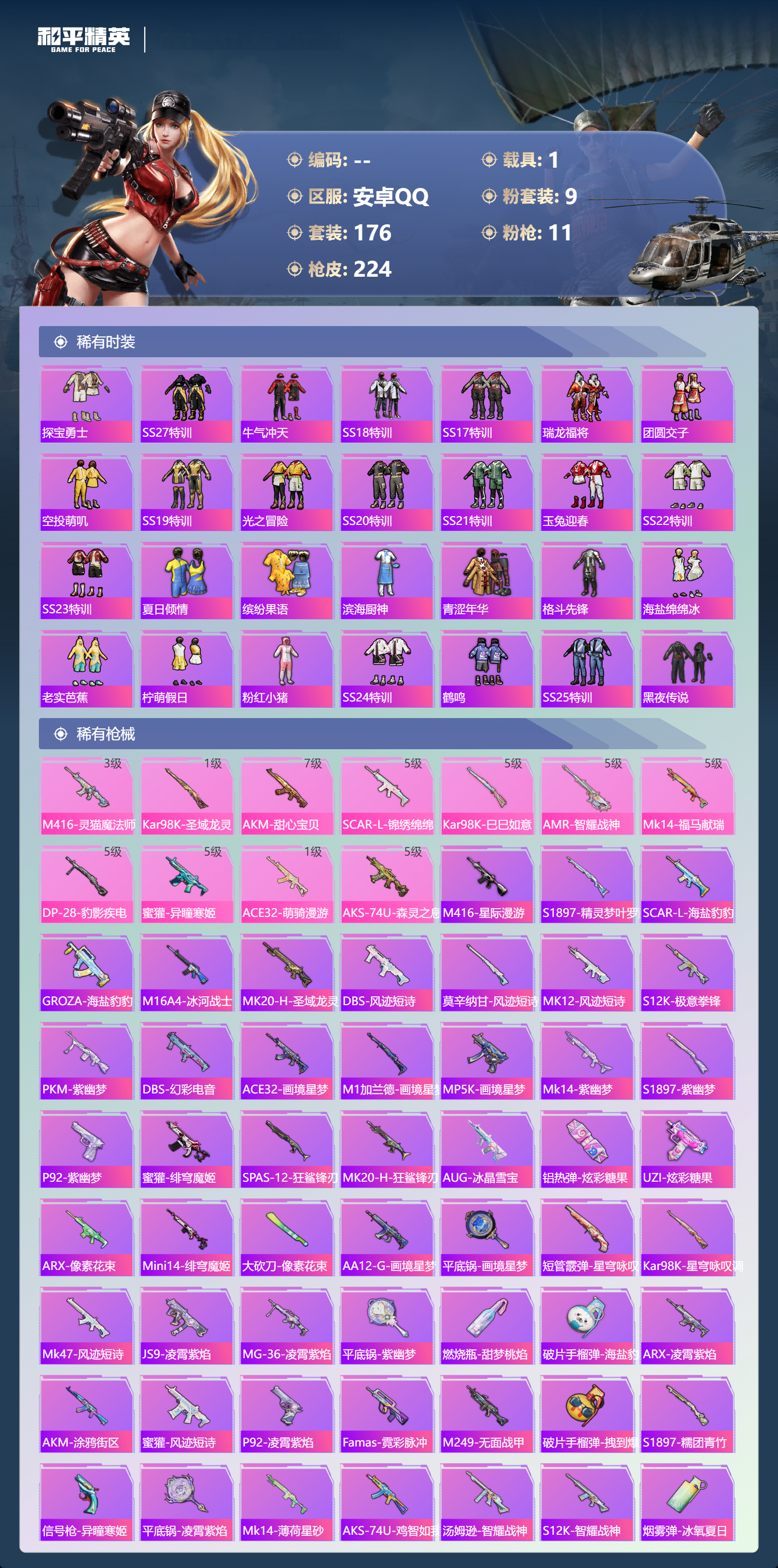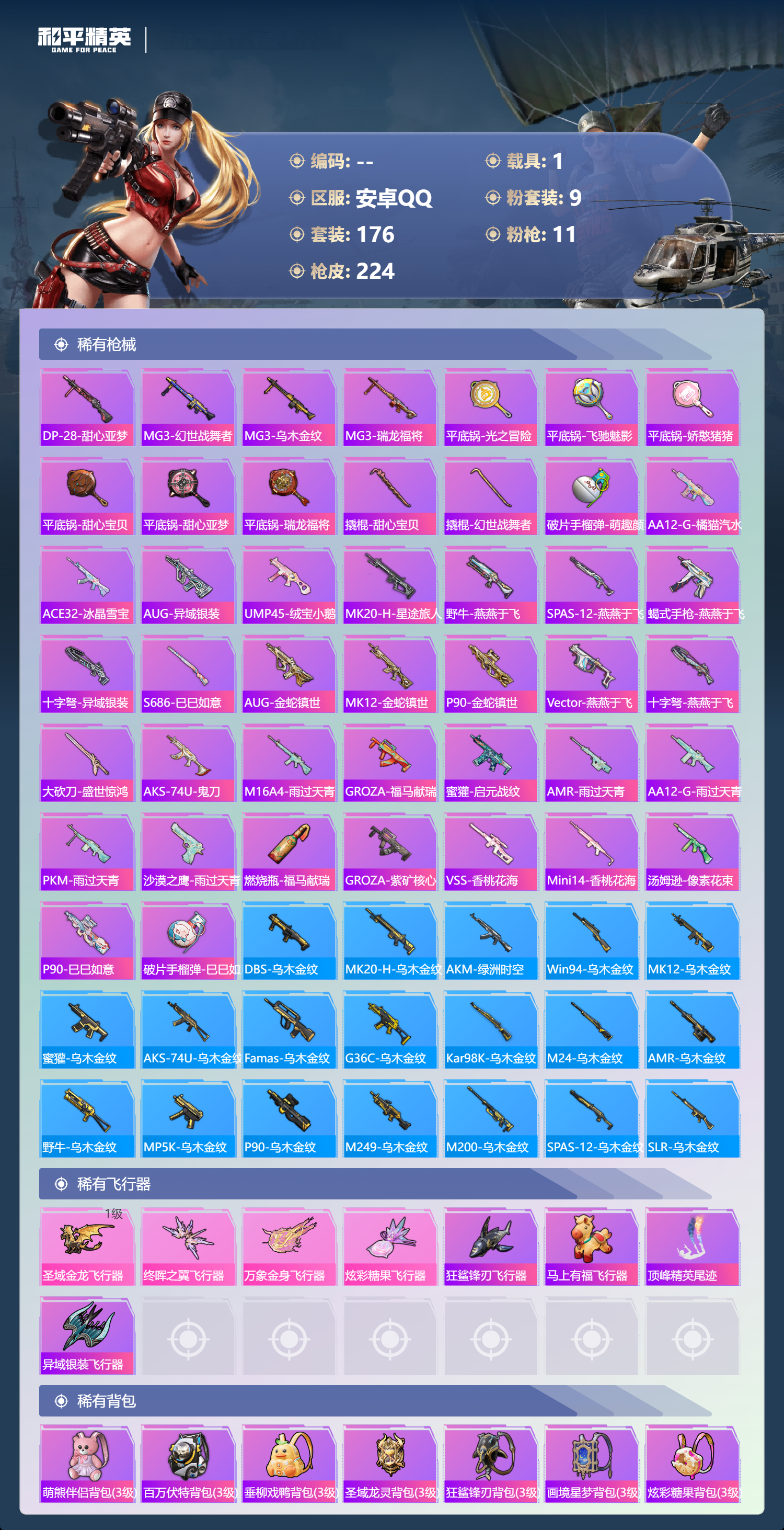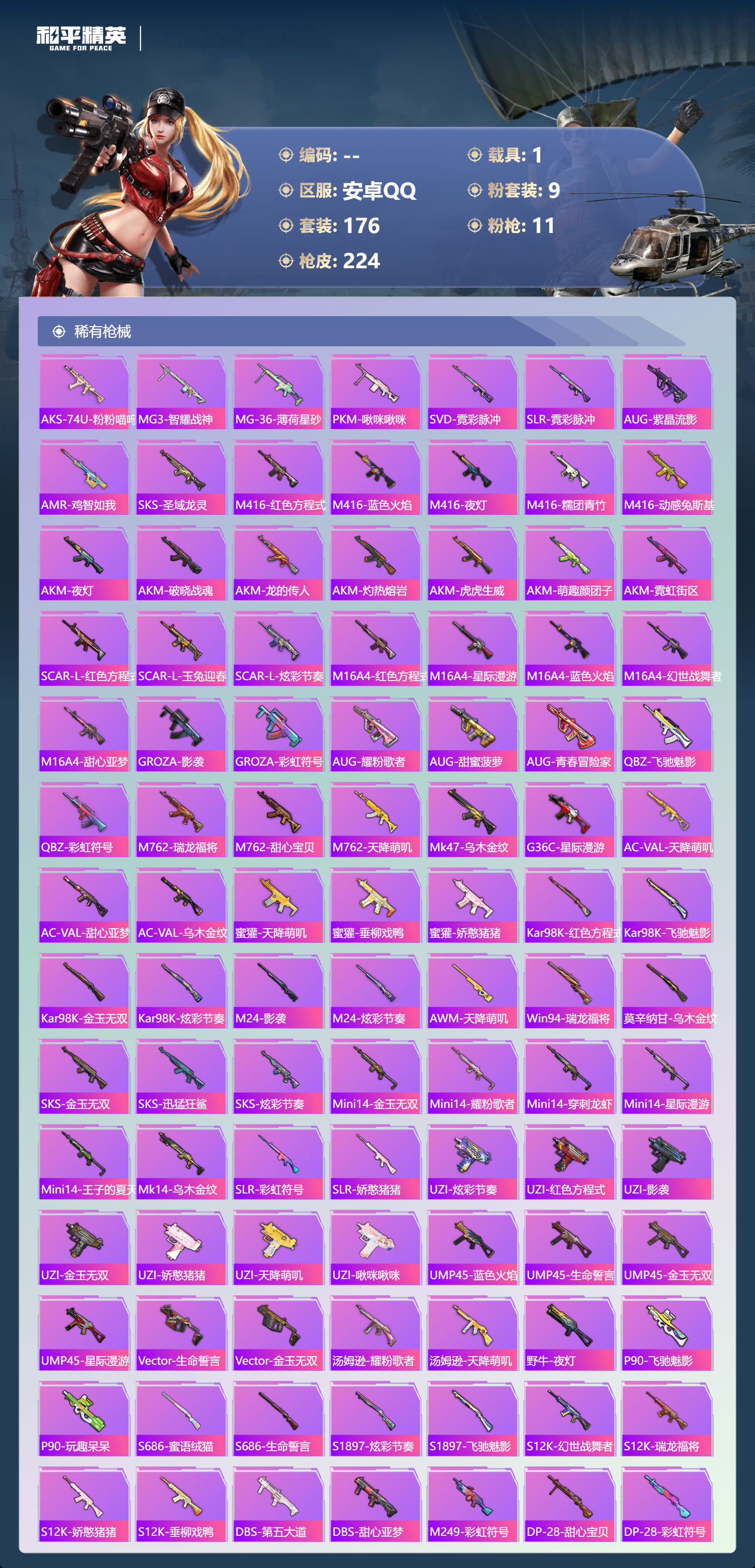 【224稀有枪械】M416-星际漫游,M416-灵猫魔法师/3级,Kar98K-圣域龙灵/1级,AKM-甜心宝贝/7级,SCAR-L-锦绣绵绵/5级,Kar98K-巳巳如意/5级,AMR-智耀战神/5级,Mk14-福马献瑞/5级,DP-28-豹影疾电/5级,蜜獾-异瞳寒姬/5级,ACE32-萌骑漫游/1级,AKS-74U-森灵之息/5级,DBS-乌木金纹,S1897-精灵梦叶罗丽,SCAR-L-海盐豹豹,GROZA-海盐豹豹,M16A4-冰河战士,MK20-H-乌木金纹,MK20-H-圣域龙灵,DBS-风迹短诗,莫辛纳甘-风迹短诗,AKM-绿洲时空,Win94-乌木金纹,MK12-风迹短诗,MK12-乌木金纹,S12K-极意拳锋,PKM-紫幽梦,DBS-幻彩电音,ACE32-画境星梦,M1加兰德-画境星梦,MP5K-画境星梦,Mk14-紫幽梦,蜜獾-乌木金纹,S1897-紫幽梦,P92-紫幽梦,蜜獾-绯穹魔姬,SPAS-12-狂鲨锋刃,MK20-H-狂鲨锋刃,AUG-冰晶雪宝,铝热弹-炫彩糖果,UZI-炫彩糖果,ARX-像素花束,Mini14-绯穹魔姬,大砍刀-像素花束,AA12-G-画境星梦,平底锅-画境星梦,短管霰弹-星穹咏叹调,Kar98K-星穹咏叹调,Mk47-风迹短诗,JS9-凌霄紫焰,MG-36-凌霄紫焰,平底锅-紫幽梦,燃烧瓶-甜梦桃焰,破片手榴弹-海盐豹豹,ARX-凌霄紫焰,AKS-74U-乌木金纹,AKM-涂鸦街区,蜜獾-风迹短诗,P92-凌霄紫焰,Famas-乌木金纹,Famas-霓彩脉冲,M249-无面战甲,破片手榴弹-拽到爆炸,S1897-糯团青竹,信号枪-异瞳寒姬,平底锅-凌霄紫焰,Mk14-薄荷星砂,AKS-74U-鸡智如我,汤姆逊-智耀战神,S12K-智耀战神,烟雾弹-冰氧夏日,AKS-74U-粉粉喵呜,MG3-智耀战神,MG-36-薄荷星砂,PKM-啾咪啾咪,SVD-霓彩脉冲,SLR-霓彩脉冲,AUG-紫晶流影,AMR-鸡智如我,SKS-圣域龙灵,M416-红色方程式,M416-蓝色火焰,M416-夜灯,M416-糯团青竹,M416-动感兔斯基,AKM-夜灯,AKM-破晓战魂,AKM-龙的传人,AKM-灼热熔岩,AKM-虎虎生威,AKM-萌趣颜团子,AKM-霓虹街区,SCAR-L-红色方程式,SCAR-L-玉兔迎春,SCAR-L-炫彩节奏,M16A4-红色方程式,M16A4-星际漫游,M16A4-蓝色火焰,M16A4-幻世战舞者,M16A4-甜心亚梦,GROZA-影袭,GROZA-彩虹符号,AUG-耀粉歌者,AUG-甜蜜菠萝,AUG-青春冒险家,QBZ-飞驰魅影,QBZ-彩虹符号,M762-瑞龙福将,M762-甜心宝贝,M762-天降萌叽,Mk47-乌木金纹,G36C-乌木金纹,G36C-星际漫游,AC-VAL-天降萌叽,AC-VAL-甜心亚梦,AC-VAL-乌木金纹,蜜獾-天降萌叽,蜜獾-垂柳戏鸭,蜜獾-娇憨猪猪,Kar98K-乌木金纹,Kar98K-红色方程式,Kar98K-飞驰魅影,Kar98K-金玉无双,Kar98K-炫彩节奏,M24-乌木金纹,M24-影袭,M24-炫彩节奏,AWM-天降萌叽,Win94-瑞龙福将,莫辛纳甘-乌木金纹,AMR-乌木金纹,SKS-金玉无双,SKS-迅猛狂鲨,SKS-炫彩节奏,Mini14-金玉无双,Mini14-耀粉歌者,Mini14-穿刺龙虾,Mini14-星际漫游,Mini14-王子的夏天,Mk14-乌木金纹,SLR-彩虹符号,SLR-娇憨猪猪,UZI-炫彩节奏,UZI-红色方程式,UZI-影袭,UZI-金玉无双,UZI-娇憨猪猪,UZI-天降萌叽,UZI-啾咪啾咪,UMP45-蓝色火焰,UMP45-生命誓言,UMP45-金玉无双,UMP45-星际漫游,Vector-生命誓言,Vector-金玉无双,汤姆逊-耀粉歌者,汤姆逊-天降萌叽,野牛-乌木金纹,野牛-夜灯,MP5K-乌木金纹,P90-乌木金纹,P90-飞驰魅影,P90-玩趣呆呆,S686-蜜语绒猫,S686-生命誓言,S1897-炫彩节奏,S1897-飞驰魅影,S12K-幻世战舞者,S12K-瑞龙福将,S12K-娇憨猪猪,S12K-垂柳戏鸭,DBS-第五大道,DBS-甜心亚梦,M249-彩虹符号,M249-乌木金纹,DP-28-甜心宝贝,DP-28-彩虹符号,DP-28-甜心亚梦,MG3-幻世战舞者,MG3-乌木金纹,MG3-瑞龙福将,平底锅-光之冒险,平底锅-飞驰魅影,平底锅-娇憨猪猪,平底锅-甜心宝贝,平底锅-甜心亚梦,平底锅-瑞龙福将,撬棍-甜心宝贝,撬棍-幻世战舞者,破片手榴弹-萌趣颜团子,AA12-G-橘猫汽水,ACE32-冰晶雪宝,AUG-异域银装,UMP45-绒宝小鹅,MK20-H-星途旅人,野牛-燕燕于飞,M200-乌木金纹,SPAS-12-燕燕于飞,蝎式手枪-燕燕于飞,十字弩-异域银装,S686-巳巳如意,AUG-金蛇镇世,MK12-金蛇镇世,P90-金蛇镇世,SPAS-12-乌木金纹,Vector-燕燕于飞,十字弩-燕燕于飞,大砍刀-盛世惊鸿,AKS-74U-鬼刀,M16A4-雨过天青,GROZA-福马献瑞,蜜獾-启元战纹,AMR-雨过天青,SLR-乌木金纹,AA12-G-雨过天青,PKM-雨过天青,沙漠之鹰-雨过天青,燃烧瓶-福马献瑞,GROZA-紫矿核心,VSS-香桃花海,Mini14-香桃花海,汤姆逊-像素花束,P90-巳巳如意,破片手榴弹-巳巳如意
