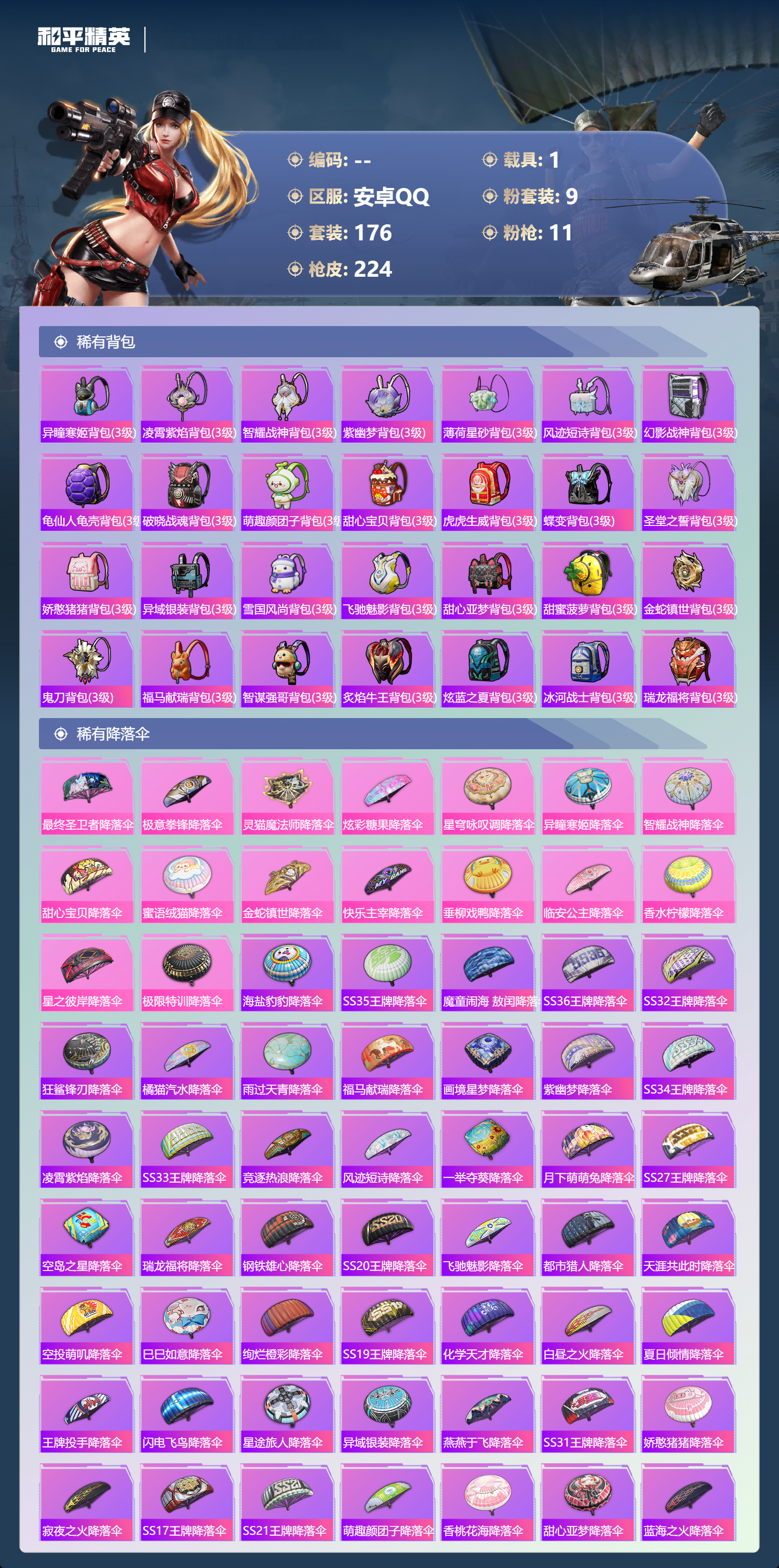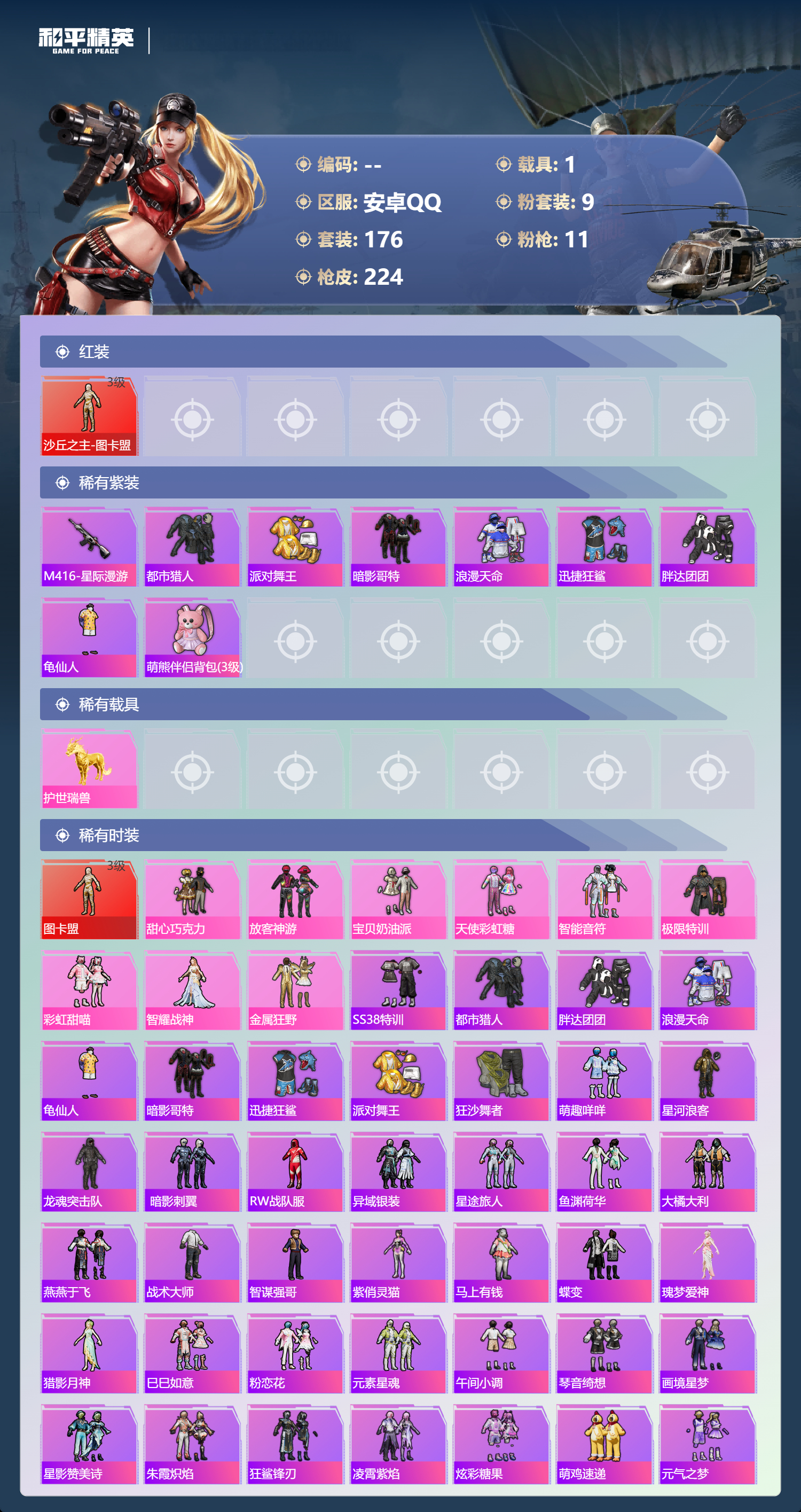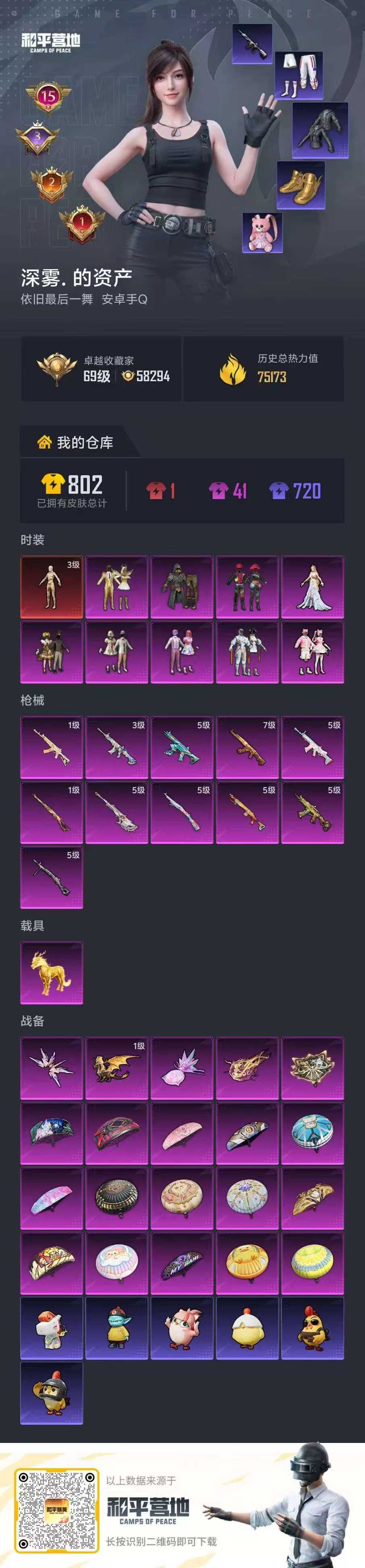 PX_2556572-,安卓手Q-15王牌印记-有战神框-1红装-9粉装-11特效枪-1载具-75188热力值-176套装-224枪皮-3卓越印记-2传奇印记