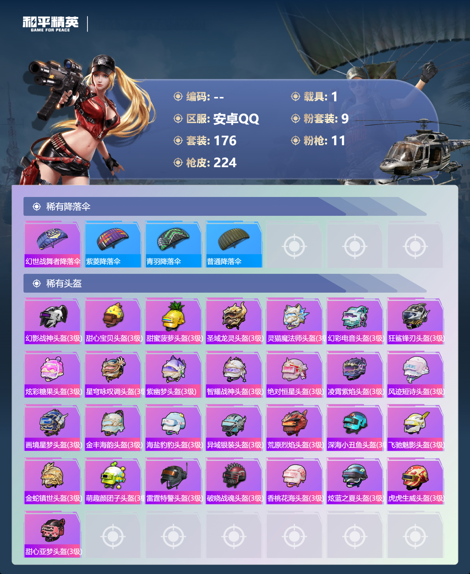 【29稀有头盔】幻影战神头盔(3级),甜心宝贝头盔(3级),甜蜜菠萝头盔(3级),圣域龙灵头盔(3级),灵猫魔法师头盔(3级),幻彩电音头盔(3级),狂鲨锋刃头盔(3级),炫彩糖果头盔(3级),星穹咏叹调头盔(3级),紫幽梦头盔(3级),智耀战神头盔(3级),绝对恒星头盔(3级),凌霄紫焰头盔(3级),风迹短诗头盔(3级),画境星梦头盔(3级),金丰海韵头盔(3级),海盐豹豹头盔(3级),异域银装头盔(3级),荒原烈焰头盔(3级),深海小丑鱼头盔(3级),飞驰魅影头盔(3级),金蛇镇世头盔(3级),萌趣颜团子头盔(3级),雷霆特警头盔(3级),破晓战魂头盔(3级),香桃花海头盔(3级),炫蓝之夏头盔(3级),虎虎生威头盔(3级),甜心亚梦头盔(3级)