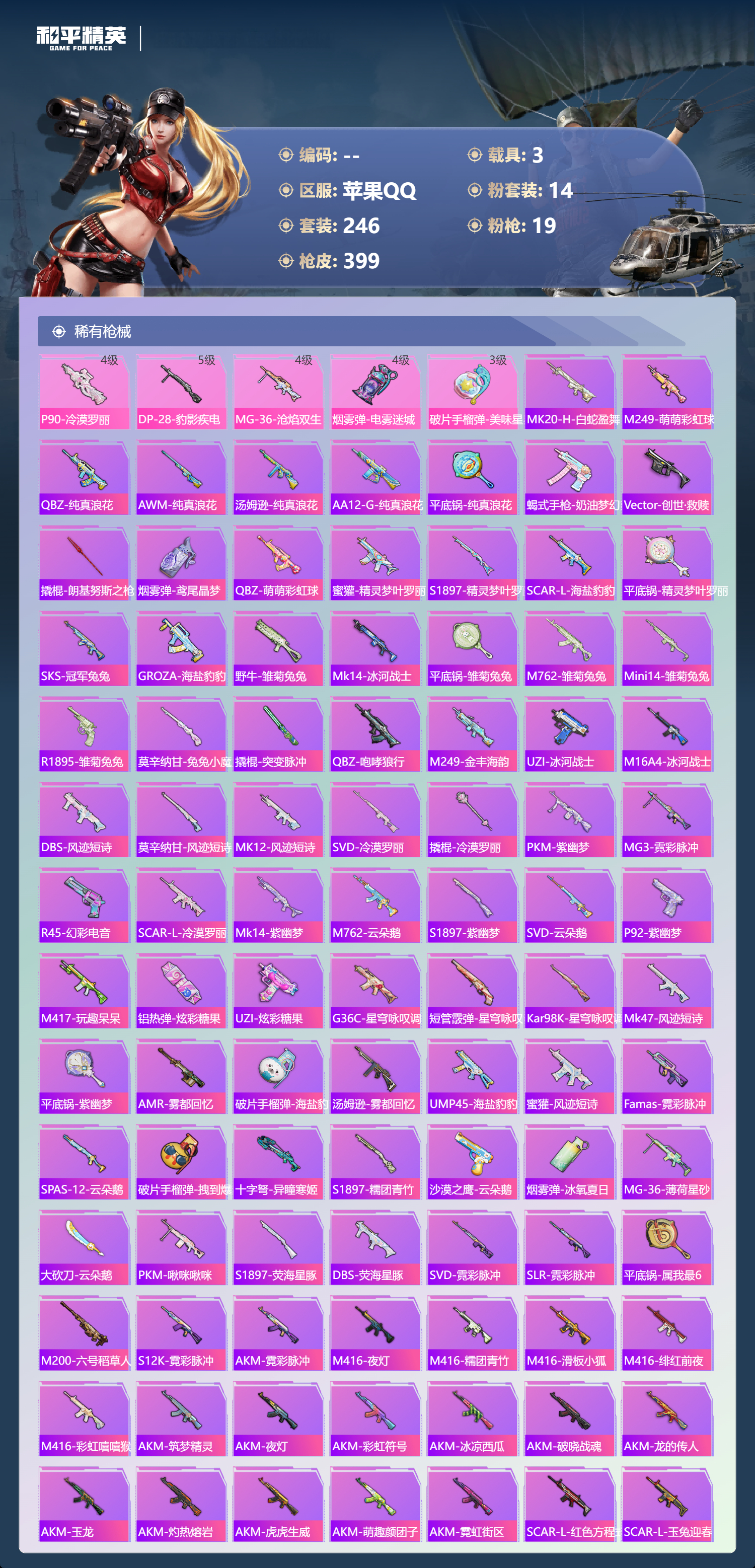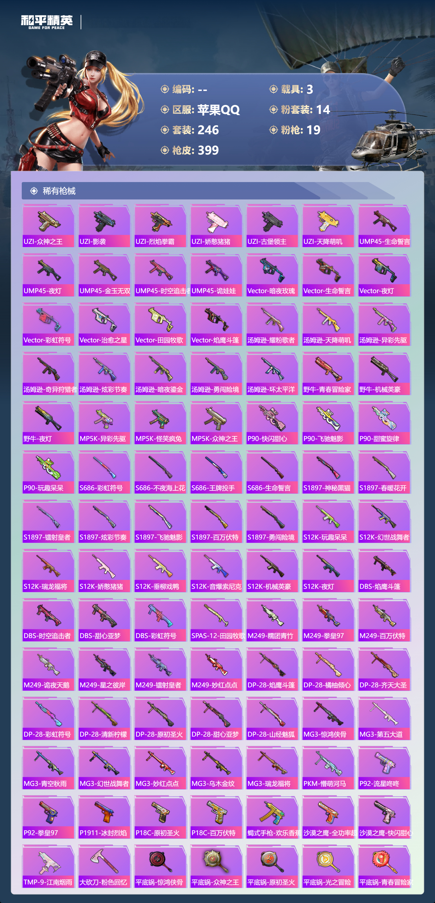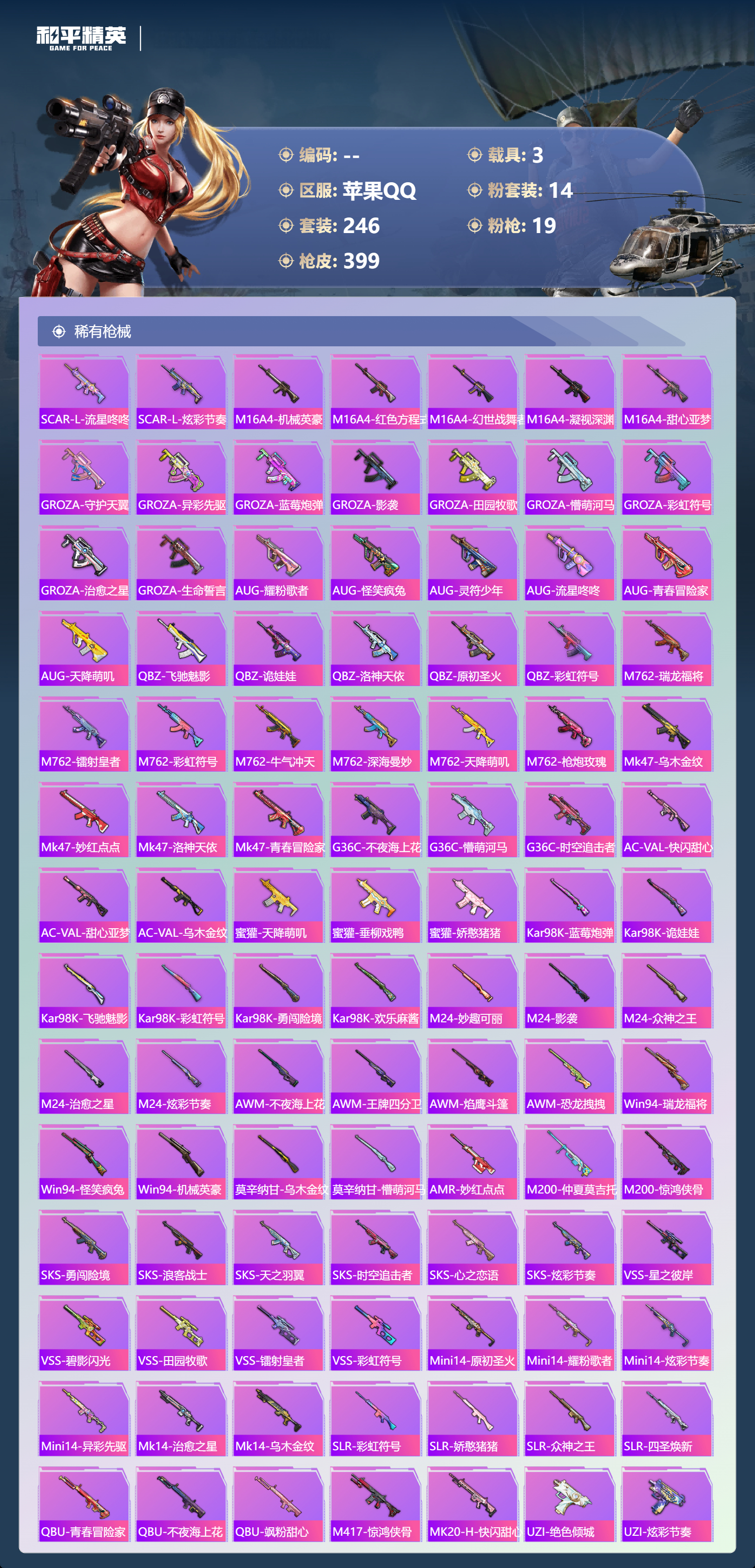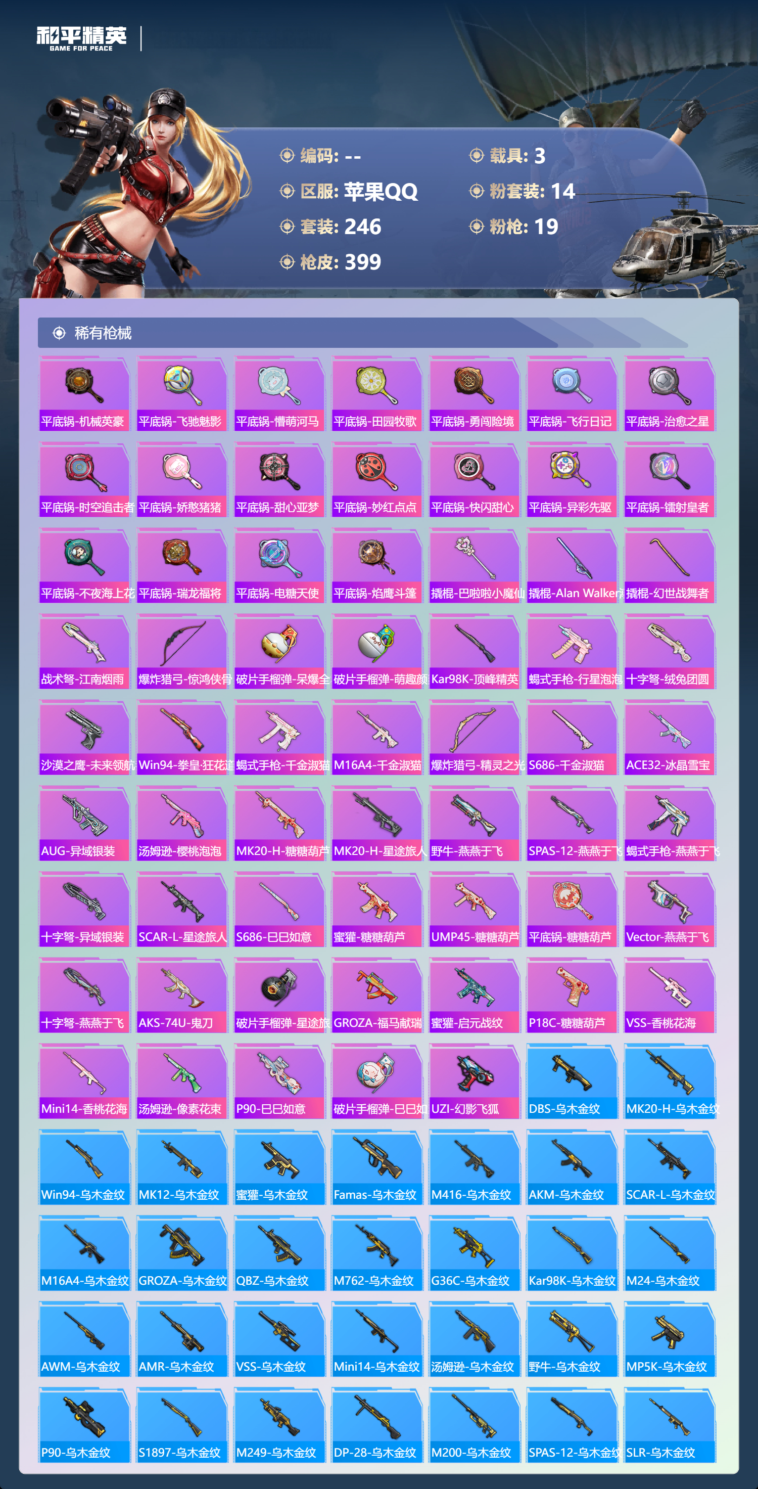 【399稀有枪械】AKM-魔法神域/3级,M416-风花雪月/5级,M416-电玩时刻/5级,SCAR-L-青春物语/5级,SCAR-L-锦绣绵绵/5级,M16A4-垂柳戏鸭/2级,GROZA-镜光银凌/5级,AUG-圣斗士星矢/4级,M762-青锋波束/5级,M762-电糖天使/4级,Kar98K-巳巳如意/5级,Mk14-精灵梦叶罗丽/4级,UMP45-量子极限/5级,Vector-飒粉甜心/5级,P90-冷漠罗丽/4级,DP-28-豹影疾电/5级,MG-36-沧焰双生/4级,烟雾弹-电雾迷城/4级,破片手榴弹-美味星星糖/3级,MK20-H-白蛇盈舞,M249-萌萌彩虹球,QBZ-纯真浪花,AWM-纯真浪花,汤姆逊-纯真浪花,DBS-乌木金纹,AA12-G-纯真浪花,平底锅-纯真浪花,蝎式手枪-奶油梦幻熊,Vector-创世·救赎,撬棍-朗基努斯之枪,烟雾弹-鸢尾晶梦,QBZ-萌萌彩虹球,蜜獾-精灵梦叶罗丽,S1897-精灵梦叶罗丽,SCAR-L-海盐豹豹,平底锅-精灵梦叶罗丽,SKS-冠军兔兔,GROZA-海盐豹豹,野牛-雏菊兔兔,Mk14-冰河战士,平底锅-雏菊兔兔,M762-雏菊兔兔,Mini14-雏菊兔兔,R1895-雏菊兔兔,莫辛纳甘-兔兔小魔女,撬棍-突变脉冲,QBZ-咆哮狼行,M249-金丰海韵,UZI-冰河战士,M16A4-冰河战士,MK20-H-乌木金纹,DBS-风迹短诗,莫辛纳甘-风迹短诗,Win94-乌木金纹,MK12-风迹短诗,MK12-乌木金纹,SVD-冷漠罗丽,撬棍-冷漠罗丽,PKM-紫幽梦,MG3-霓彩脉冲,R45-幻彩电音,SCAR-L-冷漠罗丽,Mk14-紫幽梦,蜜獾-乌木金纹,M762-云朵鹅,S1897-紫幽梦,SVD-云朵鹅,P92-紫幽梦,M417-玩趣呆呆,铝热弹-炫彩糖果,UZI-炫彩糖果,G36C-星穹咏叹调,短管霰弹-星穹咏叹调,Kar98K-星穹咏叹调,Mk47-风迹短诗,平底锅-紫幽梦,AMR-雾都回忆,破片手榴弹-海盐豹豹,汤姆逊-雾都回忆,UMP45-海盐豹豹,蜜獾-风迹短诗,Famas-乌木金纹,Famas-霓彩脉冲,SPAS-12-云朵鹅,破片手榴弹-拽到爆炸,十字弩-异瞳寒姬,S1897-糯团青竹,沙漠之鹰-云朵鹅,烟雾弹-冰氧夏日,MG-36-薄荷星砂,大砍刀-云朵鹅,PKM-啾咪啾咪,S1897-荧海星豚,DBS-荧海星豚,SVD-霓彩脉冲,SLR-霓彩脉冲,平底锅-属我最6,M200-六号稻草人,S12K-霓彩脉冲,AKM-霓彩脉冲,M416-乌木金纹,M416-夜灯,M416-糯团青竹,M416-滑板小狐,M416-绯红前夜,M416-彩虹嘻嘻猴,AKM-筑梦精灵,AKM-夜灯,AKM-乌木金纹,AKM-彩虹符号,AKM-冰凉西瓜,AKM-破晓战魂,AKM-龙的传人,AKM-玉龙,AKM-灼热熔岩,AKM-虎虎生威,AKM-萌趣颜团子,AKM-霓虹街区,SCAR-L-红色方程式,SCAR-L-玉兔迎春,SCAR-L-乌木金纹,SCAR-L-流星咚咚,SCAR-L-炫彩节奏,M16A4-机械英豪,M16A4-红色方程式,M16A4-幻世战舞者,M16A4-凝视深渊,M16A4-甜心亚梦,M16A4-乌木金纹,GROZA-守护天翼,GROZA-乌木金纹,GROZA-异彩先驱,GROZA-蓝莓炮弹,GROZA-影袭,GROZA-田园牧歌,GROZA-懵萌河马,GROZA-彩虹符号,GROZA-治愈之星,GROZA-生命誓言,AUG-耀粉歌者,AUG-怪笑疯兔,AUG-灵符少年,AUG-流星咚咚,AUG-青春冒险家,AUG-天降萌叽,QBZ-飞驰魅影,QBZ-诡娃娃,QBZ-洛神天依,QBZ-原初圣火,QBZ-乌木金纹,QBZ-彩虹符号,M762-瑞龙福将,M762-镭射皇者,M762-乌木金纹,M762-彩虹符号,M762-牛气冲天,M762-深海曼妙,M762-天降萌叽,M762-枪炮玫瑰,Mk47-乌木金纹,Mk47-妙红点点,Mk47-洛神天依,Mk47-青春冒险家,G36C-不夜海上花,G36C-乌木金纹,G36C-懵萌河马,G36C-时空追击者,AC-VAL-快闪甜心,AC-VAL-甜心亚梦,AC-VAL-乌木金纹,蜜獾-天降萌叽,蜜獾-垂柳戏鸭,蜜獾-娇憨猪猪,Kar98K-乌木金纹,Kar98K-蓝莓炮弹,Kar98K-诡娃娃,Kar98K-飞驰魅影,Kar98K-彩虹符号,Kar98K-勇闯险境,Kar98K-欢乐麻酱,M24-乌木金纹,M24-妙趣可丽,M24-影袭,M24-众神之王,M24-治愈之星,M24-炫彩节奏,AWM-乌木金纹,AWM-不夜海上花,AWM-王牌四分卫,AWM-焰鹰斗篷,AWM-恐龙拽拽,Win94-瑞龙福将,Win94-怪笑疯兔,Win94-机械英豪,莫辛纳甘-乌木金纹,莫辛纳甘-懵萌河马,AMR-乌木金纹,AMR-妙红点点,M200-仲夏莫吉托,M200-惊鸿侠骨,SKS-勇闯险境,SKS-浪客战士,SKS-天之羽翼,SKS-时空追击者,SKS-心之恋语,SKS-炫彩节奏,VSS-星之彼岸,VSS-乌木金纹,VSS-碧影闪光,VSS-田园牧歌,VSS-镭射皇者,VSS-彩虹符号,Mini14-原初圣火,Mini14-耀粉歌者,Mini14-乌木金纹,Mini14-炫彩节奏,Mini14-异彩先驱,Mk14-治愈之星,Mk14-乌木金纹,SLR-彩虹符号,SLR-娇憨猪猪,SLR-众神之王,SLR-四圣焕新,QBU-青春冒险家,QBU-不夜海上花,QBU-飒粉甜心,M417-惊鸿侠骨,MK20-H-快闪甜心,UZI-绝色倾城,UZI-炫彩节奏,UZI-众神之王,UZI-影袭,UZI-烈焰拳霸,UZI-娇憨猪猪,UZI-古堡领主,UZI-天降萌叽,UMP45-生命誓言,UMP45-夜灯,UMP45-金玉无双,UMP45-时空追击者,UMP45-诡娃娃,Vector-暗夜玫瑰,Vector-生命誓言,Vector-夜灯,Vector-彩虹符号,Vector-治愈之星,Vector-田园牧歌,Vector-焰鹰斗篷,汤姆逊-耀粉歌者,汤姆逊-天降萌叽,汤姆逊-乌木金纹,汤姆逊-异彩先驱,汤姆逊-奇异狩猎者,汤姆逊-炫彩节奏,汤姆逊-暗夜鎏金,汤姆逊-勇闯险境,汤姆逊-环太平洋,野牛-乌木金纹,野牛-青春冒险家,野牛-机械英豪,野牛-夜灯,MP5K-异彩先驱,MP5K-怪笑疯兔,MP5K-众神之王,MP5K-乌木金纹,P90-乌木金纹,P90-快闪甜心,P90-飞驰魅影,P90-甜蜜旋律,P90-玩趣呆呆,S686-彩虹符号,S686-不夜海上花,S686-王牌投手,S686-生命誓言,S1897-神秘黑猫,S1897-春暖花开,S1897-镭射皇者,S1897-乌木金纹,S1897-炫彩节奏,S1897-飞驰魅影,S1897-百万伏特,S1897-勇闯险境,S12K-玩趣呆呆,S12K-幻世战舞者,S12K-瑞龙福将,S12K-娇憨猪猪,S12K-垂柳戏鸭,S12K-音爆索尼克,S12K-机械英豪,S12K-夜灯,DBS-焰鹰斗篷,DBS-时空追击者,DBS-甜心亚梦,DBS-彩虹符号,SPAS-12-田园牧歌,M249-糯团青竹,M249-拳皇97,M249-百万伏特,M249-诡夜天鹅,M249-乌木金纹,M249-星之彼岸,M249-镭射皇者,M249-妙红点点,DP-28-焰鹰斗篷,DP-28-橘柚倾心,DP-28-齐天大圣,DP-28-彩虹符号,DP-28-清新柠檬,DP-28-乌木金纹,DP-28-原初圣火,DP-28-甜