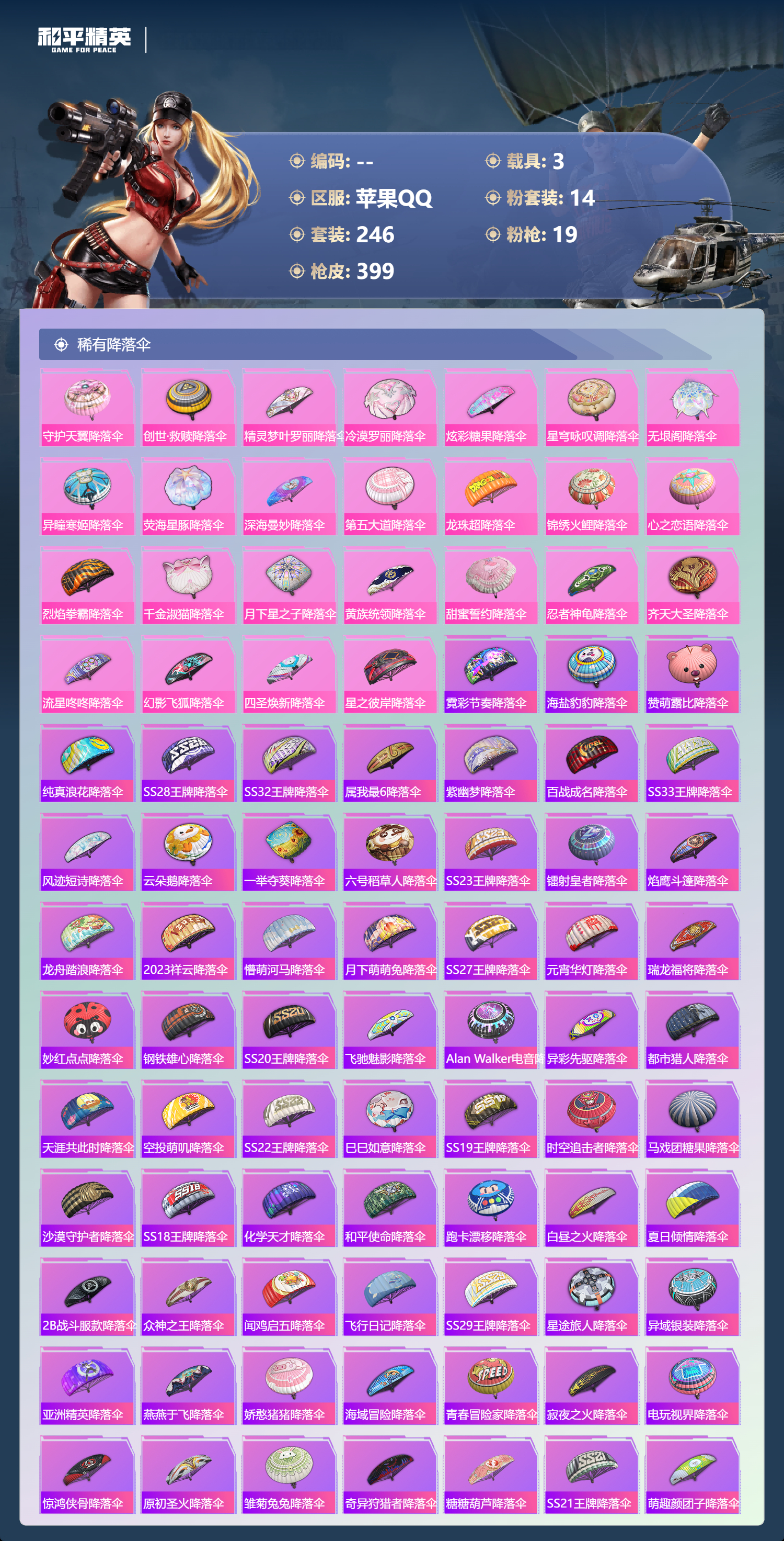 【112稀有降落伞】霓彩节奏降落伞,守护天翼降落伞,海盐豹豹降落伞,赞萌露比降落伞,纯真浪花降落伞,创世·救赎降落伞,精灵梦叶罗丽降落伞,SS28王牌降落伞,冷漠罗丽降落伞,SS32王牌降落伞,属我最6降落伞,炫彩糖果降落伞,星穹咏叹调降落伞,紫幽梦降落伞,无垠阁降落伞,百战成名降落伞,异瞳寒姬降落伞,SS33王牌降落伞,风迹短诗降落伞,云朵鹅降落伞,一举夺葵降落伞,荧海星豚降落伞,六号稻草人降落伞,SS23王牌降落伞,镭射皇者降落伞,焰鹰斗篷降落伞,深海曼妙降落伞,龙舟踏浪降落伞,2023祥云降落伞,懵萌河马降落伞,月下萌萌兔降落伞,SS27王牌降落伞,第五大道降落伞,龙珠超降落伞,锦绣火鲤降落伞,元宵华灯降落伞,紫菱降落伞,瑞龙福将降落伞,心之恋语降落伞,妙红点点降落伞,钢铁雄心降落伞,SS20王牌降落伞,蝶舞翩翩降落伞,飞驰魅影降落伞,Alan,Walker电音降落伞,异彩先驱降落伞,烈焰拳霸降落伞,都市猎人降落伞,青羽降落伞,天涯共此时降落伞,空投萌叽降落伞,SS22王牌降落伞,巳巳如意降落伞,SS19王牌降落伞,时空追击者降落伞,普通降落伞,马戏团糖果降落伞,沙漠守护者降落伞,千金淑猫降落伞,SS18王牌降落伞,化学天才降落伞,和平使命降落伞,跑卡漂移降落伞,白昼之火降落伞,夏日倾情降落伞,月下星之子降落伞,黄族统领降落伞,2B战斗服款降落伞,众神之王降落伞,迷雾突击降落伞,甜蜜誓约降落伞,闻鸡启五降落伞,飞行日记降落伞,SS29王牌降落伞,忍者神龟降落伞,星途旅人降落伞,异域银装降落伞,亚洲精英降落伞,燕燕于飞降落伞,娇憨猪猪降落伞,海域冒险降落伞,青春冒险家降落伞,寂夜之火降落伞,电玩视界降落伞,惊鸿侠骨降落伞,齐天大圣降落伞,原初圣火降落伞,雏菊兔兔降落伞,奇异狩猎者降落伞,流星咚咚降落伞,糖糖葫芦降落伞,SS21王牌降落伞,萌趣颜团子降落伞,香桃花海降落伞,幻影飞狐降落伞,快闪甜心降落伞,游龙飞鱼降落伞,机械英豪降落伞,干得PEL亮降落伞,田园牧歌降落伞,四圣焕新降落伞,治愈之星降落伞,勇者同行降落伞,冰河战士降落伞,星之彼岸降落伞,不夜海上花降落伞,甜心亚梦降落伞,电竞之星降落伞,甜蜜旋律降落伞,蓝海之火降落伞,幻世战舞者降落伞,灵符少年降落伞