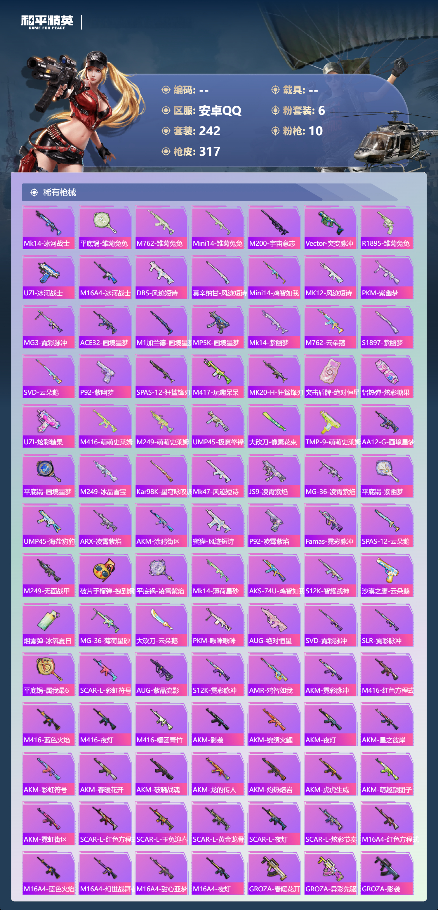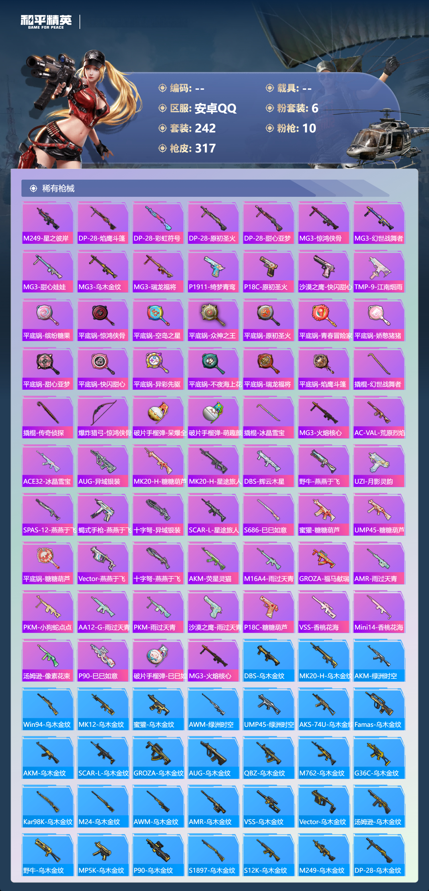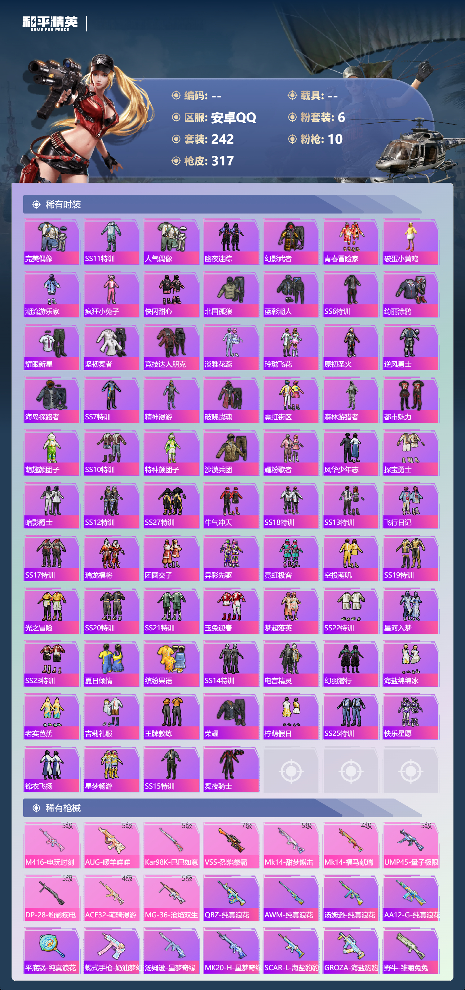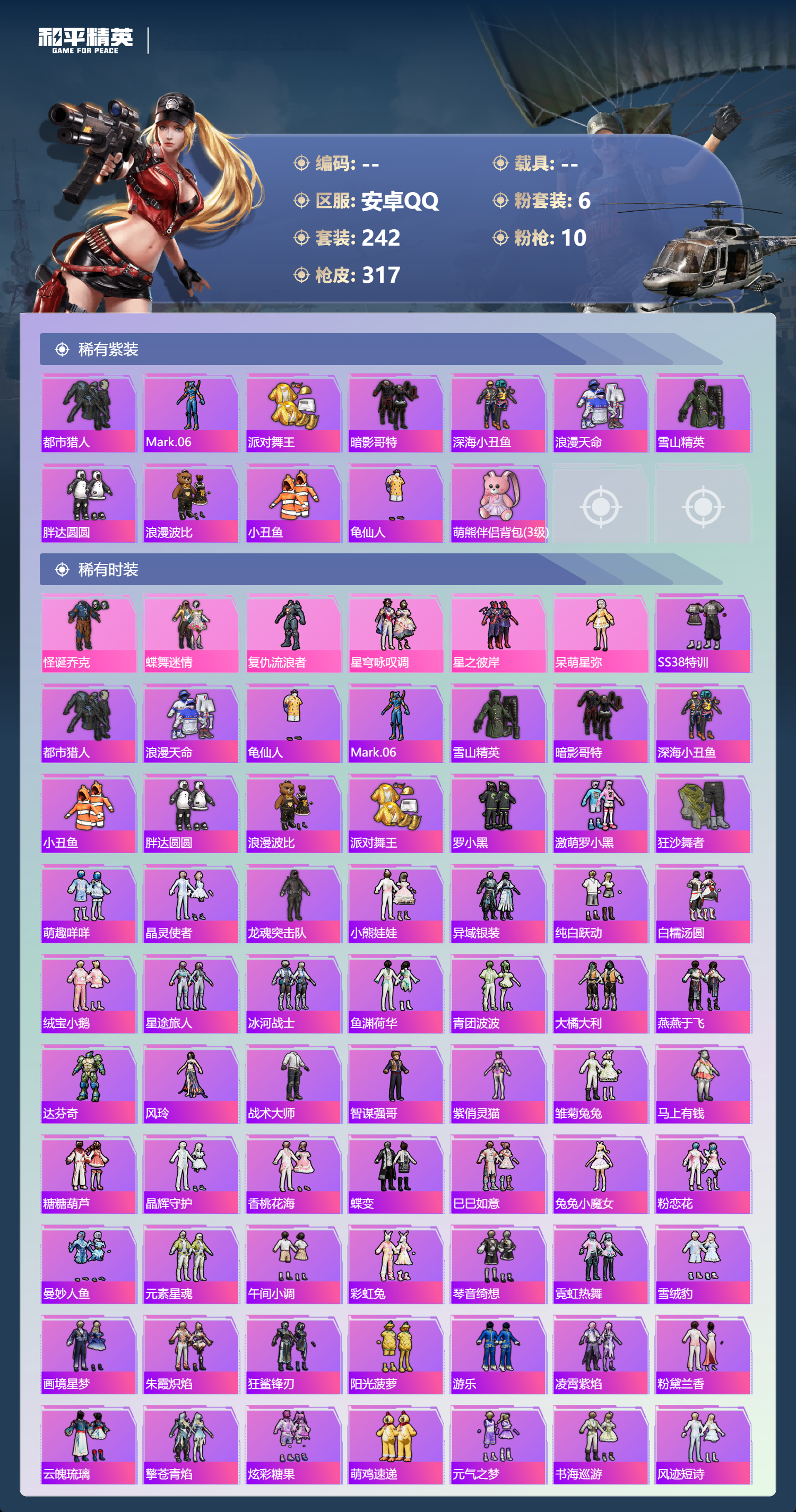 PX_2556565-,安卓手Q-21王牌印记-有战神框-6粉装-10特效枪-95964热力值-242套装-317枪皮-6卓越印记-3传奇印记