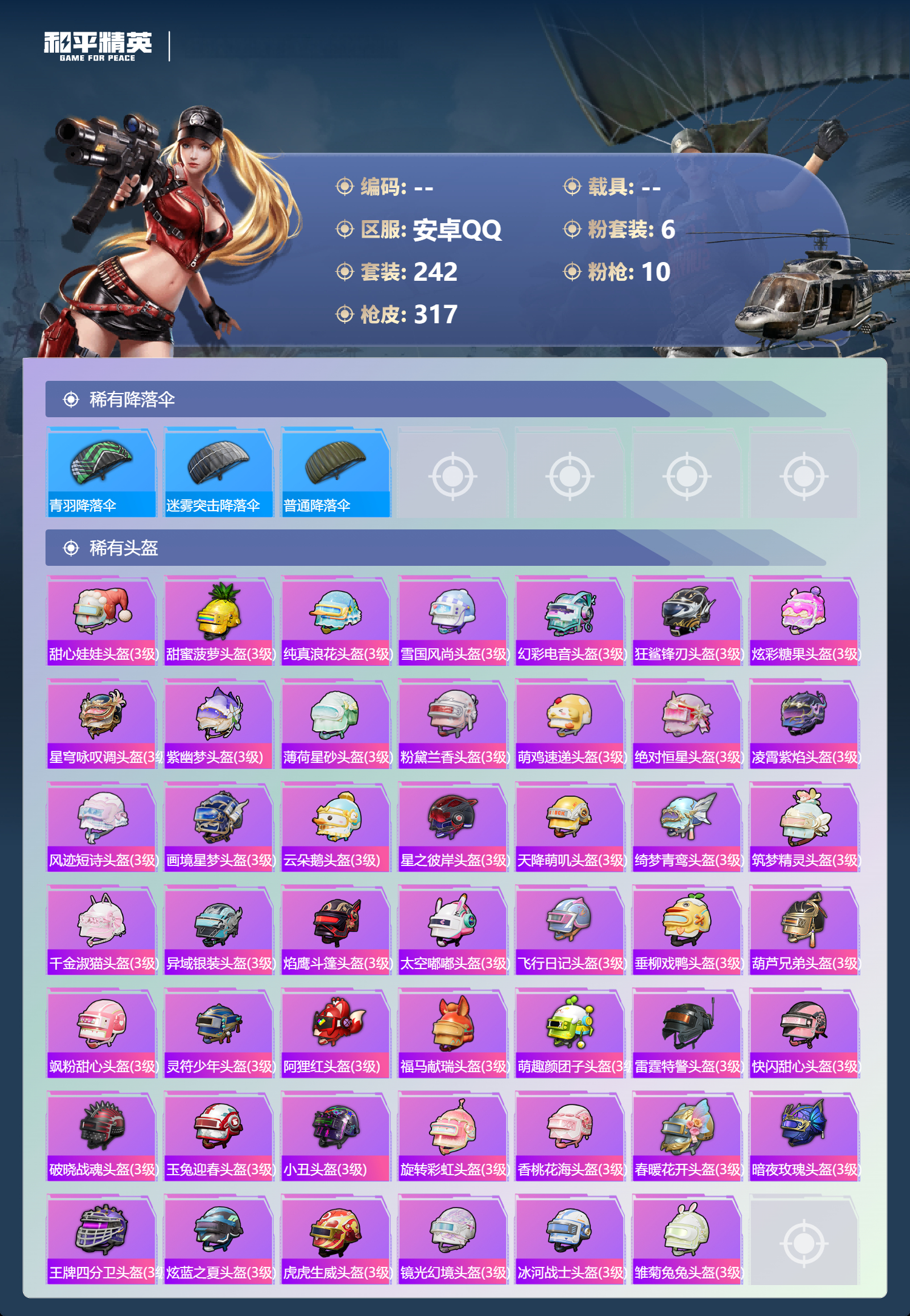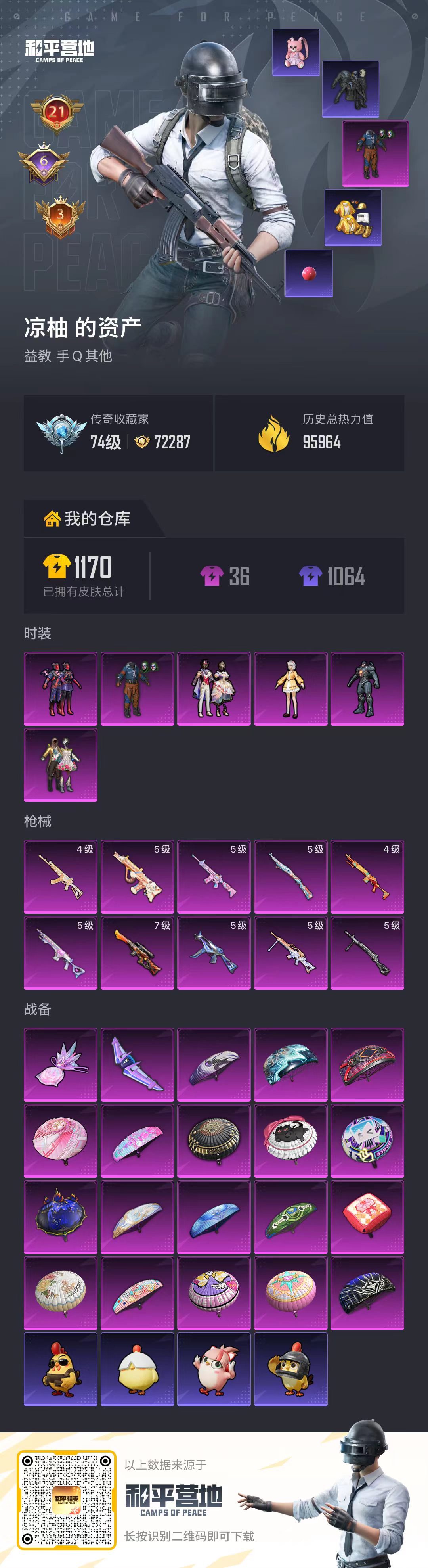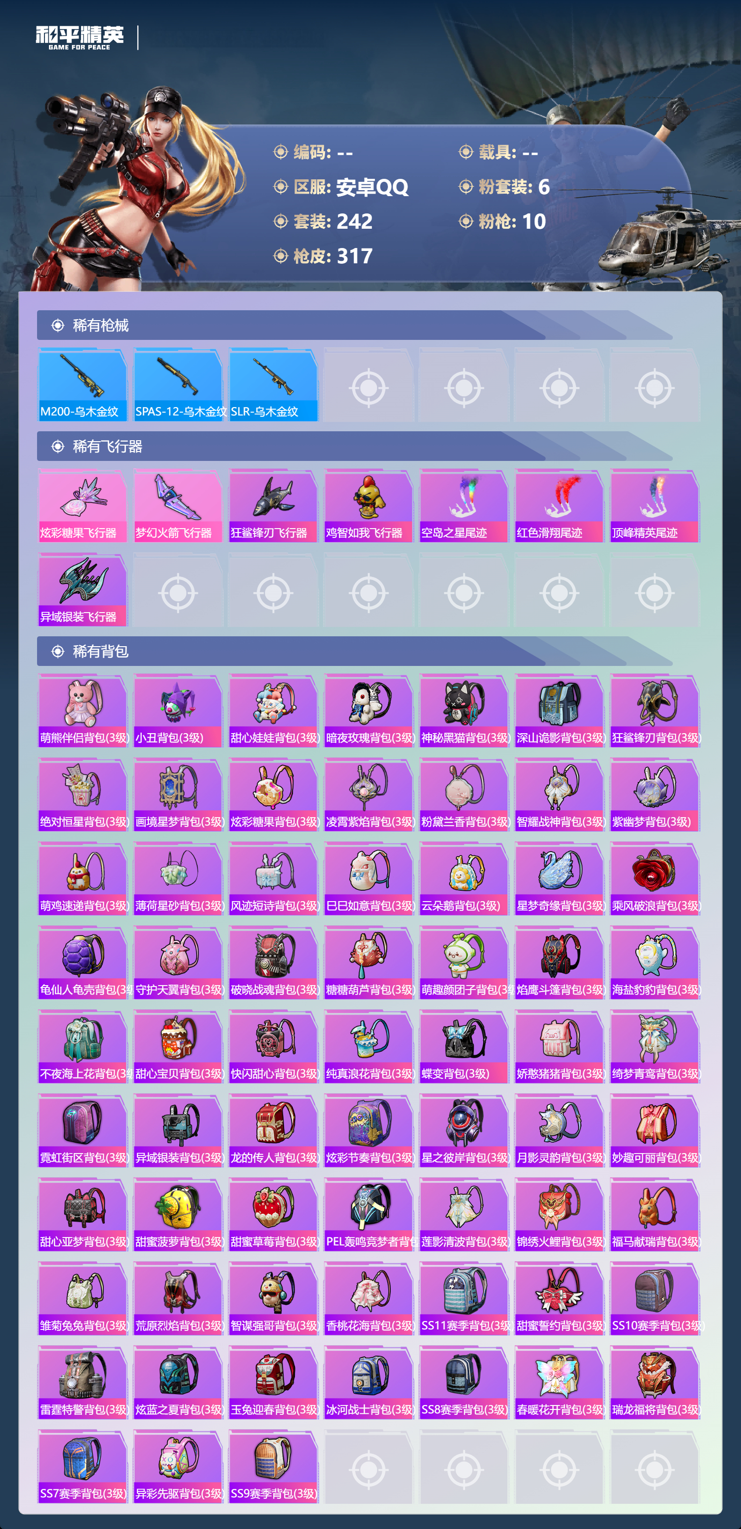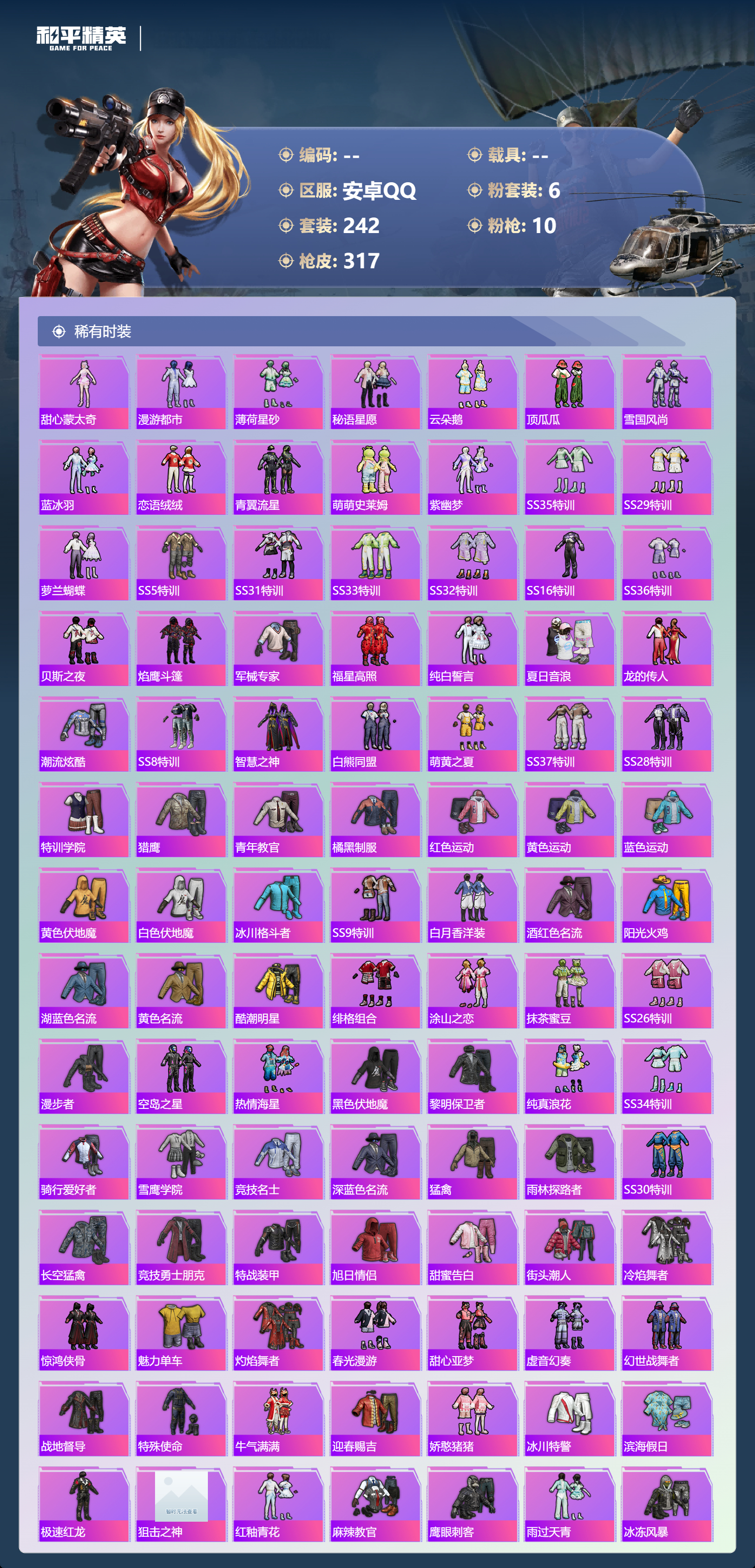 PX_2556565-,安卓手Q-21王牌印记-有战神框-6粉装-10特效枪-95964热力值-242套装-317枪皮-6卓越印记-3传奇印记
