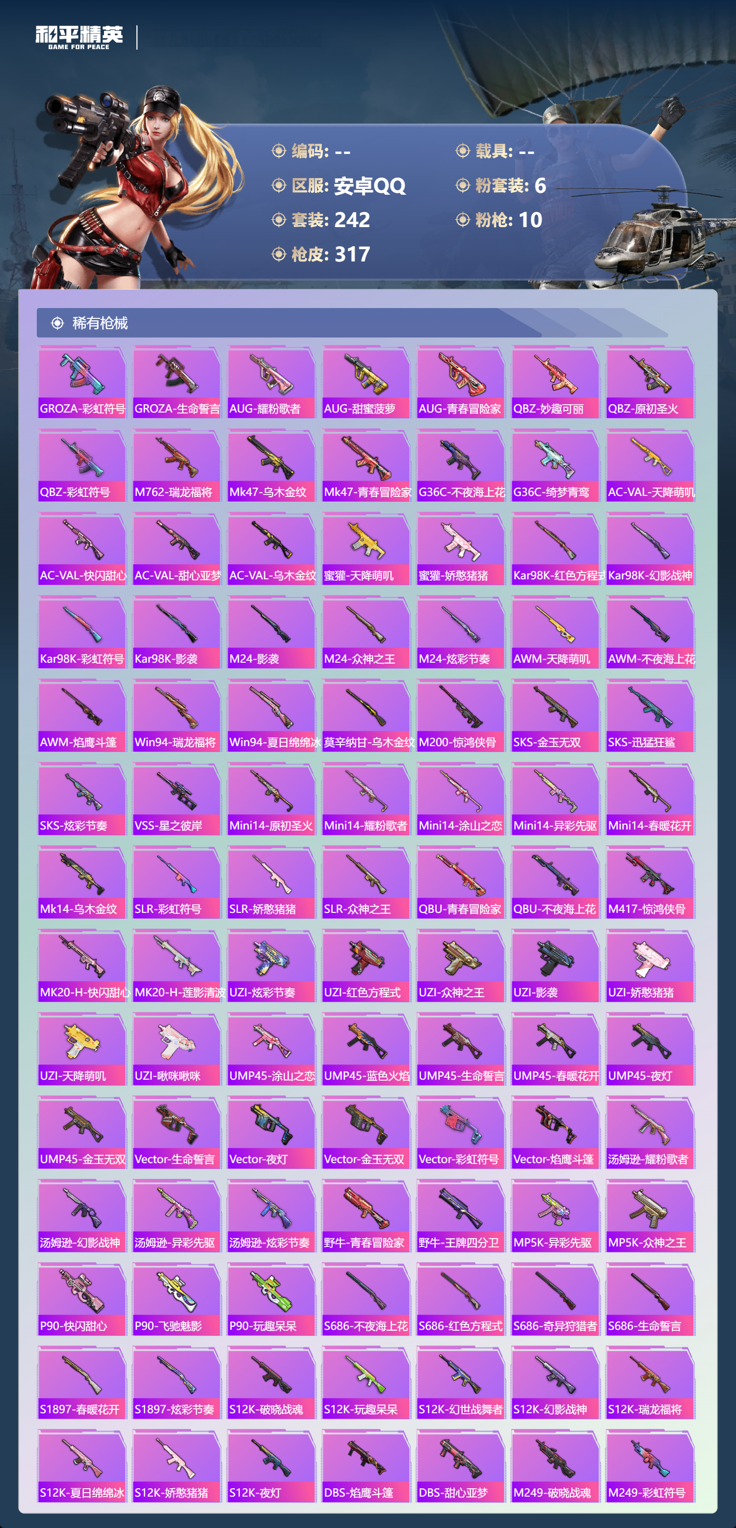 【318稀有枪械】M416-电玩时刻/5级,AUG-暖羊咩咩/5级,Kar98K-巳巳如意/5级,VSS-烈焰拳霸/7级,Mk14-甜梦熊击/5级,Mk14-福马献瑞/4级,UMP45-量子极限/5级,DP-28-豹影疾电/5级,ACE32-萌骑漫游/4级,MG-36-沧焰双生/5级,QBZ-纯真浪花,AWM-纯真浪花,汤姆逊-纯真浪花,DBS-乌木金纹,AA12-G-纯真浪花,平底锅-纯真浪花,蝎式手枪-奶油梦幻熊,汤姆逊-星梦奇缘,MK20-H-星梦奇缘,SCAR-L-海盐豹豹,GROZA-海盐豹豹,野牛-雏菊兔兔,Mk14-冰河战士,平底锅-雏菊兔兔,M762-雏菊兔兔,Mini14-雏菊兔兔,M200-宇宙意志,Vector-突变脉冲,R1895-雏菊兔兔,UZI-冰河战士,M16A4-冰河战士,MK20-H-乌木金纹,DBS-风迹短诗,莫辛纳甘-风迹短诗,Mini14-鸡智如我,AKM-绿洲时空,Win94-乌木金纹,MK12-风迹短诗,MK12-乌木金纹,PKM-紫幽梦,MG3-霓彩脉冲,ACE32-画境星梦,M1加兰德-画境星梦,MP5K-画境星梦,Mk14-紫幽梦,蜜獾-乌木金纹,M762-云朵鹅,S1897-紫幽梦,SVD-云朵鹅,P92-紫幽梦,AWM-绿洲时空,SPAS-12-狂鲨锋刃,M417-玩趣呆呆,MK20-H-狂鲨锋刃,突击盾牌-绝对恒星,铝热弹-炫彩糖果,UZI-炫彩糖果,UMP45-绿洲时空,M416-萌萌史莱姆,M249-萌萌史莱姆,UMP45-极意拳锋,大砍刀-像素花束,TMP-9-萌萌史莱姆,AA12-G-画境星梦,平底锅-画境星梦,M249-冰晶雪宝,Kar98K-星穹咏叹调,Mk47-风迹短诗,JS9-凌霄紫焰,MG-36-凌霄紫焰,平底锅-紫幽梦,UMP45-海盐豹豹,ARX-凌霄紫焰,AKS-74U-乌木金纹,AKM-涂鸦街区,蜜獾-风迹短诗,P92-凌霄紫焰,Famas-乌木金纹,Famas-霓彩脉冲,SPAS-12-云朵鹅,M249-无面战甲,破片手榴弹-拽到爆炸,平底锅-凌霄紫焰,Mk14-薄荷星砂,AKS-74U-鸡智如我,S12K-智耀战神,沙漠之鹰-云朵鹅,烟雾弹-冰氧夏日,MG-36-薄荷星砂,大砍刀-云朵鹅,PKM-啾咪啾咪,AUG-绝对恒星,SVD-霓彩脉冲,SLR-霓彩脉冲,平底锅-属我最6,SCAR-L-彩虹符号,AUG-紫晶流影,S12K-霓彩脉冲,AMR-鸡智如我,AKM-霓彩脉冲,M416-红色方程式,M416-蓝色火焰,M416-夜灯,M416-糯团青竹,AKM-影袭,AKM-锦绣火鲤,AKM-夜灯,AKM-乌木金纹,AKM-星之彼岸,AKM-彩虹符号,AKM-春暖花开,AKM-破晓战魂,AKM-龙的传人,AKM-灼热熔岩,AKM-虎虎生威,AKM-萌趣颜团子,AKM-霓虹街区,SCAR-L-红色方程式,SCAR-L-玉兔迎春,SCAR-L-乌木金纹,SCAR-L-黄金龙骨,SCAR-L-夜灯,SCAR-L-炫彩节奏,M16A4-红色方程式,M16A4-蓝色火焰,M16A4-幻世战舞者,M16A4-甜心亚梦,M16A4-夜灯,GROZA-乌木金纹,GROZA-春暖花开,GROZA-异彩先驱,GROZA-影袭,GROZA-彩虹符号,GROZA-生命誓言,AUG-乌木金纹,AUG-耀粉歌者,AUG-甜蜜菠萝,AUG-青春冒险家,QBZ-妙趣可丽,QBZ-原初圣火,QBZ-乌木金纹,QBZ-彩虹符号,M762-瑞龙福将,M762-乌木金纹,Mk47-乌木金纹,Mk47-青春冒险家,G36C-不夜海上花,G36C-乌木金纹,G36C-绮梦青鸾,AC-VAL-天降萌叽,AC-VAL-快闪甜心,AC-VAL-甜心亚梦,AC-VAL-乌木金纹,蜜獾-天降萌叽,蜜獾-娇憨猪猪,Kar98K-乌木金纹,Kar98K-红色方程式,Kar98K-幻影战神,Kar98K-彩虹符号,Kar98K-影袭,M24-乌木金纹,M24-影袭,M24-众神之王,M24-炫彩节奏,AWM-天降萌叽,AWM-乌木金纹,AWM-不夜海上花,AWM-焰鹰斗篷,Win94-瑞龙福将,Win94-夏日绵绵冰,莫辛纳甘-乌木金纹,AMR-乌木金纹,M200-惊鸿侠骨,SKS-金玉无双,SKS-迅猛狂鲨,SKS-炫彩节奏,VSS-星之彼岸,VSS-乌木金纹,Mini14-原初圣火,Mini14-耀粉歌者,Mini14-涂山之恋,Mini14-异彩先驱,Mini14-春暖花开,Mk14-乌木金纹,SLR-彩虹符号,SLR-娇憨猪猪,SLR-众神之王,QBU-青春冒险家,QBU-不夜海上花,M417-惊鸿侠骨,MK20-H-快闪甜心,MK20-H-莲影清波,UZI-炫彩节奏,UZI-红色方程式,UZI-众神之王,UZI-影袭,UZI-娇憨猪猪,UZI-天降萌叽,UZI-啾咪啾咪,UMP45-涂山之恋,UMP45-蓝色火焰,UMP45-生命誓言,UMP45-春暖花开,UMP45-夜灯,UMP45-金玉无双,Vector-乌木金纹,Vector-生命誓言,Vector-夜灯,Vector-金玉无双,Vector-彩虹符号,Vector-焰鹰斗篷,汤姆逊-耀粉歌者,汤姆逊-幻影战神,汤姆逊-乌木金纹,汤姆逊-异彩先驱,汤姆逊-炫彩节奏,野牛-乌木金纹,野牛-青春冒险家,野牛-王牌四分卫,MP5K-异彩先驱,MP5K-众神之王,MP5K-乌木金纹,P90-乌木金纹,P90-快闪甜心,P90-飞驰魅影,P90-玩趣呆呆,S686-不夜海上花,S686-红色方程式,S686-奇异狩猎者,S686-生命誓言,S1897-春暖花开,S1897-乌木金纹,S1897-炫彩节奏,S12K-破晓战魂,S12K-玩趣呆呆,S12K-幻世战舞者,S12K-乌木金纹,S12K-幻影战神,S12K-瑞龙福将,S12K-夏日绵绵冰,S12K-娇憨猪猪,S12K-夜灯,DBS-焰鹰斗篷,DBS-甜心亚梦,M249-破晓战魂,M249-彩虹符号,M249-乌木金纹,M249-星之彼岸,DP-28-焰鹰斗篷,DP-28-彩虹符号,DP-28-乌木金纹,DP-28-原初圣火,DP-28-甜心亚梦,MG3-惊鸿侠骨,MG3-幻世战舞者,MG3-甜心娃娃,MG3-乌木金纹,MG3-瑞龙福将,P1911-绮梦青鸾,P18C-原初圣火,沙漠之鹰-快闪甜心,TMP-9-江南烟雨,平底锅-缤纷糖果,平底锅-惊鸿侠骨,平底锅-空岛之星,平底锅-众神之王,平底锅-原初圣火,平底锅-青春冒险家,平底锅-娇憨猪猪,平底锅-甜心亚梦,平底锅-快闪甜心,平底锅-异彩先驱,平底锅-不夜海上花,平底锅-瑞龙福将,平底锅-焰鹰斗篷,撬棍-幻世战舞者,撬棍-传奇侦探,爆炸猎弓-惊鸿侠骨,破片手榴弹-呆爆全场,破片手榴弹-萌趣颜团子,撬棍-冰晶雪宝,MG3-火熔核心,AC-VAL-荒原烈焰,ACE32-冰晶雪宝,AUG-异域银装,MK20-H-糖糖葫芦,MK20-H-星途旅人,DBS-辉云木星,野牛-燕燕于飞,UZI-月影灵韵,M200-乌木金纹,SPAS-12-燕燕于飞,蝎式手枪-燕燕于飞,十字弩-异域银装,SCAR-L-星途旅人,S686-巳巳如意,蜜獾-糖糖葫芦,UMP45-糖糖葫芦,SPAS-12-乌木金纹,平底锅-糖糖葫芦,Vector-燕燕于飞,十字弩-燕燕于飞,AKM-荧星灵猫,M16A4-雨过天青,GROZA-福马献瑞,AMR-雨过天青,PKM-小狗蛇点点,SLR-乌木金纹,AA12-G-雨过天青,PKM-雨过