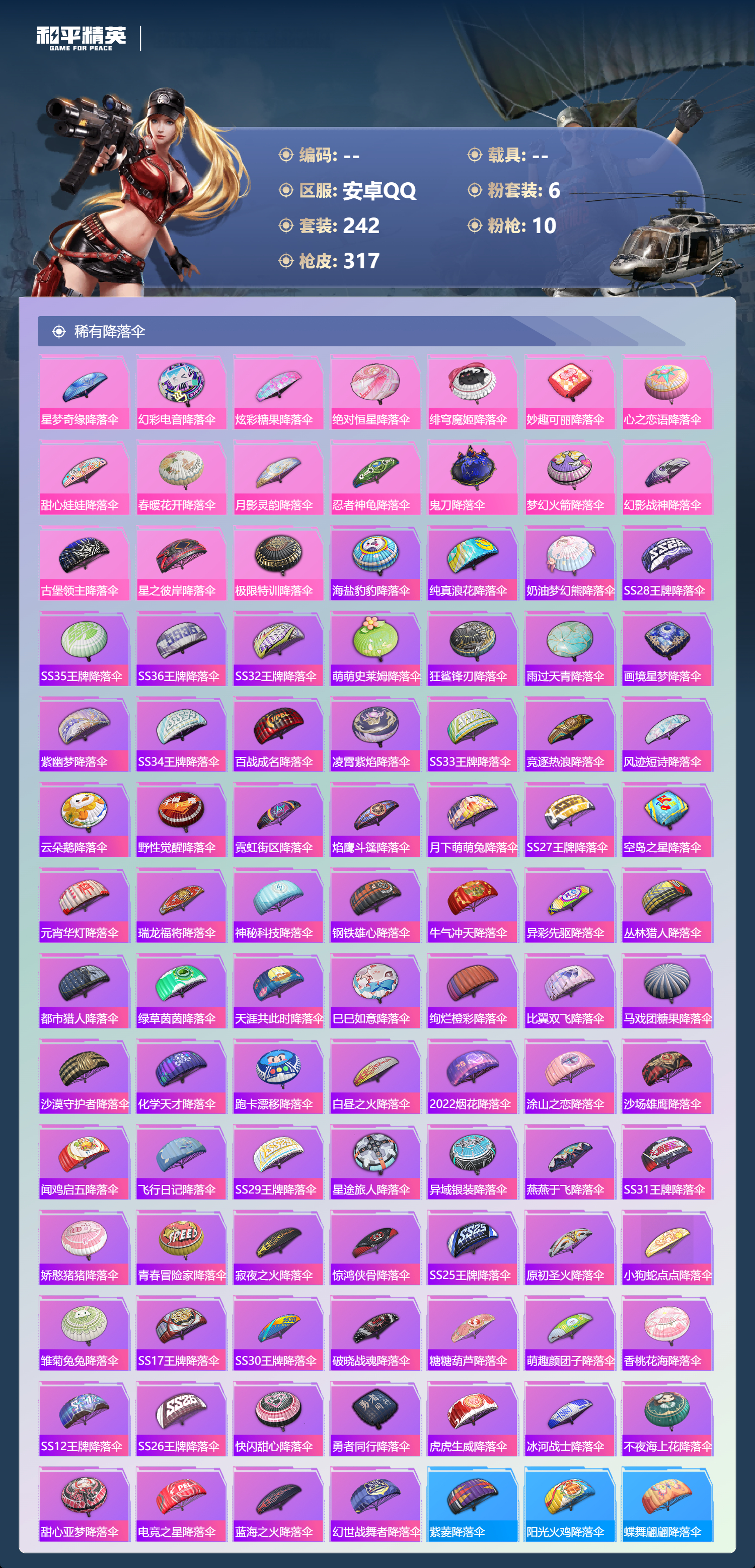 【101稀有降落伞】海盐豹豹降落伞,纯真浪花降落伞,奶油梦幻熊降落伞,SS28王牌降落伞,星梦奇缘降落伞,SS35王牌降落伞,SS36王牌降落伞,幻彩电音降落伞,SS32王牌降落伞,炫彩糖果降落伞,萌萌史莱姆降落伞,绝对恒星降落伞,狂鲨锋刃降落伞,绯穹魔姬降落伞,雨过天青降落伞,画境星梦降落伞,紫幽梦降落伞,SS34王牌降落伞,百战成名降落伞,凌霄紫焰降落伞,SS33王牌降落伞,竞逐热浪降落伞,风迹短诗降落伞,云朵鹅降落伞,野性觉醒降落伞,霓虹街区降落伞,焰鹰斗篷降落伞,妙趣可丽降落伞,月下萌萌兔降落伞,SS27王牌降落伞,空岛之星降落伞,元宵华灯降落伞,紫菱降落伞,瑞龙福将降落伞,心之恋语降落伞,阳光火鸡降落伞,神秘科技降落伞,钢铁雄心降落伞,牛气冲天降落伞,蝶舞翩翩降落伞,异彩先驱降落伞,丛林猎人降落伞,都市猎人降落伞,绿草茵茵降落伞,青羽降落伞,天涯共此时降落伞,巳巳如意降落伞,甜心娃娃降落伞,绚烂橙彩降落伞,春暖花开降落伞,普通降落伞,比翼双飞降落伞,马戏团糖果降落伞,沙漠守护者降落伞,化学天才降落伞,跑卡漂移降落伞,白昼之火降落伞,2022烟花降落伞,迷雾突击降落伞,月影灵韵降落伞,涂山之恋降落伞,沙场雄鹰降落伞,闻鸡启五降落伞,飞行日记降落伞,SS29王牌降落伞,忍者神龟降落伞,鬼刀降落伞,星途旅人降落伞,异域银装降落伞,燕燕于飞降落伞,SS31王牌降落伞,娇憨猪猪降落伞,青春冒险家降落伞,寂夜之火降落伞,惊鸿侠骨降落伞,SS25王牌降落伞,原初圣火降落伞,小狗蛇点点降落伞,雏菊兔兔降落伞,SS17王牌降落伞,SS30王牌降落伞,破晓战魂降落伞,糖糖葫芦降落伞,萌趣颜团子降落伞,香桃花海降落伞,SS12王牌降落伞,SS26王牌降落伞,快闪甜心降落伞,梦幻火箭降落伞,幻影战神降落伞,勇者同行降落伞,虎虎生威降落伞,古堡领主降落伞,冰河战士降落伞,星之彼岸降落伞,不夜海上花降落伞,甜心亚梦降落伞,电竞之星降落伞,蓝海之火降落伞,幻世战舞者降落伞,极限特训降落伞