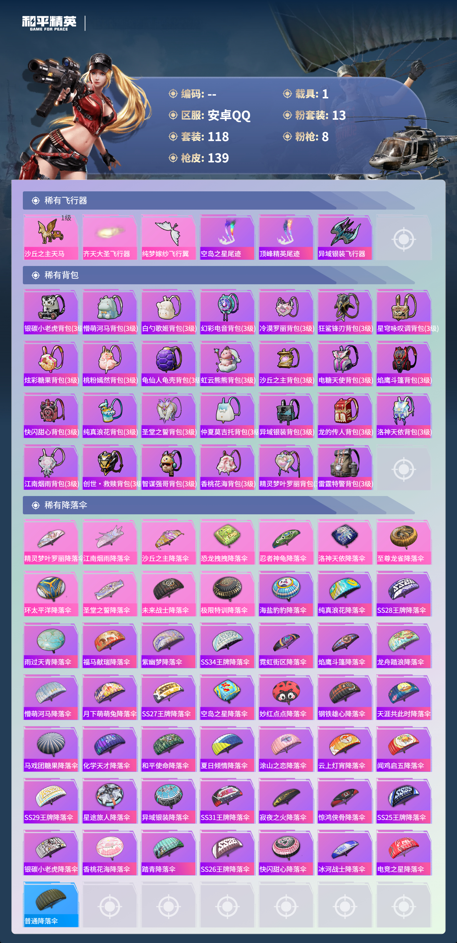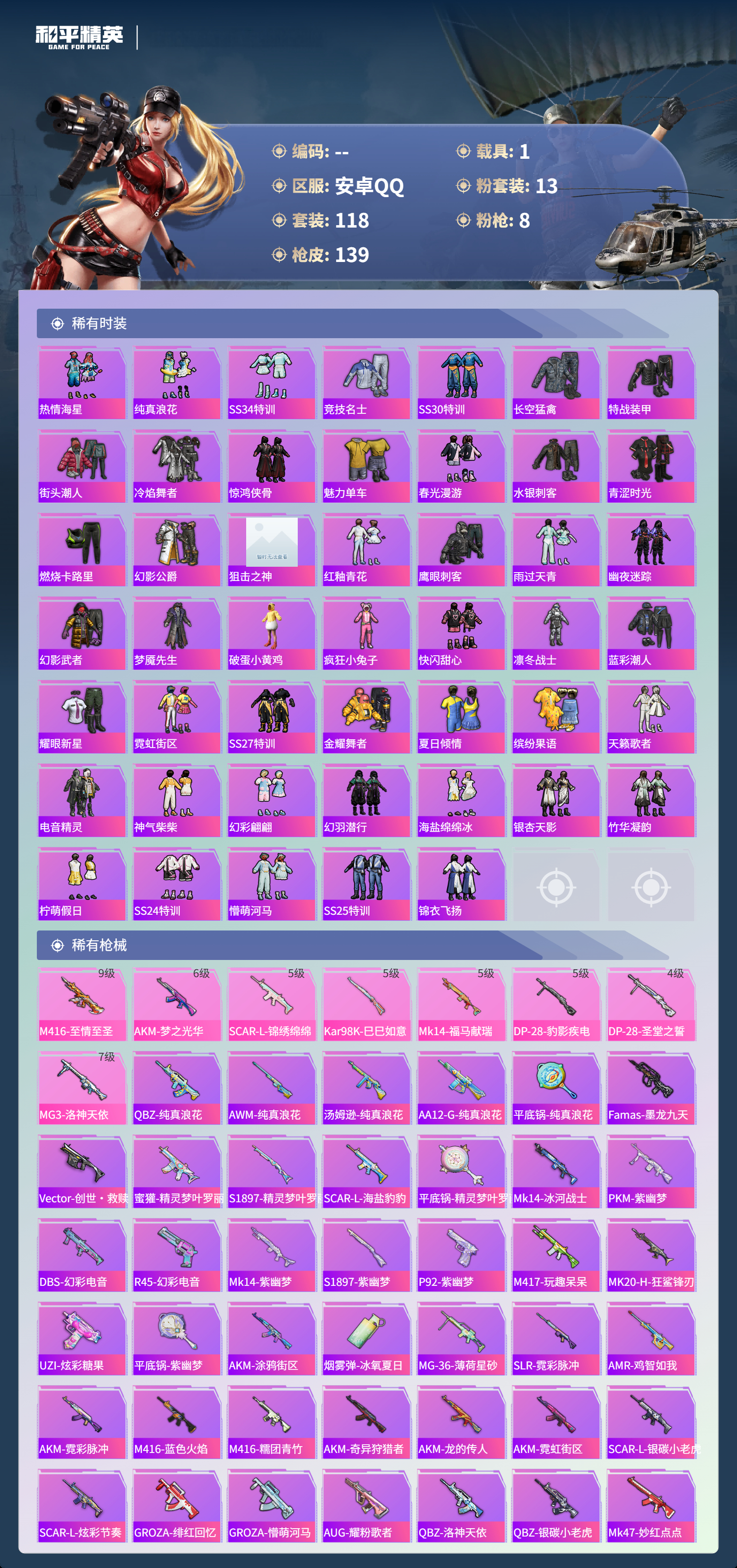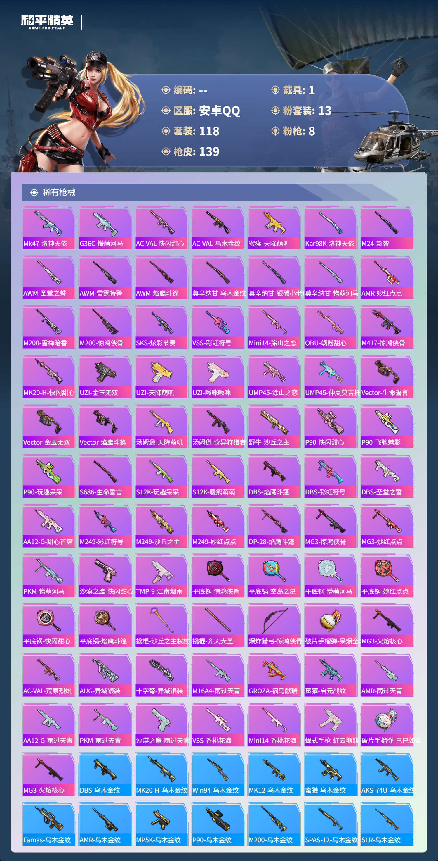 【140稀有枪械】M416-至情至圣/9级,AKM-梦之光华/6级,SCAR-L-锦绣绵绵/5级,Kar98K-巳巳如意/5级,Mk14-福马献瑞/5级,DP-28-豹影疾电/5级,DP-28-圣堂之誓/4级,MG3-洛神天依/7级,QBZ-纯真浪花,AWM-纯真浪花,汤姆逊-纯真浪花,DBS-乌木金纹,AA12-G-纯真浪花,平底锅-纯真浪花,Famas-墨龙九天,Vector-创世·救赎,蜜獾-精灵梦叶罗丽,S1897-精灵梦叶罗丽,SCAR-L-海盐豹豹,平底锅-精灵梦叶罗丽,Mk14-冰河战士,MK20-H-乌木金纹,Win94-乌木金纹,MK12-乌木金纹,PKM-紫幽梦,DBS-幻彩电音,R45-幻彩电音,Mk14-紫幽梦,蜜獾-乌木金纹,S1897-紫幽梦,P92-紫幽梦,M417-玩趣呆呆,MK20-H-狂鲨锋刃,UZI-炫彩糖果,平底锅-紫幽梦,AKS-74U-乌木金纹,AKM-涂鸦街区,Famas-乌木金纹,烟雾弹-冰氧夏日,MG-36-薄荷星砂,SLR-霓彩脉冲,AMR-鸡智如我,AKM-霓彩脉冲,M416-蓝色火焰,M416-糯团青竹,AKM-奇异狩猎者,AKM-龙的传人,AKM-霓虹街区,SCAR-L-银碳小老虎,SCAR-L-炫彩节奏,GROZA-绯红回忆,GROZA-懵萌河马,AUG-耀粉歌者,QBZ-洛神天依,QBZ-银碳小老虎,Mk47-妙红点点,Mk47-洛神天依,G36C-懵萌河马,AC-VAL-快闪甜心,AC-VAL-乌木金纹,蜜獾-天降萌叽,Kar98K-洛神天依,M24-影袭,AWM-圣堂之誓,AWM-雷霆特警,AWM-焰鹰斗篷,莫辛纳甘-乌木金纹,莫辛纳甘-银碳小老虎,莫辛纳甘-懵萌河马,AMR-乌木金纹,AMR-妙红点点,M200-雪梅暗香,M200-惊鸿侠骨,SKS-炫彩节奏,VSS-彩虹符号,Mini14-涂山之恋,QBU-飒粉甜心,M417-惊鸿侠骨,MK20-H-快闪甜心,UZI-金玉无双,UZI-天降萌叽,UZI-啾咪啾咪,UMP45-涂山之恋,UMP45-仲夏莫吉托,Vector-生命誓言,Vector-金玉无双,Vector-焰鹰斗篷,汤姆逊-天降萌叽,汤姆逊-奇异狩猎者,野牛-沙丘之主,MP5K-乌木金纹,P90-乌木金纹,P90-快闪甜心,P90-飞驰魅影,P90-玩趣呆呆,S686-生命誓言,S12K-玩趣呆呆,S12K-暖熊萌萌,DBS-焰鹰斗篷,DBS-彩虹符号,DBS-圣堂之誓,AA12-G-甜心首席,M249-彩虹符号,M249-沙丘之主,M249-妙红点点,DP-28-焰鹰斗篷,MG3-惊鸿侠骨,MG3-妙红点点,PKM-懵萌河马,沙漠之鹰-快闪甜心,TMP-9-江南烟雨,平底锅-惊鸿侠骨,平底锅-空岛之星,平底锅-懵萌河马,平底锅-妙红点点,平底锅-快闪甜心,平底锅-焰鹰斗篷,撬棍-沙丘之主权杖,撬棍-齐天大圣,爆炸猎弓-惊鸿侠骨,破片手榴弹-呆爆全场,MG3-火熔核心,AC-VAL-荒原烈焰,AUG-异域银装,M200-乌木金纹,十字弩-异域银装,SPAS-12-乌木金纹,M16A4-雨过天青,GROZA-福马献瑞,蜜獾-启元战纹,AMR-雨过天青,SLR-乌木金纹,AA12-G-雨过天青,PKM-雨过天青,沙漠之鹰-雨过天青,VSS-香桃花海,Mini14-香桃花海,蝎式手枪-虹云熊熊,破片手榴弹-巳巳如意,MG3-火熔核心