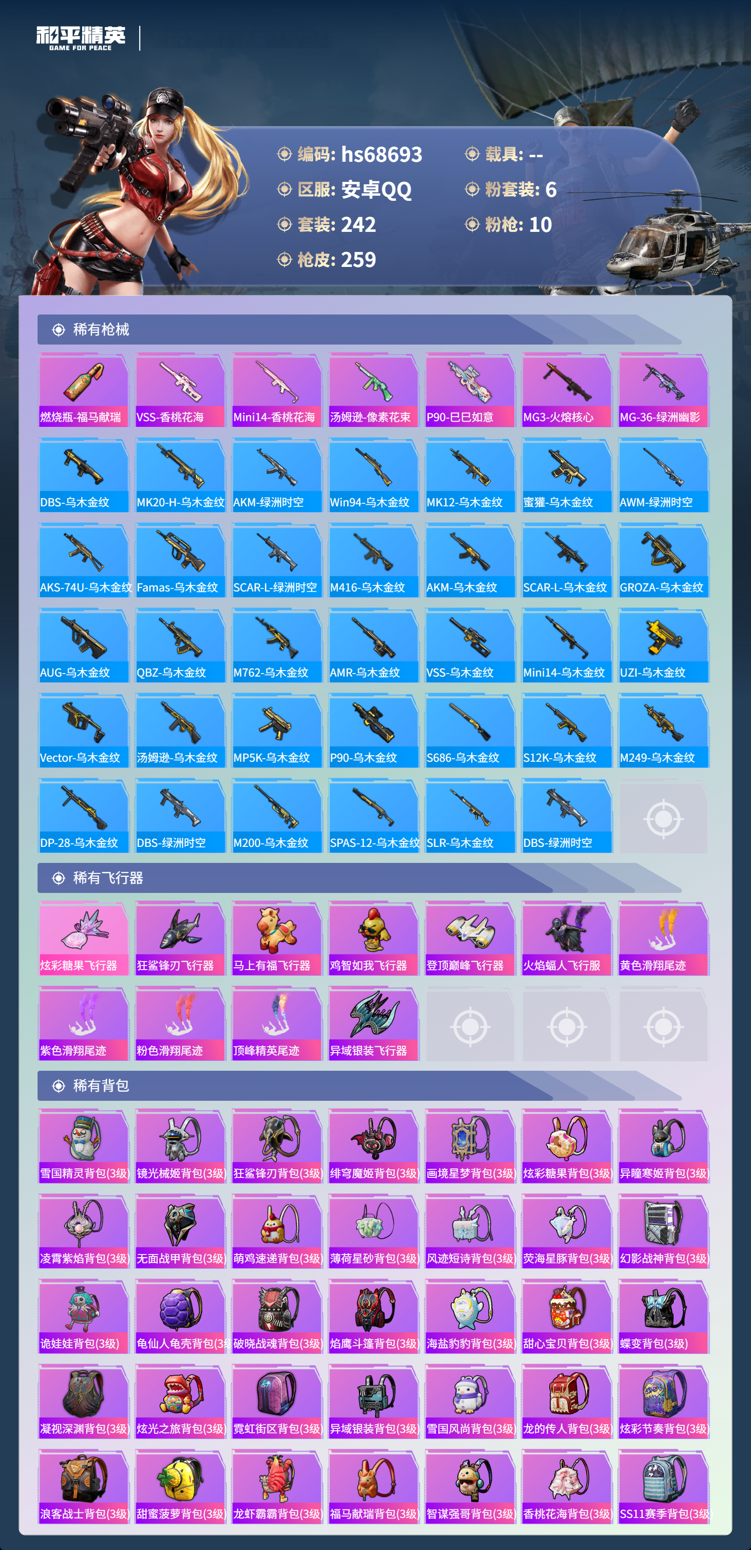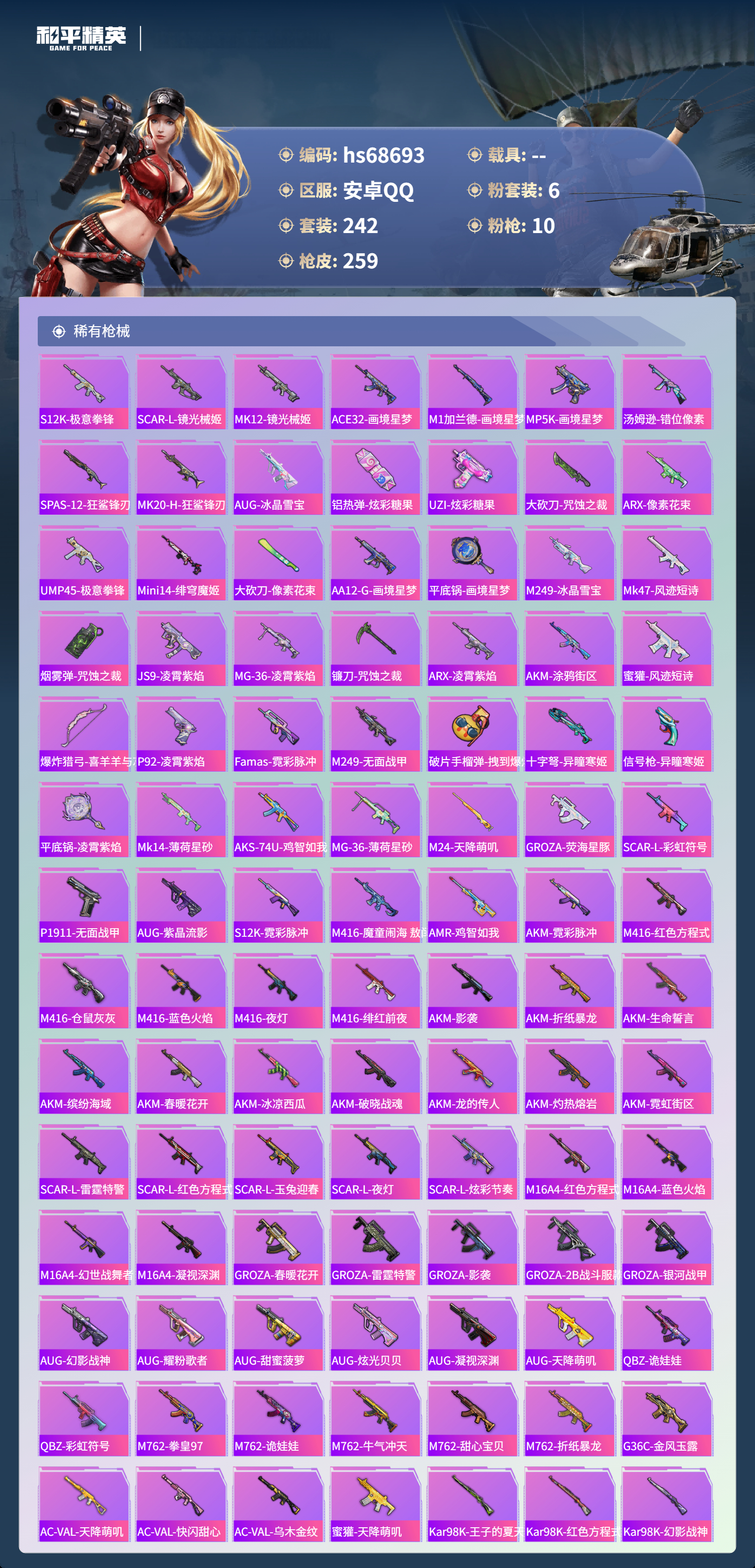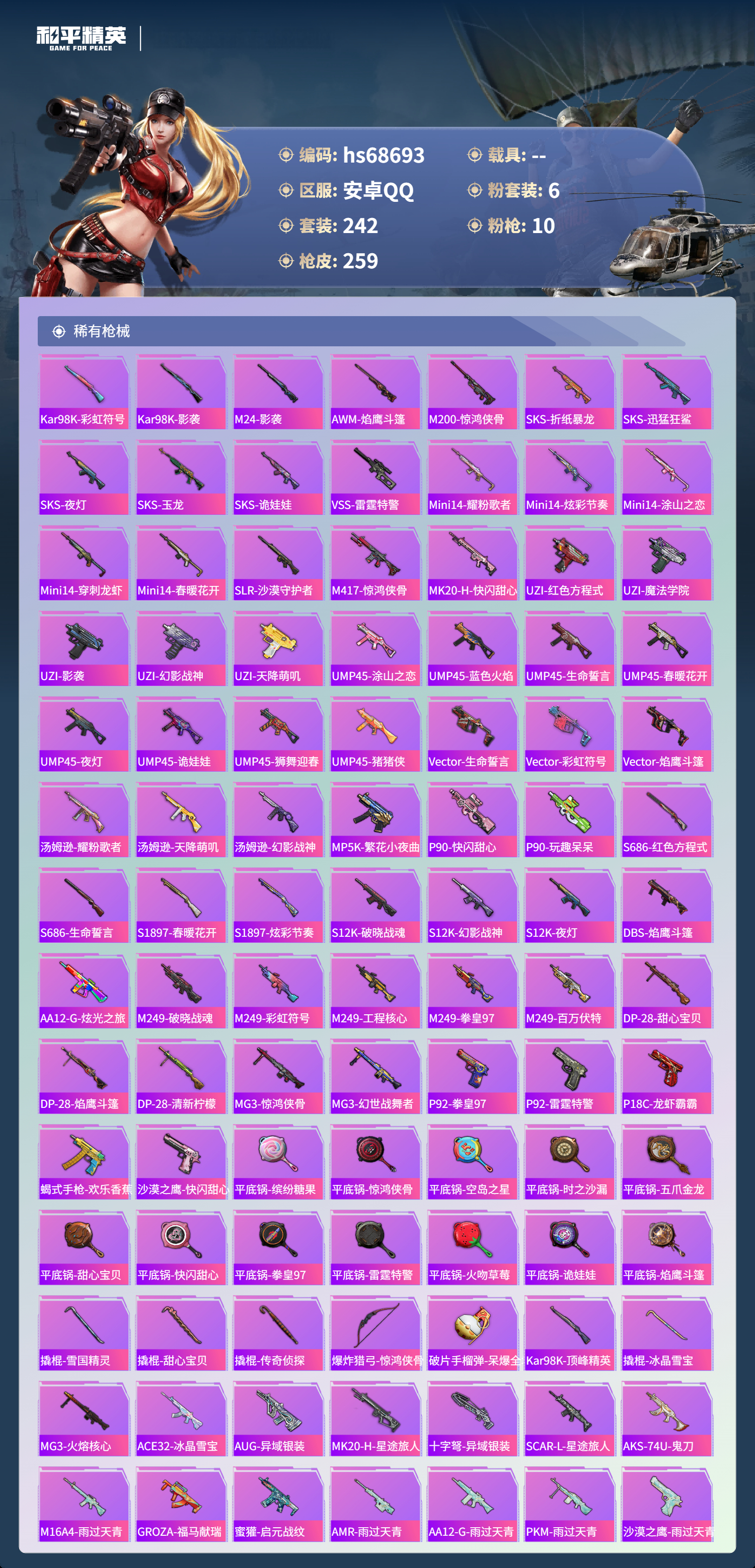 【258稀有枪械】M416-电玩时刻/5级,Kar98K-巳巳如意/5级,Mk14-福马献瑞/5级,UMP45-萌骑冒险/3级,DP-28-豹影疾电/5级,PKM-萌骑夺宝/3级,ACE32-萌骑漫游/3级,AA12-G-萌骑幻想/2级,AKS-74U-森灵之息/5级,信号枪-金乌曜日/5级,DBS-乌木金纹,S1897-精灵梦叶罗丽,SCAR-L-海盐豹豹,Mk14-冰河战士,M16A4-冰河战士,MK20-H-乌木金纹,DBS-风迹短诗,莫辛纳甘-风迹短诗,Mini14-鸡智如我,M416-错位像素,AKM-绿洲时空,GROZA-无面战甲,Win94-乌木金纹,MK12-风迹短诗,野牛-魔童闹海,敖闰,MK12-乌木金纹,S12K-极意拳锋,SCAR-L-镜光械姬,MK12-镜光械姬,ACE32-画境星梦,M1加兰德-画境星梦,MP5K-画境星梦,蜜獾-乌木金纹,AWM-绿洲时空,汤姆逊-错位像素,SPAS-12-狂鲨锋刃,MK20-H-狂鲨锋刃,AUG-冰晶雪宝,铝热弹-炫彩糖果,UZI-炫彩糖果,大砍刀-咒蚀之裁,ARX-像素花束,UMP45-极意拳锋,Mini14-绯穹魔姬,大砍刀-像素花束,AA12-G-画境星梦,平底锅-画境星梦,M249-冰晶雪宝,Mk47-风迹短诗,烟雾弹-咒蚀之裁,JS9-凌霄紫焰,MG-36-凌霄紫焰,镰刀-咒蚀之裁,ARX-凌霄紫焰,AKS-74U-乌木金纹,AKM-涂鸦街区,蜜獾-风迹短诗,爆炸猎弓-喜羊羊与灰太狼,P92-凌霄紫焰,Famas-乌木金纹,Famas-霓彩脉冲,M249-无面战甲,破片手榴弹-拽到爆炸,十字弩-异瞳寒姬,信号枪-异瞳寒姬,平底锅-凌霄紫焰,Mk14-薄荷星砂,AKS-74U-鸡智如我,MG-36-薄荷星砂,SCAR-L-绿洲时空,M24-天降萌叽,GROZA-荧海星豚,SCAR-L-彩虹符号,P1911-无面战甲,AUG-紫晶流影,S12K-霓彩脉冲,M416-魔童闹海,敖闰,AMR-鸡智如我,AKM-霓彩脉冲,M416-红色方程式,M416-仓鼠灰灰,M416-乌木金纹,M416-蓝色火焰,M416-夜灯,M416-绯红前夜,AKM-影袭,AKM-折纸暴龙,AKM-生命誓言,AKM-乌木金纹,AKM-缤纷海域,AKM-春暖花开,AKM-冰凉西瓜,AKM-破晓战魂,AKM-龙的传人,AKM-灼热熔岩,AKM-霓虹街区,SCAR-L-雷霆特警,SCAR-L-红色方程式,SCAR-L-玉兔迎春,SCAR-L-乌木金纹,SCAR-L-夜灯,SCAR-L-炫彩节奏,M16A4-红色方程式,M16A4-蓝色火焰,M16A4-幻世战舞者,M16A4-凝视深渊,GROZA-乌木金纹,GROZA-春暖花开,GROZA-雷霆特警,GROZA-影袭,GROZA-2B战斗服款,GROZA-银河战甲,AUG-乌木金纹,AUG-幻影战神,AUG-耀粉歌者,AUG-甜蜜菠萝,AUG-炫光贝贝,AUG-凝视深渊,AUG-天降萌叽,QBZ-诡娃娃,QBZ-乌木金纹,QBZ-彩虹符号,M762-拳皇97,M762-诡娃娃,M762-乌木金纹,M762-牛气冲天,M762-甜心宝贝,M762-折纸暴龙,G36C-金风玉露,AC-VAL-天降萌叽,AC-VAL-快闪甜心,AC-VAL-乌木金纹,蜜獾-天降萌叽,Kar98K-王子的夏天,Kar98K-红色方程式,Kar98K-幻影战神,Kar98K-彩虹符号,Kar98K-影袭,M24-影袭,AWM-焰鹰斗篷,AMR-乌木金纹,M200-惊鸿侠骨,SKS-折纸暴龙,SKS-迅猛狂鲨,SKS-夜灯,SKS-玉龙,SKS-诡娃娃,VSS-乌木金纹,VSS-雷霆特警,Mini14-耀粉歌者,Mini14-乌木金纹,Mini14-炫彩节奏,Mini14-涂山之恋,Mini14-穿刺龙虾,Mini14-春暖花开,SLR-沙漠守护者,M417-惊鸿侠骨,MK20-H-快闪甜心,UZI-乌木金纹,UZI-红色方程式,UZI-魔法学院,UZI-影袭,UZI-幻影战神,UZI-天降萌叽,UMP45-涂山之恋,UMP45-蓝色火焰,UMP45-生命誓言,UMP45-春暖花开,UMP45-夜灯,UMP45-诡娃娃,UMP45-狮舞迎春,UMP45-猪猪侠,Vector-乌木金纹,Vector-生命誓言,Vector-彩虹符号,Vector-焰鹰斗篷,汤姆逊-耀粉歌者,汤姆逊-天降萌叽,汤姆逊-幻影战神,汤姆逊-乌木金纹,MP5K-繁花小夜曲,MP5K-乌木金纹,P90-乌木金纹,P90-快闪甜心,P90-玩趣呆呆,S686-乌木金纹,S686-红色方程式,S686-生命誓言,S1897-春暖花开,S1897-炫彩节奏,S12K-破晓战魂,S12K-乌木金纹,S12K-幻影战神,S12K-夜灯,DBS-焰鹰斗篷,AA12-G-炫光之旅,M249-破晓战魂,M249-彩虹符号,M249-工程核心,M249-拳皇97,M249-百万伏特,M249-乌木金纹,DP-28-甜心宝贝,DP-28-焰鹰斗篷,DP-28-清新柠檬,DP-28-乌木金纹,MG3-惊鸿侠骨,MG3-幻世战舞者,P92-拳皇97,P92-雷霆特警,P18C-龙虾霸霸,蝎式手枪-欢乐香蕉,沙漠之鹰-快闪甜心,平底锅-缤纷糖果,平底锅-惊鸿侠骨,平底锅-空岛之星,平底锅-时之沙漏,平底锅-五爪金龙,平底锅-甜心宝贝,平底锅-快闪甜心,平底锅-拳皇97,平底锅-雷霆特警,平底锅-火吻草莓,平底锅-诡娃娃,平底锅-焰鹰斗篷,撬棍-雪国精灵,撬棍-甜心宝贝,撬棍-传奇侦探,爆炸猎弓-惊鸿侠骨,破片手榴弹-呆爆全场,Kar98K-顶峰精英,撬棍-冰晶雪宝,DBS-绿洲时空,MG3-火熔核心,ACE32-冰晶雪宝,AUG-异域银装,MK20-H-星途旅人,M200-乌木金纹,十字弩-异域银装,SCAR-L-星途旅人,SPAS-12-乌木金纹,AKS-74U-鬼刀,M16A4-雨过天青,GROZA-福马献瑞,蜜獾-启元战纹,AMR-雨过天青,SLR-乌木金纹,AA12-G-雨过天青,PKM-雨过天青,沙漠之鹰-雨过天青,燃烧瓶-福马献瑞,VSS-香桃花海,Mini14-香桃花海,汤姆逊-像素花束,P90-巳巳如意,DBS-绿洲时空,MG3-火熔核心,MG-36-绿洲幽影