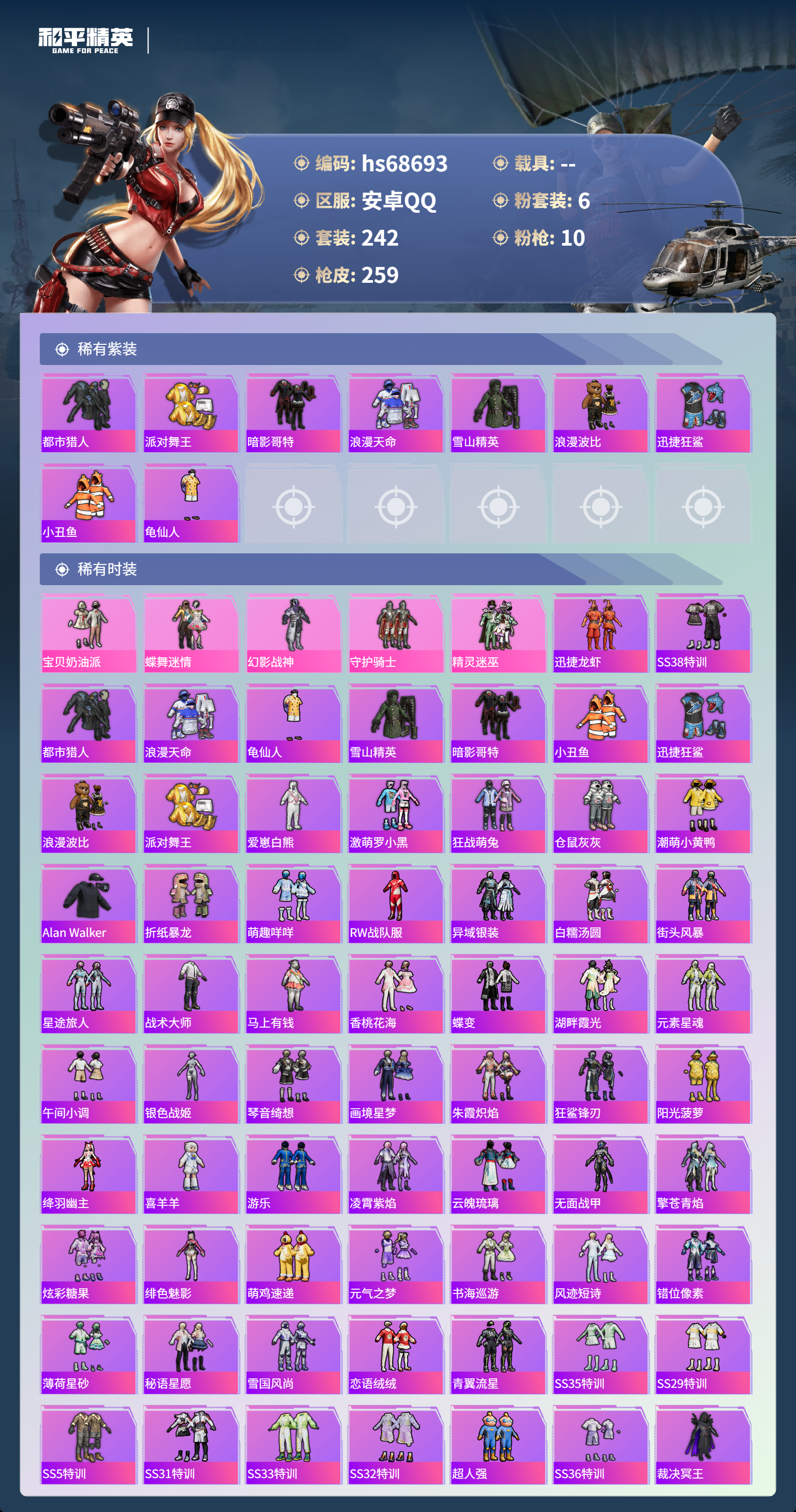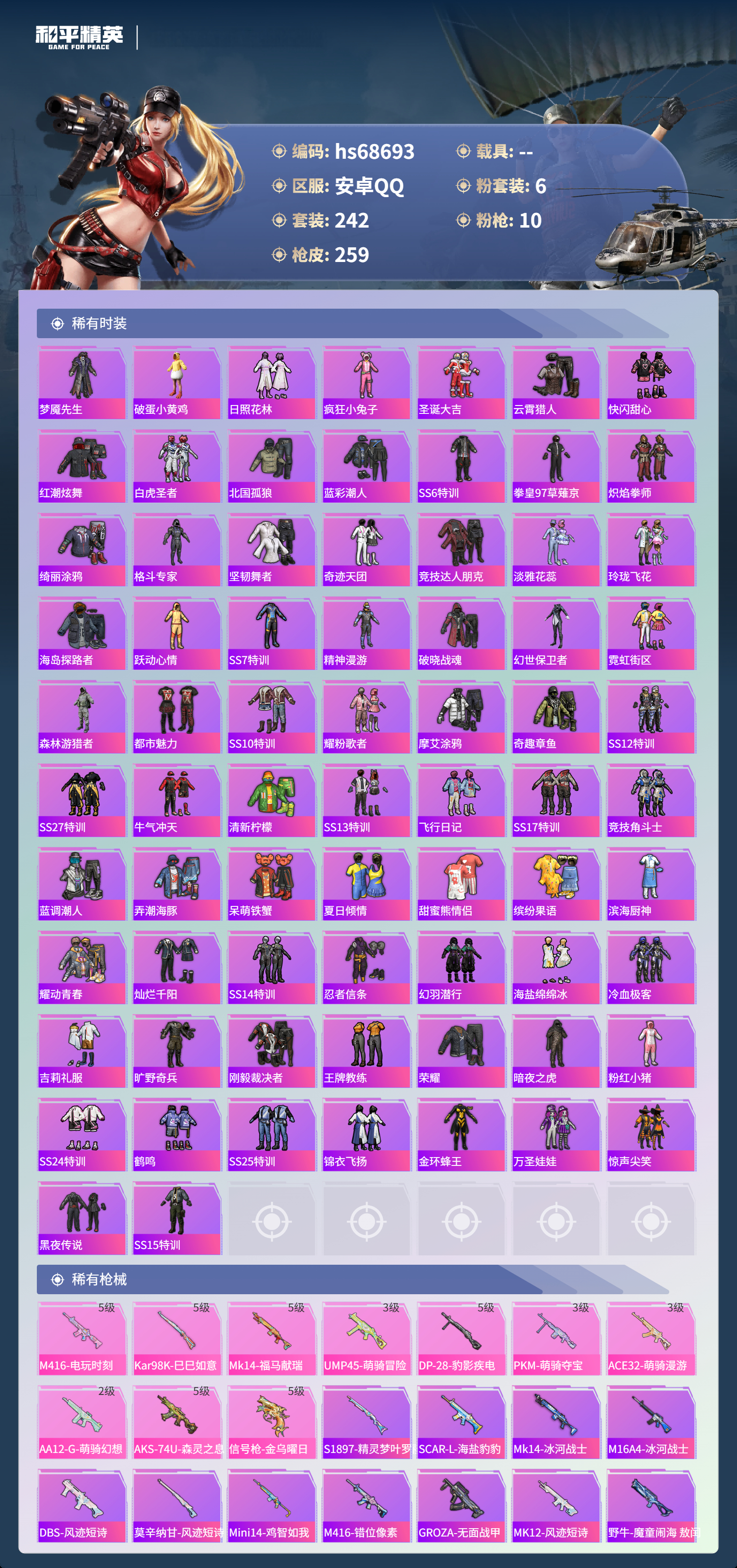 PX_2556541-,安卓手Q-14王牌印记-6粉装-10特效枪-78275热力值-242套装-259枪皮-1卓越印记