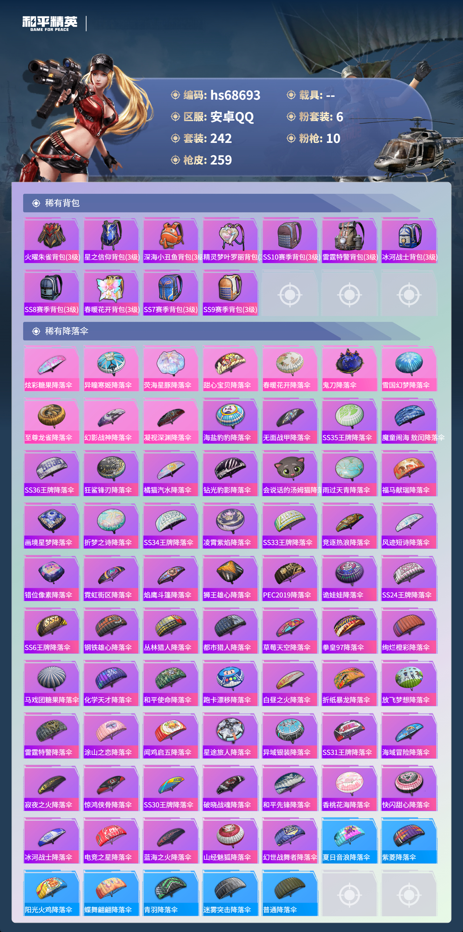 【75稀有降落伞】海盐豹豹降落伞,无面战甲降落伞,SS35王牌降落伞,魔童闹海,敖闰降落伞,SS36王牌降落伞,炫彩糖果降落伞,狂鲨锋刃降落伞,橘猫汽水降落伞,钻光豹影降落伞,会说话的汤姆猫降落伞,雨过天青降落伞,福马献瑞降落伞,画境星梦降落伞,折梦之诗降落伞,SS34王牌降落伞,异瞳寒姬降落伞,凌霄紫焰降落伞,SS33王牌降落伞,竞逐热浪降落伞,风迹短诗降落伞,荧海星豚降落伞,错位像素降落伞,霓虹街区降落伞,焰鹰斗篷降落伞,狮王雄心降落伞,PEC2019降落伞,诡娃娃降落伞,SS24王牌降落伞,甜心宝贝降落伞,夏日音浪降落伞,SS6王牌降落伞,紫菱降落伞,阳光火鸡降落伞,钢铁雄心降落伞,蝶舞翩翩降落伞,丛林猎人降落伞,都市猎人降落伞,草莓天空降落伞,青羽降落伞,拳皇97降落伞,绚烂橙彩降落伞,春暖花开降落伞,普通降落伞,马戏团糖果降落伞,化学天才降落伞,和平使命降落伞,跑卡漂移降落伞,白昼之火降落伞,折纸暴龙降落伞,放飞梦想降落伞,雷霆特警降落伞,迷雾突击降落伞,涂山之恋降落伞,闻鸡启五降落伞,鬼刀降落伞,星途旅人降落伞,异域银装降落伞,雪国幻梦降落伞,SS31王牌降落伞,海域冒险降落伞,寂夜之火降落伞,惊鸿侠骨降落伞,SS30王牌降落伞,破晓战魂降落伞,和平先锋降落伞,香桃花海降落伞,快闪甜心降落伞,至尊龙雀降落伞,幻影战神降落伞,凝视深渊降落伞,冰河战士降落伞,电竞之星降落伞,蓝海之火降落伞,山经魅狐降落伞,幻世战舞者降落伞