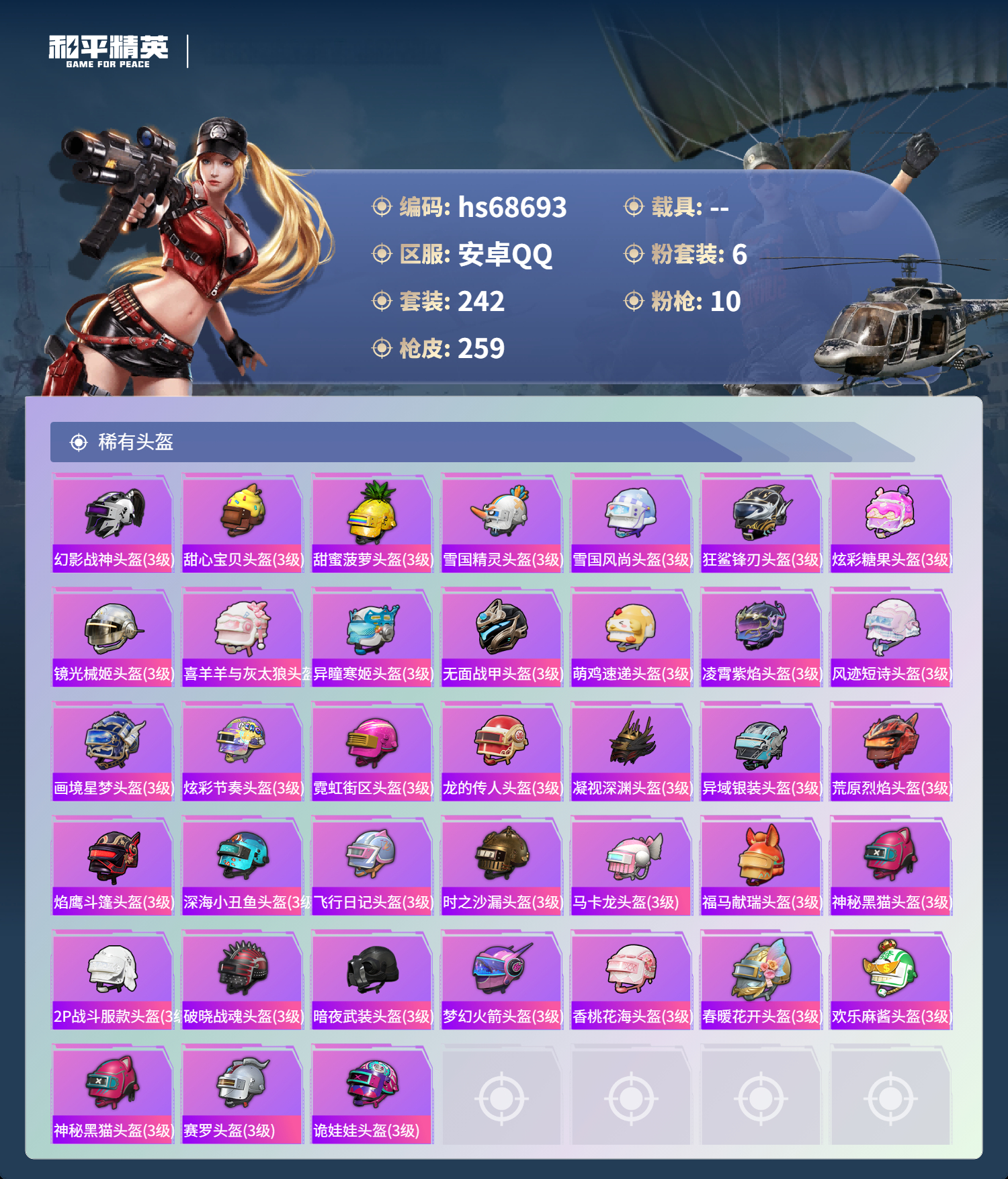 【38稀有头盔】幻影战神头盔(3级),甜心宝贝头盔(3级),甜蜜菠萝头盔(3级),雪国精灵头盔(3级),雪国风尚头盔(3级),狂鲨锋刃头盔(3级),炫彩糖果头盔(3级),镜光械姬头盔(3级),喜羊羊与灰太狼头盔(3级),异瞳寒姬头盔(3级),无面战甲头盔(3级),萌鸡速递头盔(3级),凌霄紫焰头盔(3级),风迹短诗头盔(3级),画境星梦头盔(3级),炫彩节奏头盔(3级),霓虹街区头盔(3级),龙的传人头盔(3级),凝视深渊头盔(3级),异域银装头盔(3级),荒原烈焰头盔(3级),焰鹰斗篷头盔(3级),深海小丑鱼头盔(3级),飞行日记头盔(3级),时之沙漏头盔(3级),马卡龙头盔(3级),福马献瑞头盔(3级),神秘黑猫头盔(3级),2P战斗服款头盔(3级),破晓战魂头盔(3级),暗夜武装头盔(3级),梦幻火箭头盔(3级),香桃花海头盔(3级),春暖花开头盔(3级),欢乐麻酱头盔(3级),神秘黑猫头盔(3级),赛罗头盔(3级),诡娃娃头盔(3级)
