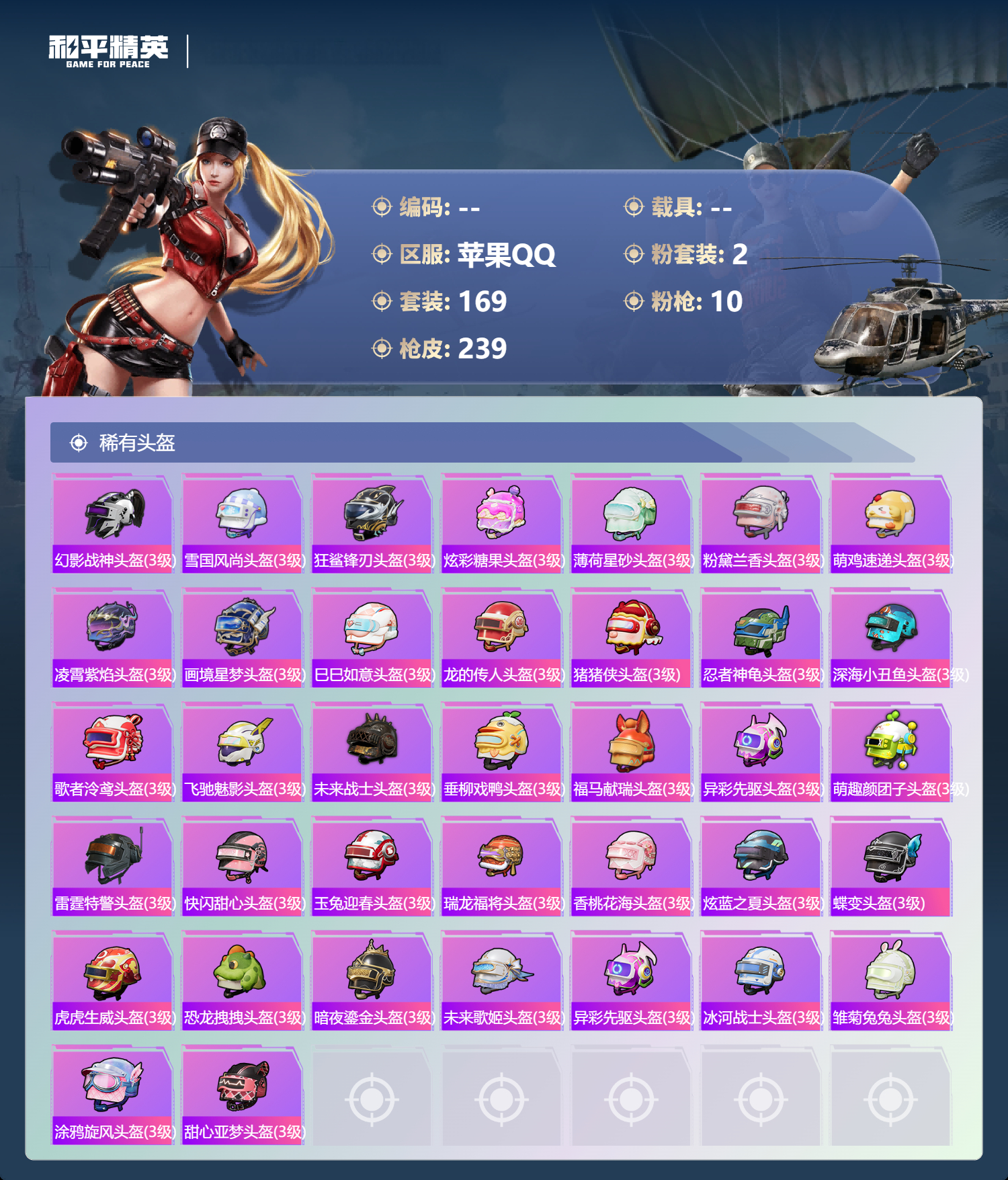 【37稀有头盔】幻影战神头盔(3级),雪国风尚头盔(3级),狂鲨锋刃头盔(3级),炫彩糖果头盔(3级),薄荷星砂头盔(3级),粉黛兰香头盔(3级),萌鸡速递头盔(3级),凌霄紫焰头盔(3级),画境星梦头盔(3级),巳巳如意头盔(3级),龙的传人头盔(3级),猪猪侠头盔(3级),忍者神龟头盔(3级),深海小丑鱼头盔(3级),歌者泠鸢头盔(3级),飞驰魅影头盔(3级),未来战士头盔(3级),垂柳戏鸭头盔(3级),福马献瑞头盔(3级),异彩先驱头盔(3级),萌趣颜团子头盔(3级),雷霆特警头盔(3级),快闪甜心头盔(3级),玉兔迎春头盔(3级),瑞龙福将头盔(3级),香桃花海头盔(3级),炫蓝之夏头盔(3级),蝶变头盔(3级),虎虎生威头盔(3级),恐龙拽拽头盔(3级),暗夜鎏金头盔(3级),未来歌姬头盔(3级),异彩先驱头盔(3级),冰河战士头盔(3级),雏菊兔兔头盔(3级),涂鸦旋风头盔(3级),甜心亚梦头盔(3级)