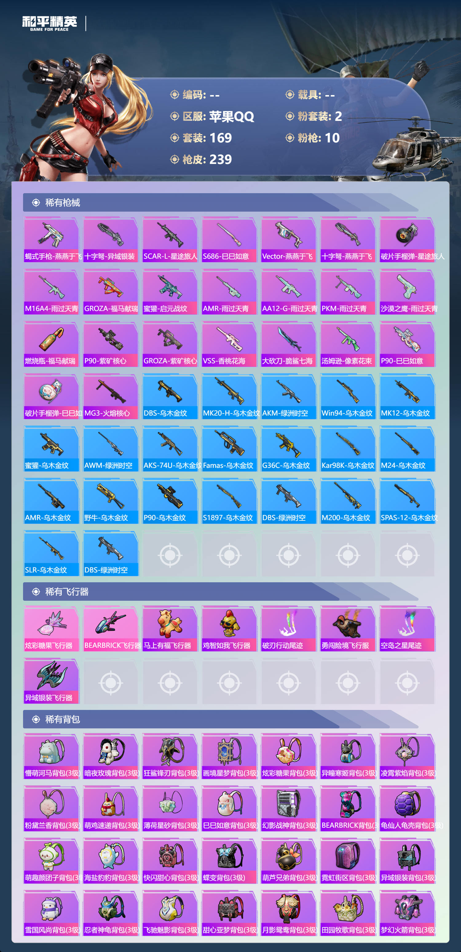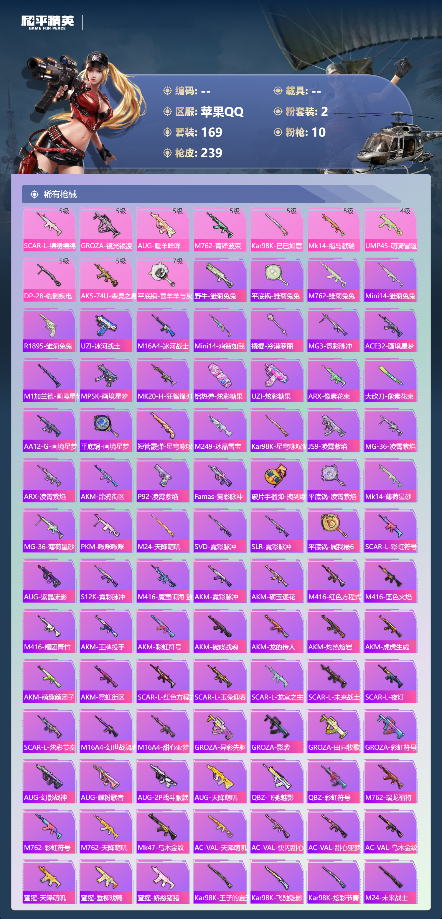 【240稀有枪械】SCAR-L-锦绣绵绵/5级,GROZA-镜光银凌/5级,AUG-暖羊咩咩/5级,M762-青锋波束/5级,Kar98K-巳巳如意/5级,Mk14-福马献瑞/5级,UMP45-萌骑冒险/4级,DP-28-豹影疾电/5级,AKS-74U-森灵之息/5级,平底锅-喜羊羊与灰太狼/7级,DBS-乌木金纹,野牛-雏菊兔兔,平底锅-雏菊兔兔,M762-雏菊兔兔,Mini14-雏菊兔兔,R1895-雏菊兔兔,UZI-冰河战士,M16A4-冰河战士,MK20-H-乌木金纹,Mini14-鸡智如我,AKM-绿洲时空,Win94-乌木金纹,MK12-乌木金纹,撬棍-冷漠罗丽,MG3-霓彩脉冲,ACE32-画境星梦,M1加兰德-画境星梦,MP5K-画境星梦,蜜獾-乌木金纹,AWM-绿洲时空,MK20-H-狂鲨锋刃,铝热弹-炫彩糖果,UZI-炫彩糖果,ARX-像素花束,大砍刀-像素花束,AA12-G-画境星梦,平底锅-画境星梦,短管霰弹-星穹咏叹调,M249-冰晶雪宝,Kar98K-星穹咏叹调,JS9-凌霄紫焰,MG-36-凌霄紫焰,ARX-凌霄紫焰,AKS-74U-乌木金纹,AKM-涂鸦街区,P92-凌霄紫焰,Famas-乌木金纹,Famas-霓彩脉冲,破片手榴弹-拽到爆炸,平底锅-凌霄紫焰,Mk14-薄荷星砂,MG-36-薄荷星砂,PKM-啾咪啾咪,M24-天降萌叽,SVD-霓彩脉冲,SLR-霓彩脉冲,平底锅-属我最6,SCAR-L-彩虹符号,AUG-紫晶流影,S12K-霓彩脉冲,M416-魔童闹海,敖闰,AKM-霓彩脉冲,AKM-砺玉逐花,M416-红色方程式,M416-蓝色火焰,M416-糯团青竹,AKM-王牌投手,AKM-彩虹符号,AKM-破晓战魂,AKM-龙的传人,AKM-灼热熔岩,AKM-虎虎生威,AKM-萌趣颜团子,AKM-霓虹街区,SCAR-L-红色方程式,SCAR-L-玉兔迎春,SCAR-L-龙宫之主,SCAR-L-未来战士,SCAR-L-夜灯,SCAR-L-炫彩节奏,M16A4-幻世战舞者,M16A4-甜心亚梦,GROZA-异彩先驱,GROZA-影袭,GROZA-田园牧歌,GROZA-彩虹符号,AUG-幻影战神,AUG-耀粉歌者,AUG-2P战斗服款,AUG-天降萌叽,QBZ-飞驰魅影,QBZ-彩虹符号,M762-瑞龙福将,M762-彩虹符号,M762-天降萌叽,Mk47-乌木金纹,G36C-乌木金纹,AC-VAL-天降萌叽,AC-VAL-快闪甜心,AC-VAL-甜心亚梦,AC-VAL-乌木金纹,蜜獾-天降萌叽,蜜獾-垂柳戏鸭,蜜獾-娇憨猪猪,Kar98K-乌木金纹,Kar98K-王子的夏天,Kar98K-飞驰魅影,Kar98K-炫彩节奏,M24-乌木金纹,M24-未来战士,M24-炫彩节奏,AWM-黄金龙骨,AWM-雷霆特警,Win94-瑞龙福将,Win94-星兔领航员,莫辛纳甘-乌木金纹,莫辛纳甘-炙焰牛王,AMR-暗夜行者,AMR-乌木金纹,M200-惊鸿侠骨,SKS-金玉无双,SKS-青丘仙客,SKS-夜幕颂歌,SKS-糯团青竹,SKS-未来歌姬,SKS-炫彩节奏,VSS-田园牧歌,VSS-彩虹符号,Mini14-金玉无双,Mini14-耀粉歌者,Mini14-炫彩节奏,Mini14-异彩先驱,Mk14-乌木金纹,SLR-娇憨猪猪,M417-惊鸿侠骨,MK20-H-快闪甜心,UZI-炫彩节奏,UZI-红色方程式,UZI-幻影战神,UZI-金玉无双,UZI-娇憨猪猪,UZI-天降萌叽,UZI-啾咪啾咪,UMP45-生命誓言,UMP45-夜灯,UMP45-猪猪侠,Vector-生命誓言,Vector-金玉无双,Vector-田园牧歌,汤姆逊-天降萌叽,汤姆逊-幻影战神,汤姆逊-异彩先驱,汤姆逊-炫彩节奏,汤姆逊-环太平洋,野牛-乌木金纹,野牛-夜灯,MP5K-异彩先驱,P90-乌木金纹,P90-快闪甜心,P90-飞驰魅影,S686-奇异狩猎者,S686-生命誓言,S1897-神秘黑猫,S1897-乌木金纹,S1897-炫彩节奏,S1897-飞驰魅影,S1897-暗夜鎏金,S12K-玩趣呆呆,S12K-幻世战舞者,S12K-幻影战神,S12K-瑞龙福将,S12K-娇憨猪猪,S12K-龙宫之主,S12K-夜灯,DBS-第五大道,DBS-甜心亚梦,SPAS-12-田园牧歌,M249-破晓战魂,M249-彩虹符号,M249-糯团青竹,DP-28-彩虹符号,DP-28-甜心亚梦,MG3-惊鸿侠骨,MG3-幻世战舞者,MG3-乌木金纹,MG3-瑞龙福将,沙漠之鹰-王牌投手,沙漠之鹰-快闪甜心,平底锅-惊鸿侠骨,平底锅-空岛之星,平底锅-光之冒险,平底锅-飞驰魅影,平底锅-田园牧歌,平底锅-飞行日记,平底锅-娇憨猪猪,平底锅-甜心亚梦,平底锅-快闪甜心,平底锅-异彩先驱,平底锅-瑞龙福将,撬棍-幻世战舞者,爆炸猎弓-惊鸿侠骨,破片手榴弹-呆爆全场,破片手榴弹-萌趣颜团子,DBS-绿洲时空,MG3-火熔核心,AC-VAL-荒原烈焰,S686-千金淑猫,ACE32-冰晶雪宝,莫辛纳甘-辉光之愿,UMP45-绒宝小鹅,MK20-H-星途旅人,野牛-燕燕于飞,M200-乌木金纹,SPAS-12-燕燕于飞,蝎式手枪-燕燕于飞,十字弩-异域银装,SCAR-L-星途旅人,S686-巳巳如意,SPAS-12-乌木金纹,Vector-燕燕于飞,十字弩-燕燕于飞,破片手榴弹-星途旅人,M16A4-雨过天青,GROZA-福马献瑞,蜜獾-启元战纹,AMR-雨过天青,SLR-乌木金纹,AA12-G-雨过天青,PKM-雨过天青,沙漠之鹰-雨过天青,燃烧瓶-福马献瑞,P90-紫矿核心,GROZA-紫矿核心,VSS-香桃花海,大砍刀-脆鲨七海,汤姆逊-像素花束,P90-巳巳如意,破片手榴弹-巳巳如意,DBS-绿洲时空,MG3-火熔核心