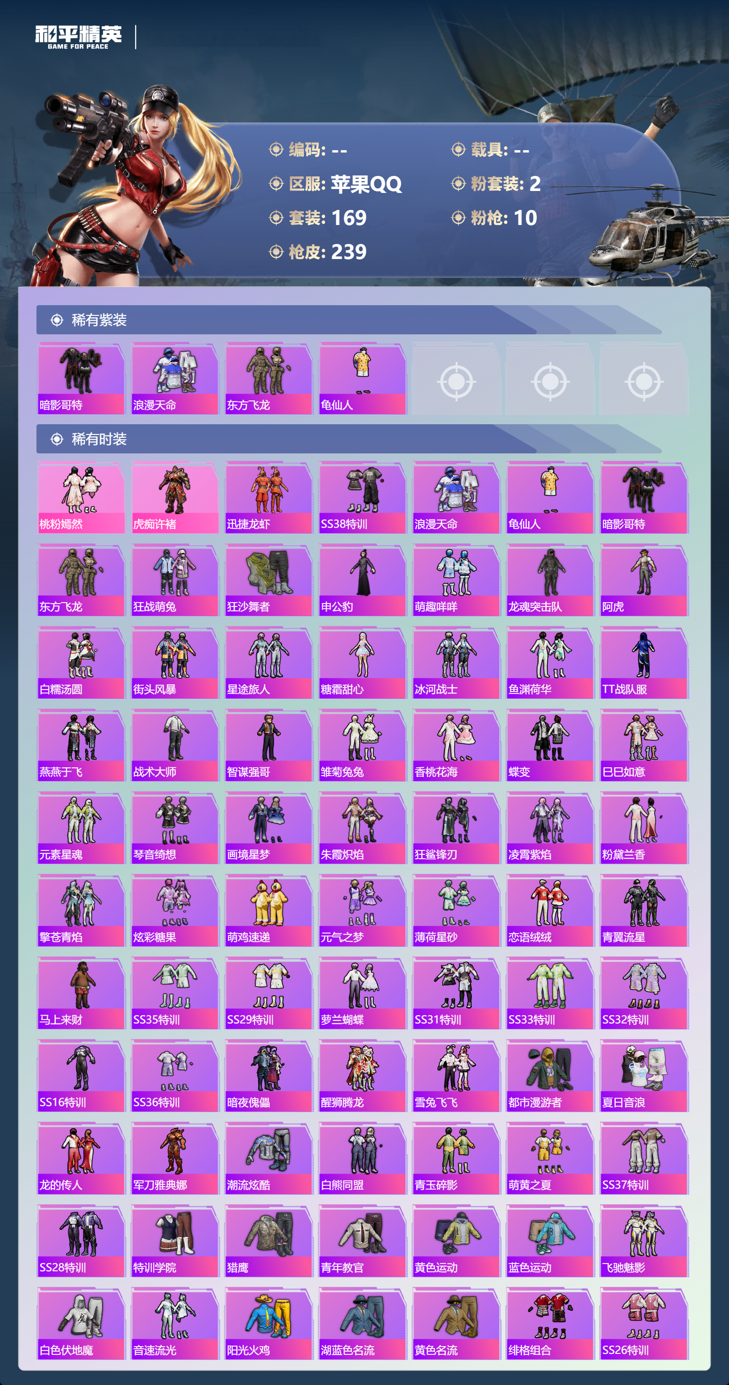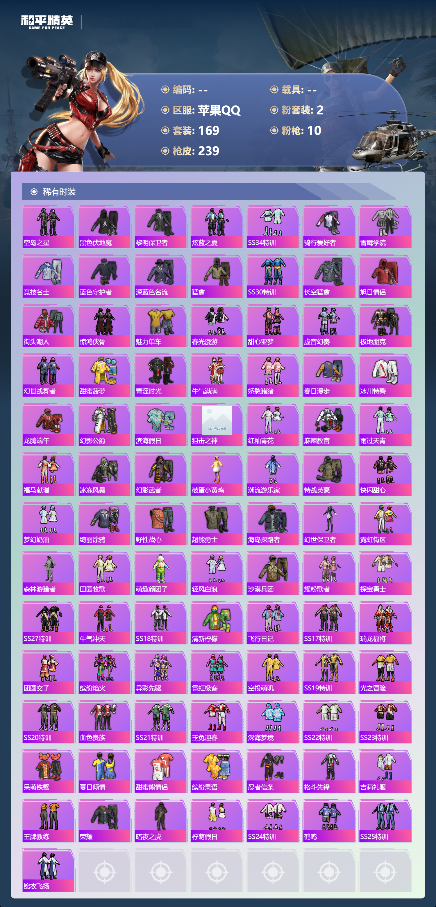 【169稀有时装】桃粉嫣然,虎痴许褚,迅捷龙虾,SS38特训,浪漫天命,龟仙人,暗影哥特,东方飞龙,狂战萌兔,狂沙舞者,申公豹,萌趣咩咩,龙魂突击队,阿虎,白糯汤圆,街头风暴,星途旅人,糖霜甜心,冰河战士,鱼渊荷华,TT战队服,燕燕于飞,战术大师,智谋强哥,雏菊兔兔,香桃花海,蝶变,巳巳如意,元素星魂,琴音绮想,画境星梦,朱霞炽焰,狂鲨锋刃,凌霄紫焰,粉黛兰香,擎苍青焰,炫彩糖果,萌鸡速递,元气之梦,薄荷星砂,恋语绒绒,青翼流星,马上来财,SS35特训,SS29特训,萝兰蝴蝶,SS31特训,SS33特训,SS32特训,SS16特训,SS36特训,暗夜傀儡,醒狮腾龙,雪兔飞飞,都市漫游者,夏日音浪,龙的传人,军刀雅典娜,潮流炫酷,白熊同盟,青玉碎影,萌黄之夏,SS37特训,SS28特训,特训学院,猎鹰,青年教官,黄色运动,蓝色运动,飞驰魅影,白色伏地魔,音速流光,阳光火鸡,湖蓝色名流,黄色名流,绯格组合,SS26特训,空岛之星,黑色伏地魔,黎明保卫者,炫蓝之夏,SS34特训,骑行爱好者,雪鹰学院,竞技名士,蓝色守护者,深蓝色名流,猛禽,SS30特训,长空猛禽,旭日情侣,街头潮人,惊鸿侠骨,魅力单车,春光漫游,甜心亚梦,虚音幻奏,极地朋克,幻世战舞者,甜蜜菠萝,青涩时光,牛气满满,娇憨猪猪,春日漫步,冰川特警,龙腾端午,幻影公爵,滨海假日,狙击之神,红釉青花,麻辣教官,雨过天青,福马献瑞,冰冻风暴,幻影武者,破蛋小黄鸡,潮流游乐家,特战英豪,快闪甜心,梦幻奶油,绮丽涂鸦,野性战心,超能勇士,海岛探路者,幻世保卫者,霓虹街区,森林游猎者,田园牧歌,萌趣颜团子,轻风白浪,沙漠兵团,耀粉歌者,探宝勇士,SS27特训,牛气冲天,SS18特训,清新柠檬,飞行日记,SS17特训,瑞龙福将,团圆交子,缤纷焰火,异彩先驱,霓虹极客,空投萌叽,SS19特训,光之冒险,SS20特训,血色贵族,SS21特训,玉兔迎春,深海梦境,SS22特训,SS23特训,呆萌铁蟹,夏日倾情,甜蜜熊情侣,缤纷果语,忍者信条,格斗先锋,吉莉礼服,王牌教练,荣耀,暗夜之虎,柠萌假日,SS24特训,鹤鸣,SS25特训,锦衣飞扬