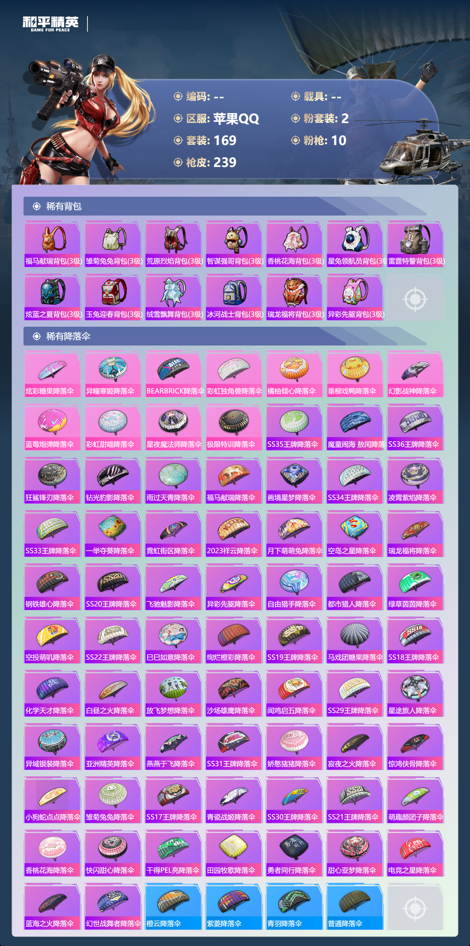【76稀有降落伞】SS35王牌降落伞,魔童闹海,敖闰降落伞,SS36王牌降落伞,炫彩糖果降落伞,狂鲨锋刃降落伞,钻光豹影降落伞,雨过天青降落伞,福马献瑞降落伞,画境星梦降落伞,SS34王牌降落伞,异瞳寒姬降落伞,凌霄紫焰降落伞,SS33王牌降落伞,一举夺葵降落伞,霓虹街区降落伞,BEARBRICK降落伞,彩虹独角兽降落伞,2023祥云降落伞,橙云降落伞,月下萌萌兔降落伞,空岛之星降落伞,紫菱降落伞,瑞龙福将降落伞,钢铁雄心降落伞,SS20王牌降落伞,飞驰魅影降落伞,异彩先驱降落伞,自由猎手降落伞,都市猎人降落伞,绿草茵茵降落伞,青羽降落伞,空投萌叽降落伞,SS22王牌降落伞,巳巳如意降落伞,绚烂橙彩降落伞,SS19王牌降落伞,普通降落伞,马戏团糖果降落伞,SS18王牌降落伞,化学天才降落伞,白昼之火降落伞,放飞梦想降落伞,沙场雄鹰降落伞,闻鸡启五降落伞,SS29王牌降落伞,星途旅人降落伞,异域银装降落伞,亚洲精英降落伞,燕燕于飞降落伞,SS31王牌降落伞,娇憨猪猪降落伞,寂夜之火降落伞,橘柚倾心降落伞,惊鸿侠骨降落伞,小狗蛇点点降落伞,垂柳戏鸭降落伞,雏菊兔兔降落伞,SS17王牌降落伞,青瓷战姬降落伞,SS30王牌降落伞,SS21王牌降落伞,萌趣颜团子降落伞,香桃花海降落伞,快闪甜心降落伞,干得PEL亮降落伞,幻影战神降落伞,田园牧歌降落伞,勇者同行降落伞,蓝莓炮弹降落伞,彩虹甜喵降落伞,甜心亚梦降落伞,电竞之星降落伞,蓝海之火降落伞,幻世战舞者降落伞,星夜魔法师降落伞,极限特训降落伞