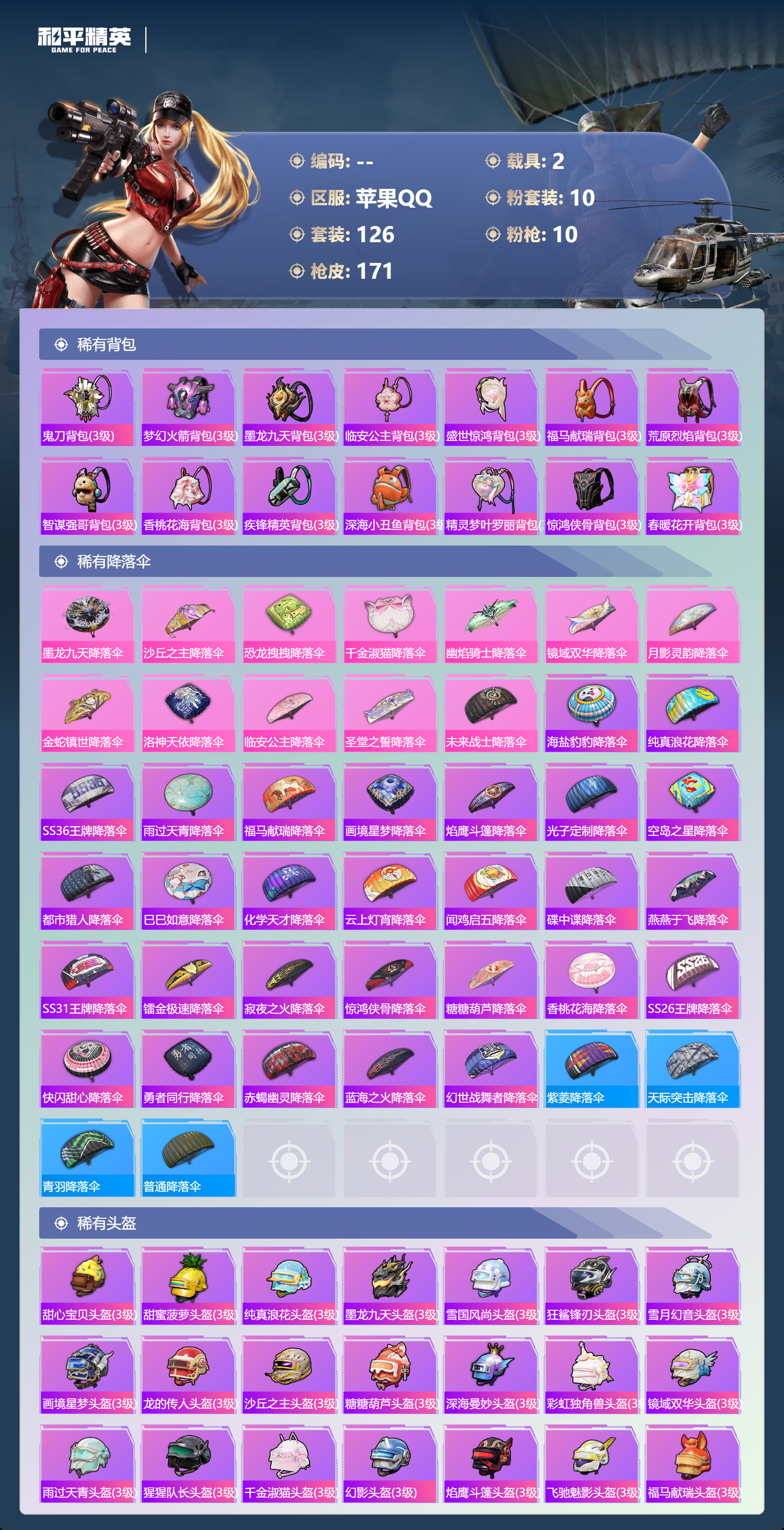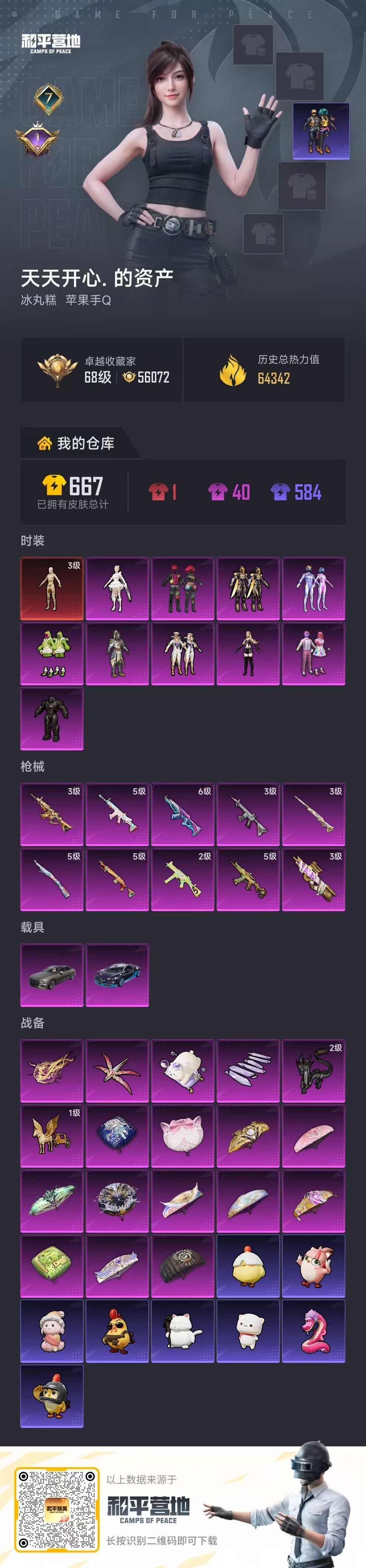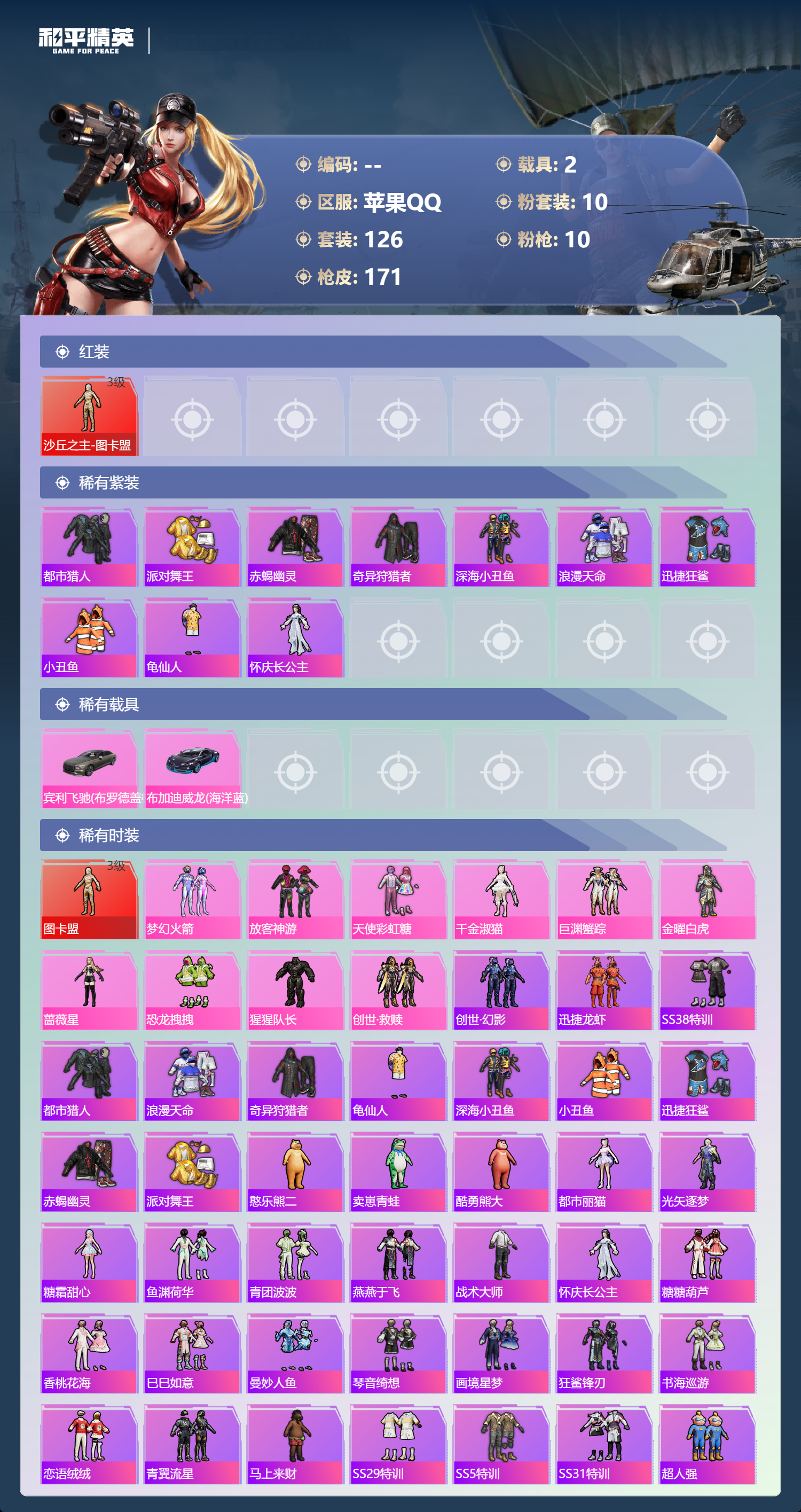 PX_2556558-,苹果手Q-7王牌印记-1红装-10粉装-10特效枪-2载具-64342热力值-126套装-171枪皮-1卓越印记