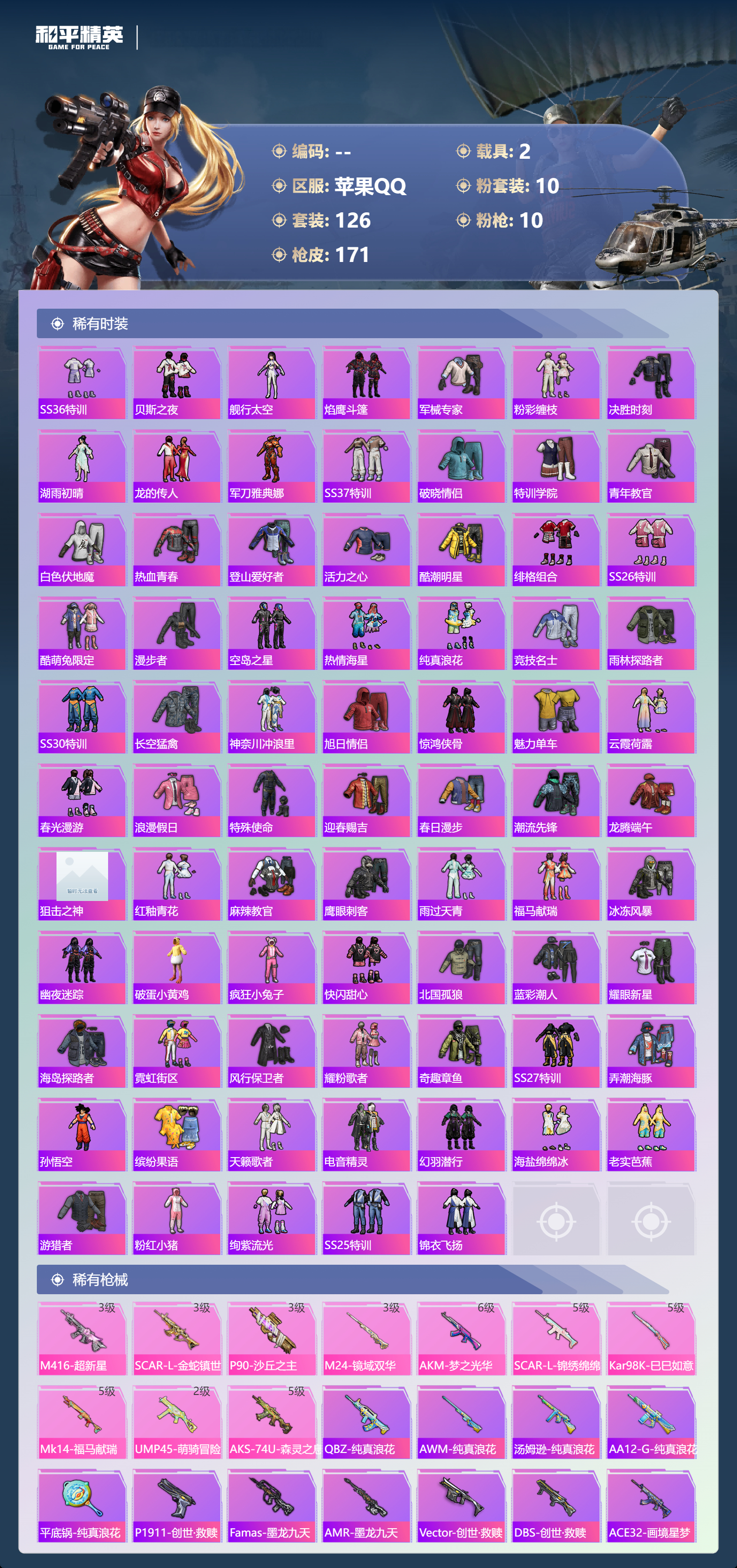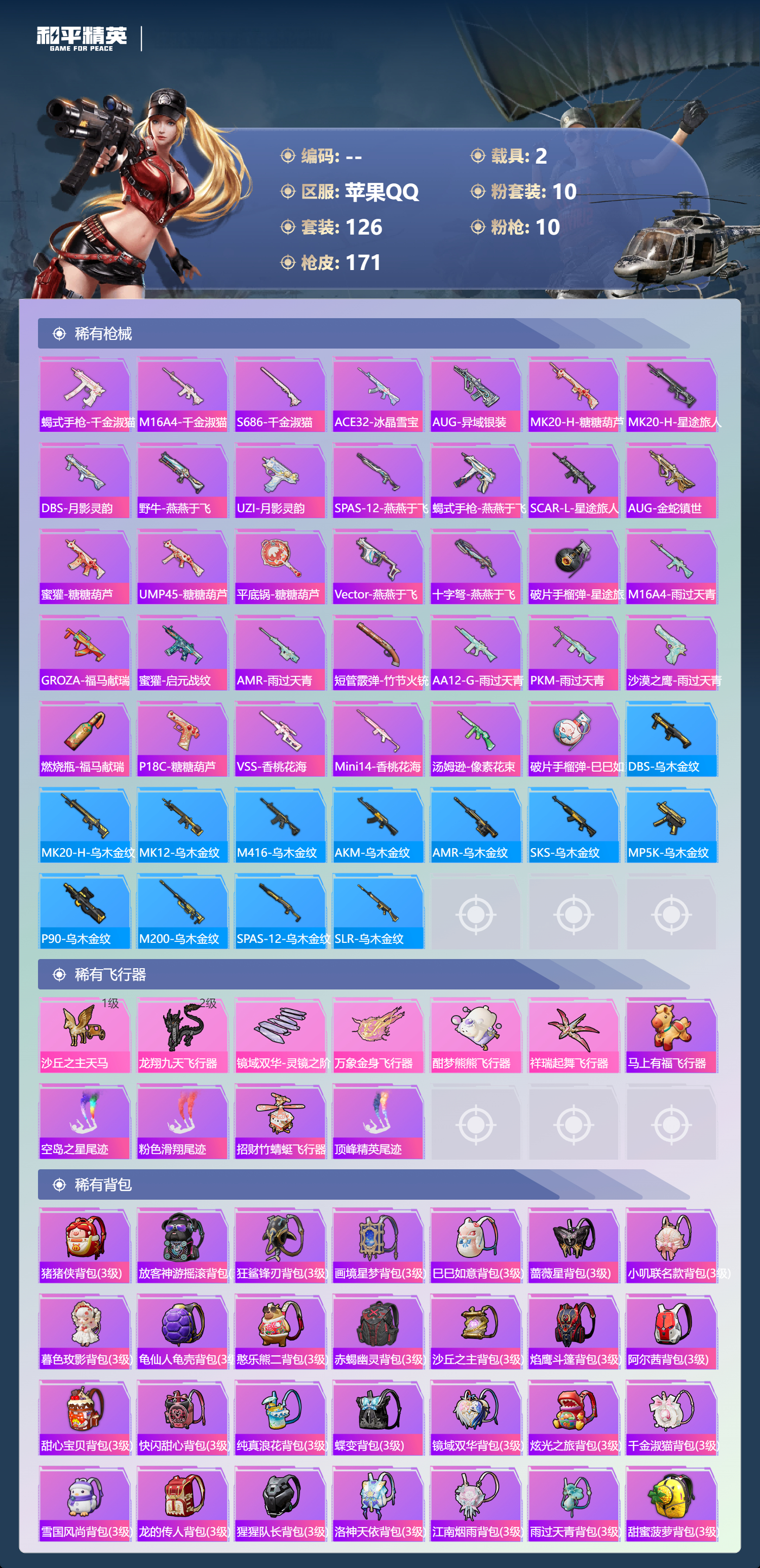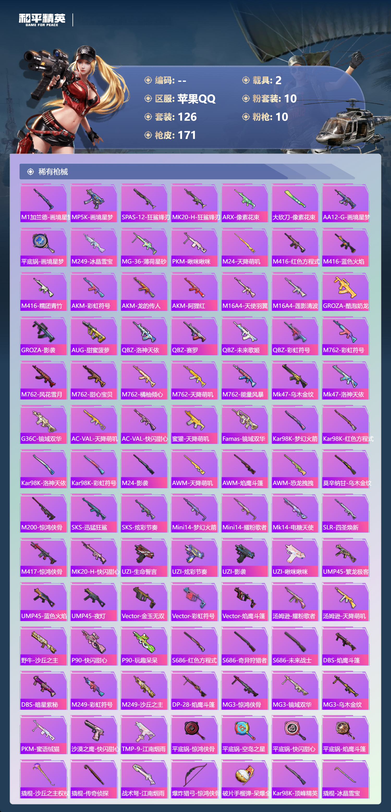 【165稀有枪械】M416-超新星/3级,SCAR-L-金蛇镇世/3级,P90-沙丘之主/3级,M24-镜域双华/3级,AKM-梦之光华/6级,SCAR-L-锦绣绵绵/5级,Kar98K-巳巳如意/5级,Mk14-福马献瑞/5级,UMP45-萌骑冒险/2级,AKS-74U-森灵之息/5级,QBZ-纯真浪花,AWM-纯真浪花,汤姆逊-纯真浪花,DBS-乌木金纹,AA12-G-纯真浪花,平底锅-纯真浪花,P1911-创世·救赎,Famas-墨龙九天,AMR-墨龙九天,Vector-创世·救赎,DBS-创世·救赎,MK20-H-乌木金纹,MK12-乌木金纹,ACE32-画境星梦,M1加兰德-画境星梦,MP5K-画境星梦,SPAS-12-狂鲨锋刃,MK20-H-狂鲨锋刃,ARX-像素花束,大砍刀-像素花束,AA12-G-画境星梦,平底锅-画境星梦,M249-冰晶雪宝,MG-36-薄荷星砂,PKM-啾咪啾咪,M24-天降萌叽,M416-红色方程式,M416-乌木金纹,M416-蓝色火焰,M416-糯团青竹,AKM-乌木金纹,AKM-彩虹符号,AKM-龙的传人,AKM-阿狸红,M16A4-天使羽翼,M16A4-莲影清波,GROZA-酷泡奶龙,GROZA-影袭,AUG-甜蜜菠萝,QBZ-洛神天依,QBZ-赛罗,QBZ-未来歌姬,QBZ-彩虹符号,M762-彩虹符号,M762-风花雪月,M762-甜心宝贝,M762-橘柚倾心,M762-天降萌叽,M762-能量风暴,Mk47-乌木金纹,Mk47-洛神天依,G36C-镜域双华,AC-VAL-天降萌叽,AC-VAL-快闪甜心,蜜獾-天降萌叽,Famas-镜域双华,Kar98K-梦幻火箭,Kar98K-红色方程式,Kar98K-洛神天依,Kar98K-彩虹符号,M24-影袭,AWM-天降萌叽,AWM-焰鹰斗篷,AWM-恐龙拽拽,莫辛纳甘-乌木金纹,AMR-乌木金纹,M200-惊鸿侠骨,SKS-迅猛狂鲨,SKS-乌木金纹,SKS-炫彩节奏,Mini14-梦幻火箭,Mini14-耀粉歌者,Mk14-电糖天使,SLR-四圣焕新,M417-惊鸿侠骨,MK20-H-快闪甜心,UZI-生命誓言,UZI-炫彩节奏,UZI-影袭,UZI-啾咪啾咪,UMP45-繁龙极客,UMP45-蓝色火焰,UMP45-夜灯,Vector-金玉无双,Vector-彩虹符号,Vector-焰鹰斗篷,汤姆逊-耀粉歌者,汤姆逊-天降萌叽,野牛-沙丘之主,MP5K-乌木金纹,P90-乌木金纹,P90-快闪甜心,P90-玩趣呆呆,S686-红色方程式,S686-奇异狩猎者,S686-未来战士,DBS-焰鹰斗篷,DBS-暗星紫秘,M249-彩虹符号,M249-沙丘之主,DP-28-焰鹰斗篷,MG3-惊鸿侠骨,MG3-镜域双华,MG3-乌木金纹,PKM-蜜语绒猫,沙漠之鹰-快闪甜心,TMP-9-江南烟雨,平底锅-惊鸿侠骨,平底锅-空岛之星,平底锅-快闪甜心,平底锅-焰鹰斗篷,撬棍-沙丘之主权杖,撬棍-传奇侦探,战术弩-江南烟雨,爆炸猎弓-惊鸿侠骨,破片手榴弹-呆爆全场,Kar98K-顶峰精英,撬棍-冰晶雪宝,蝎式手枪-千金淑猫,M16A4-千金淑猫,S686-千金淑猫,ACE32-冰晶雪宝,AUG-异域银装,MK20-H-糖糖葫芦,MK20-H-星途旅人,DBS-月影灵韵,野牛-燕燕于飞,UZI-月影灵韵,M200-乌木金纹,SPAS-12-燕燕于飞,蝎式手枪-燕燕于飞,SCAR-L-星途旅人,AUG-金蛇镇世,蜜獾-糖糖葫芦,UMP45-糖糖葫芦,SPAS-12-乌木金纹,平底锅-糖糖葫芦,Vector-燕燕于飞,十字弩-燕燕于飞,破片手榴弹-星途旅人,M16A4-雨过天青,GROZA-福马献瑞,蜜獾-启元战纹,AMR-雨过天青,短管霰弹-竹节火铳,SLR-乌木金纹,AA12-G-雨过天青,PKM-雨过天青,沙漠之鹰-雨过天青,燃烧瓶-福马献瑞,P18C-糖糖葫芦,VSS-香桃花海,Mini14-香桃花海,汤姆逊-像素花束,破片手榴弹-巳巳如意