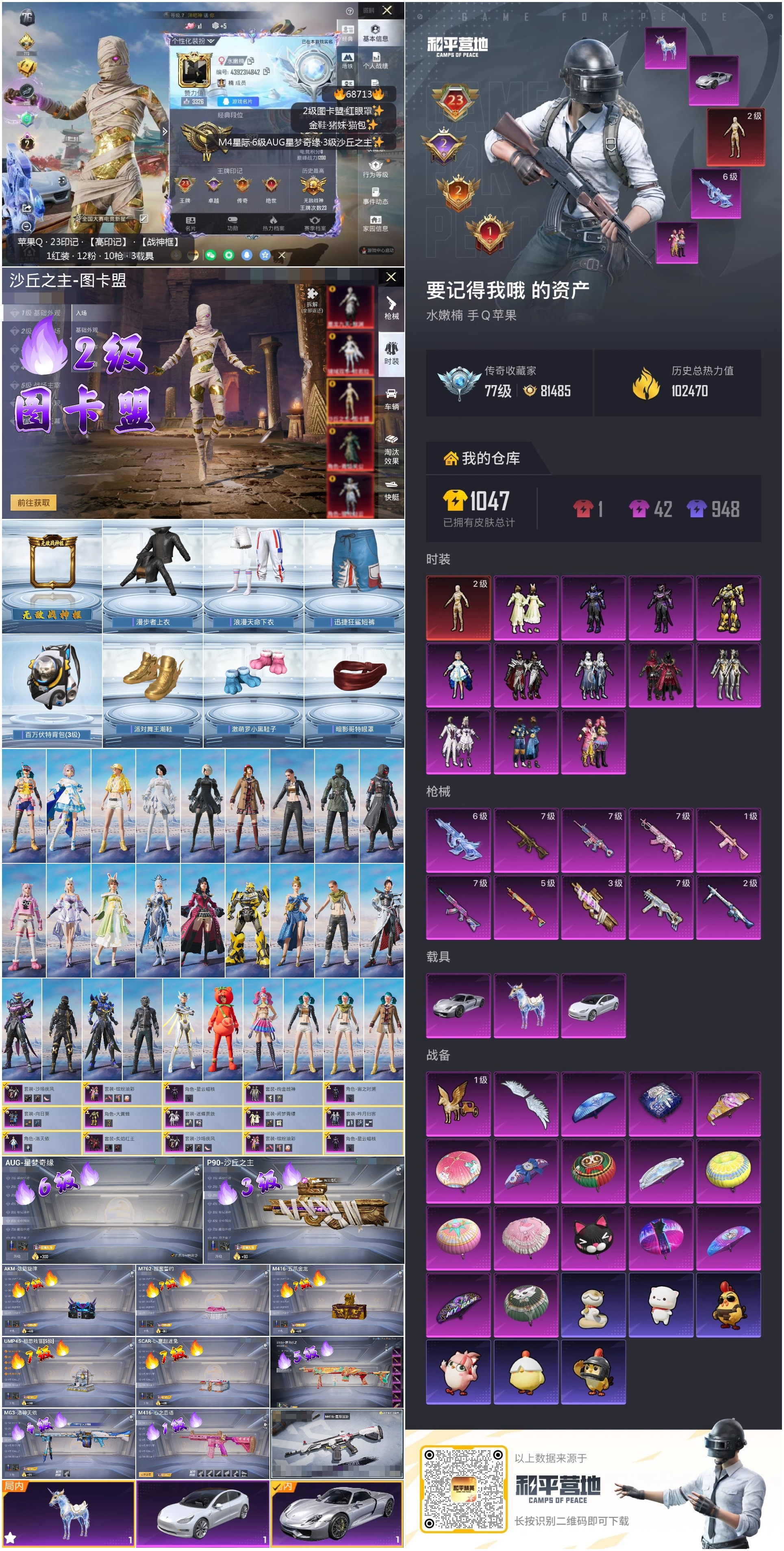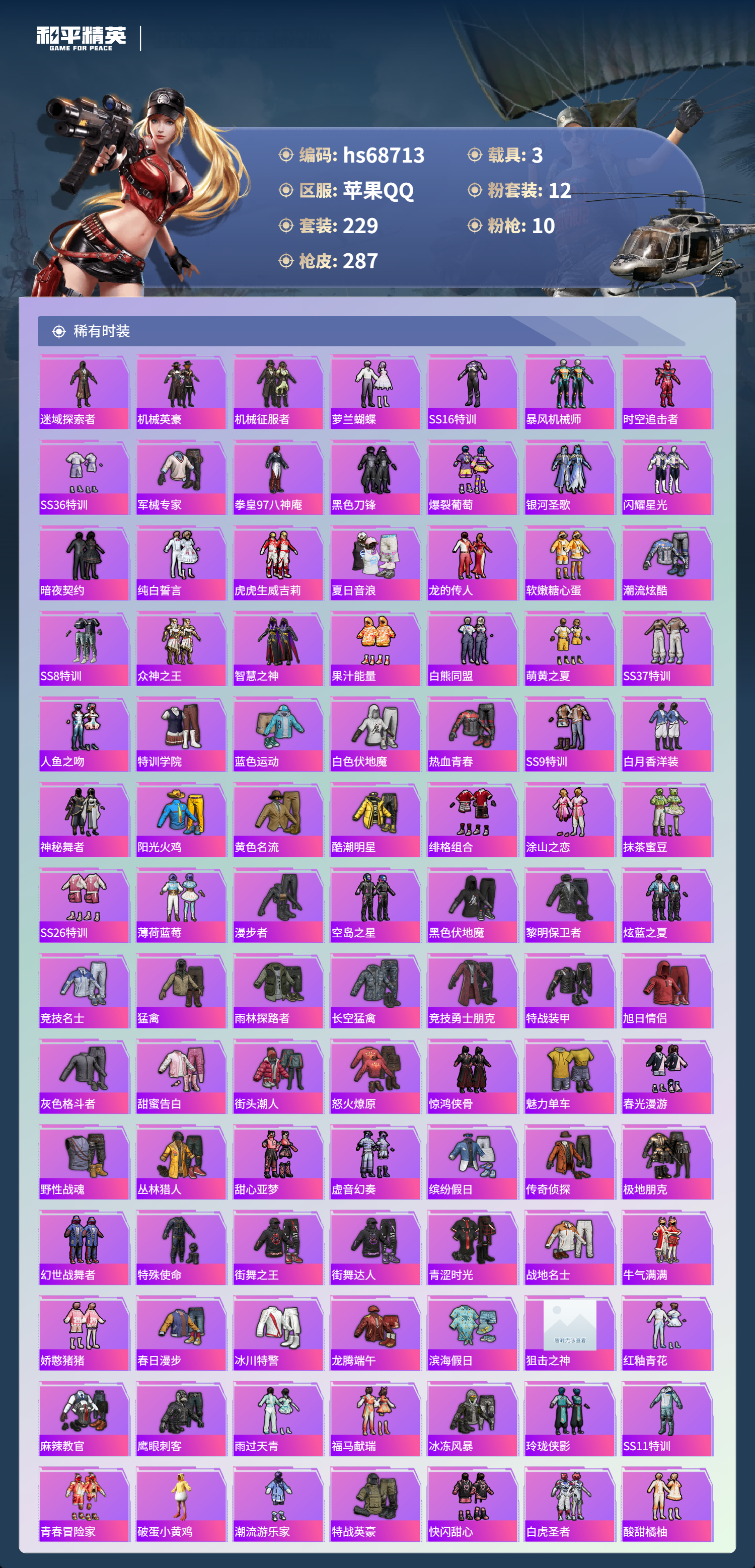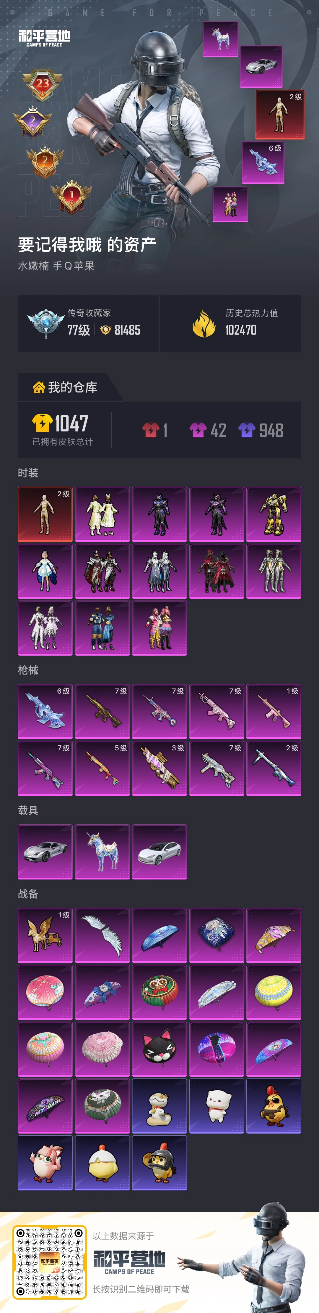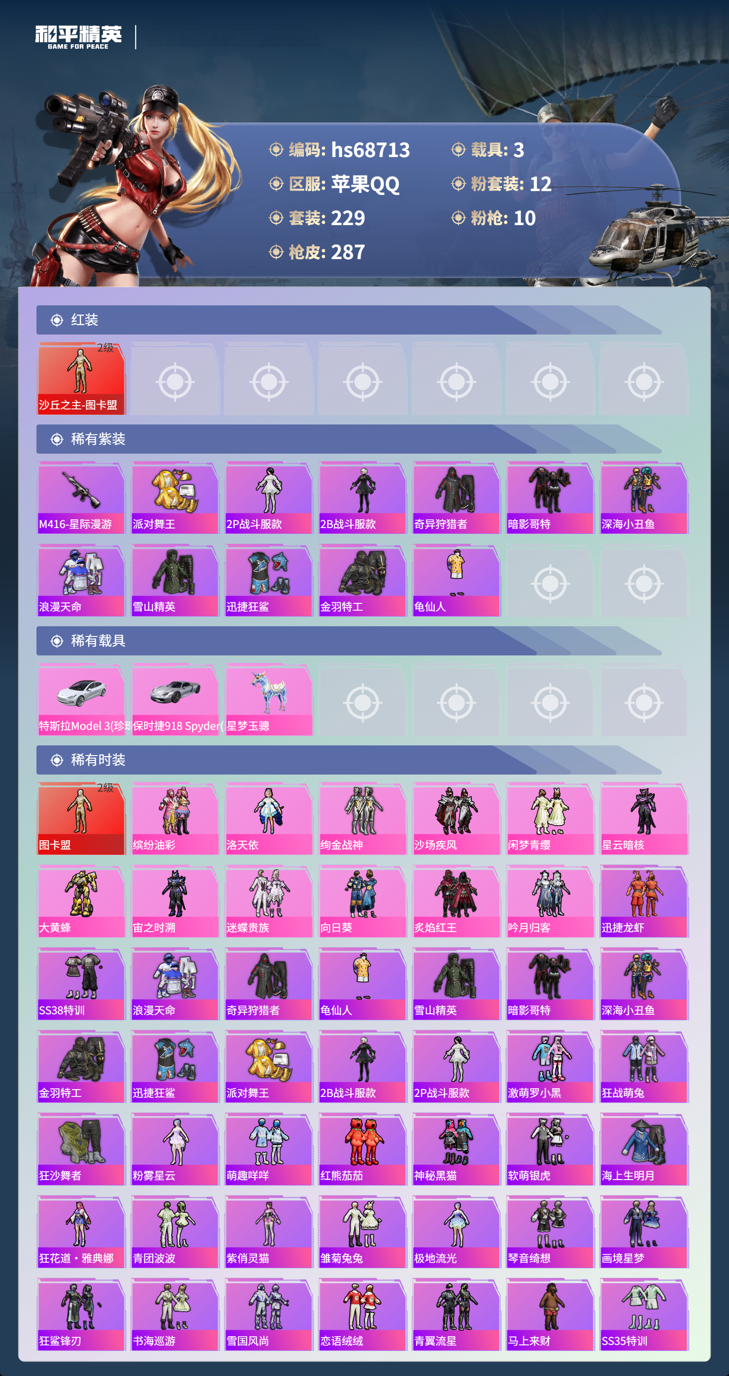 PX_2556553-,苹果手Q-23王牌印记-有战神框-1红装-12粉装-10特效枪-3载具-热力值-229套装-287枪皮-2卓越印记-2传奇印记