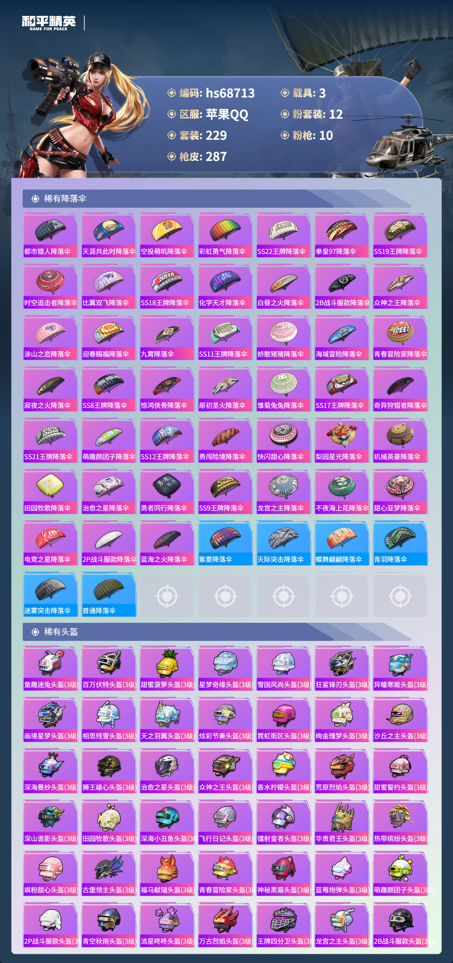 【46稀有头盔】童趣迷兔头盔(3级),百万伏特头盔(3级),甜蜜菠萝头盔(3级),星梦奇缘头盔(3级),雪国风尚头盔(3级),狂鲨锋刃头盔(3级),异瞳寒姬头盔(3级),画境星梦头盔(3级),相思残雪头盔(3级),天之羽翼头盔(3级),炫彩节奏头盔(3级),霓虹街区头盔(3级),绚金瑰梦头盔(3级),沙丘之主头盔(3级),深海曼妙头盔(3级),狮王雄心头盔(3级),治愈之星头盔(3级),众神之王头盔(3级),香水柠檬头盔(3级),荒原烈焰头盔(3级),甜蜜誓约头盔(3级),深山诡影头盔(3级),田园牧歌头盔(3级),深海小丑鱼头盔(3级),飞行日记头盔(3级),镭射皇者头盔(3级),华贵君王头盔(3级),热带缤纷头盔(3级),飒粉甜心头盔(3级),古堡领主头盔(3级),福马献瑞头盔(3级),青春冒险家头盔(3级),神秘黑猫头盔(3级),蓝莓炮弹头盔(3级),萌趣颜团子头盔(3级),2P战斗服款头盔(3级),青空秋雨头盔(3级),流星咚咚头盔(3级),万古烈焰头盔(3级),王牌四分卫头盔(3级),龙宫之主头盔(3级),2B战斗服款头盔(3级),神秘黑猫头盔(3级),拳皇97头盔(3级),洛神天依头盔(3级),天启纪元头盔(3级)