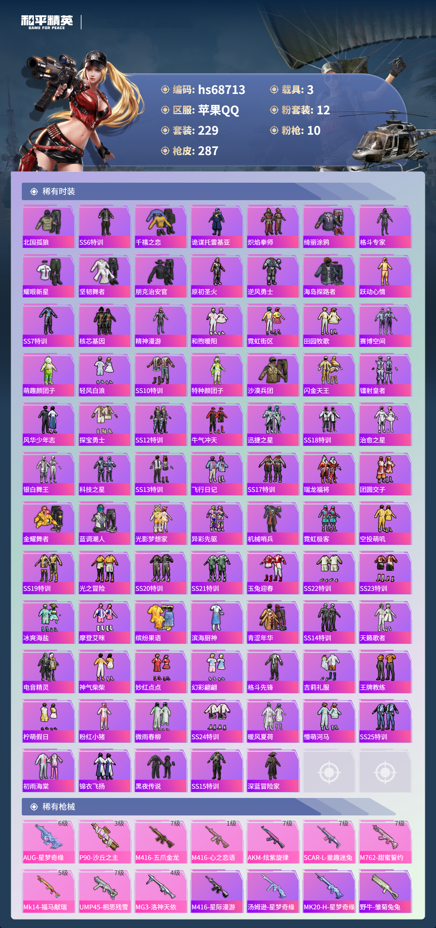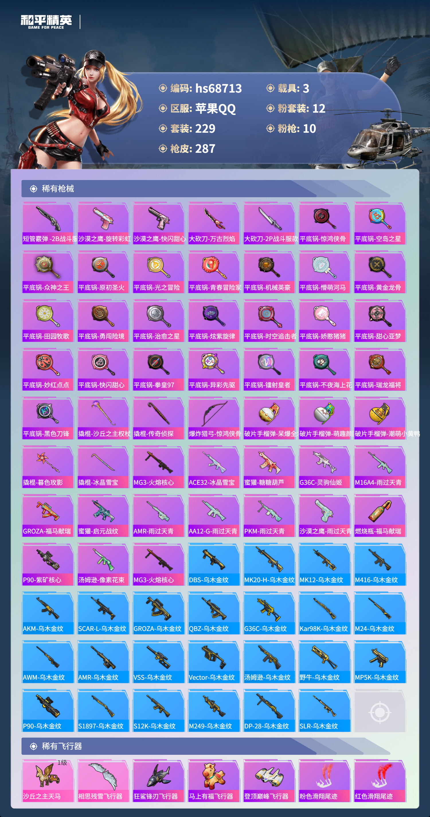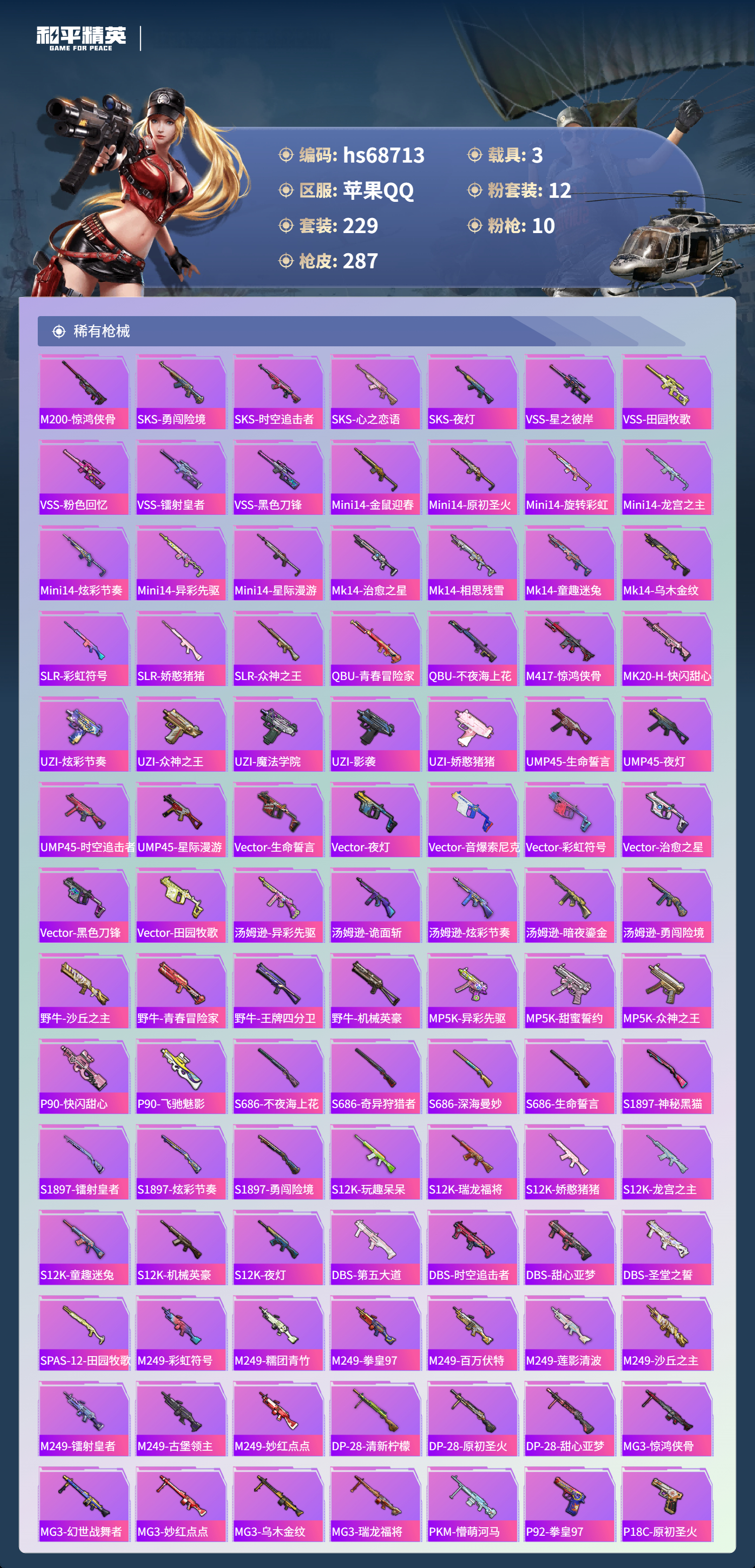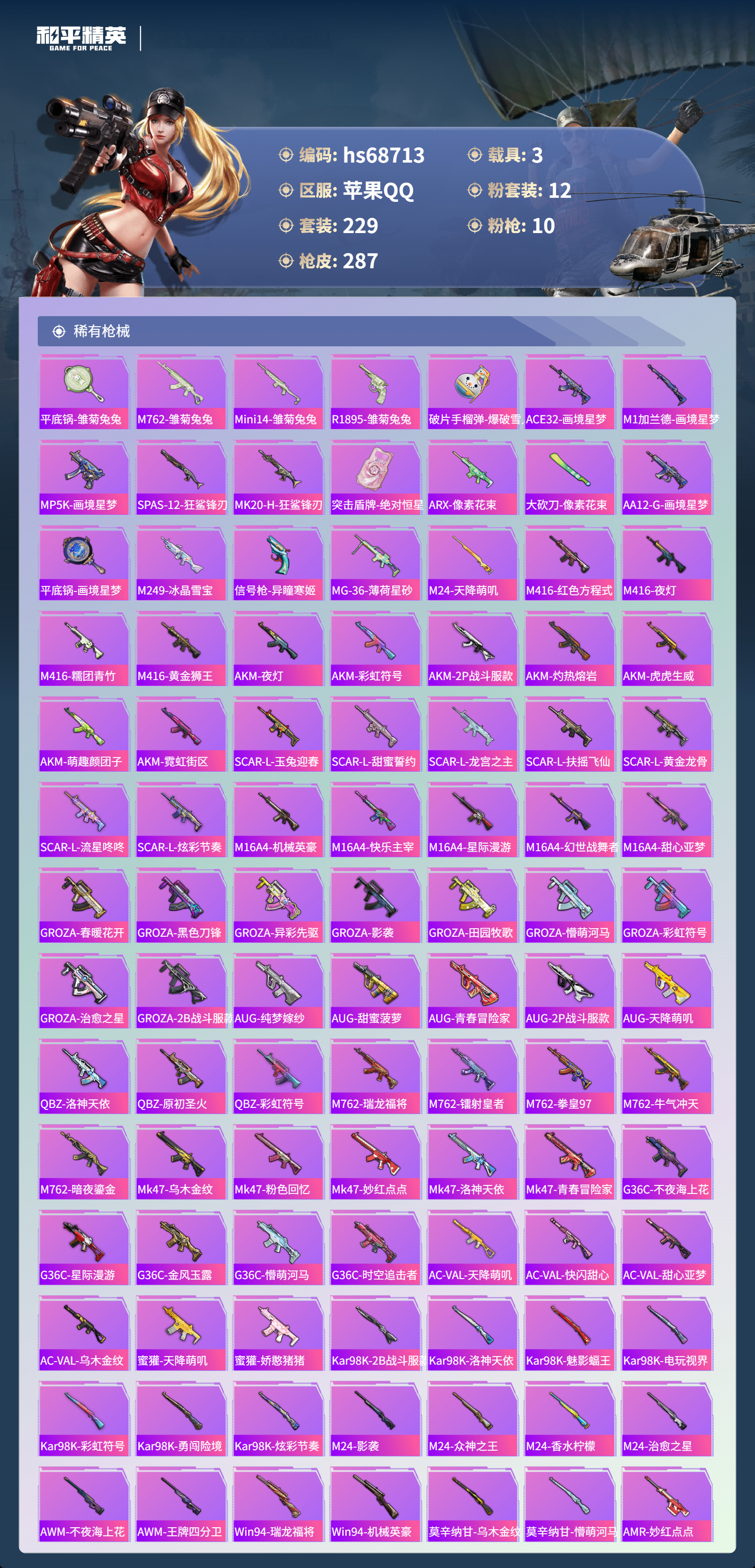 【286稀有枪械】M416-星际漫游,AUG-星梦奇缘/6级,P90-沙丘之主/3级,M416-五爪金龙/7级,M416-心之恋语/1级,AKM-炫紫旋律/7级,SCAR-L-童趣迷兔/7级,M762-甜蜜誓约/7级,Mk14-福马献瑞/5级,UMP45-相思残雪/7级,MG3-洛神天依/4级,DBS-乌木金纹,汤姆逊-星梦奇缘,MK20-H-星梦奇缘,野牛-雏菊兔兔,平底锅-雏菊兔兔,M762-雏菊兔兔,Mini14-雏菊兔兔,R1895-雏菊兔兔,MK20-H-乌木金纹,MK12-乌木金纹,破片手榴弹-爆破雪人,ACE32-画境星梦,M1加兰德-画境星梦,MP5K-画境星梦,SPAS-12-狂鲨锋刃,MK20-H-狂鲨锋刃,突击盾牌-绝对恒星,ARX-像素花束,大砍刀-像素花束,AA12-G-画境星梦,平底锅-画境星梦,M249-冰晶雪宝,信号枪-异瞳寒姬,MG-36-薄荷星砂,M24-天降萌叽,M416-红色方程式,M416-乌木金纹,M416-夜灯,M416-糯团青竹,M416-黄金狮王,AKM-夜灯,AKM-乌木金纹,AKM-彩虹符号,AKM-2P战斗服款,AKM-灼热熔岩,AKM-虎虎生威,AKM-萌趣颜团子,AKM-霓虹街区,SCAR-L-玉兔迎春,SCAR-L-乌木金纹,SCAR-L-甜蜜誓约,SCAR-L-龙宫之主,SCAR-L-扶摇飞仙,SCAR-L-黄金龙骨,SCAR-L-流星咚咚,SCAR-L-炫彩节奏,M16A4-机械英豪,M16A4-快乐主宰,M16A4-星际漫游,M16A4-幻世战舞者,M16A4-甜心亚梦,GROZA-乌木金纹,GROZA-春暖花开,GROZA-黑色刀锋,GROZA-异彩先驱,GROZA-影袭,GROZA-田园牧歌,GROZA-懵萌河马,GROZA-彩虹符号,GROZA-治愈之星,GROZA-2B战斗服款,AUG-纯梦嫁纱,AUG-甜蜜菠萝,AUG-青春冒险家,AUG-2P战斗服款,AUG-天降萌叽,QBZ-洛神天依,QBZ-原初圣火,QBZ-乌木金纹,QBZ-彩虹符号,M762-瑞龙福将,M762-镭射皇者,M762-拳皇97,M762-牛气冲天,M762-暗夜鎏金,Mk47-乌木金纹,Mk47-粉色回忆,Mk47-妙红点点,Mk47-洛神天依,Mk47-青春冒险家,G36C-不夜海上花,G36C-乌木金纹,G36C-星际漫游,G36C-金风玉露,G36C-懵萌河马,G36C-时空追击者,AC-VAL-天降萌叽,AC-VAL-快闪甜心,AC-VAL-甜心亚梦,AC-VAL-乌木金纹,蜜獾-天降萌叽,蜜獾-娇憨猪猪,Kar98K-乌木金纹,Kar98K-2B战斗服款,Kar98K-洛神天依,Kar98K-魅影蝠王,Kar98K-电玩视界,Kar98K-彩虹符号,Kar98K-勇闯险境,Kar98K-炫彩节奏,M24-乌木金纹,M24-影袭,M24-众神之王,M24-香水柠檬,M24-治愈之星,AWM-乌木金纹,AWM-不夜海上花,AWM-王牌四分卫,Win94-瑞龙福将,Win94-机械英豪,莫辛纳甘-乌木金纹,莫辛纳甘-懵萌河马,AMR-乌木金纹,AMR-妙红点点,M200-惊鸿侠骨,SKS-勇闯险境,SKS-时空追击者,SKS-心之恋语,SKS-夜灯,VSS-星之彼岸,VSS-乌木金纹,VSS-田园牧歌,VSS-粉色回忆,VSS-镭射皇者,VSS-黑色刀锋,Mini14-金鼠迎春,Mini14-原初圣火,Mini14-旋转彩虹,Mini14-龙宫之主,Mini14-炫彩节奏,Mini14-异彩先驱,Mini14-星际漫游,Mk14-治愈之星,Mk14-相思残雪,Mk14-童趣迷兔,Mk14-乌木金纹,SLR-彩虹符号,SLR-娇憨猪猪,SLR-众神之王,QBU-青春冒险家,QBU-不夜海上花,M417-惊鸿侠骨,MK20-H-快闪甜心,UZI-炫彩节奏,UZI-众神之王,UZI-魔法学院,UZI-影袭,UZI-娇憨猪猪,UMP45-生命誓言,UMP45-夜灯,UMP45-时空追击者,UMP45-星际漫游,Vector-乌木金纹,Vector-生命誓言,Vector-夜灯,Vector-音爆索尼克,Vector-彩虹符号,Vector-治愈之星,Vector-黑色刀锋,Vector-田园牧歌,汤姆逊-乌木金纹,汤姆逊-异彩先驱,汤姆逊-诡面斩,汤姆逊-炫彩节奏,汤姆逊-暗夜鎏金,汤姆逊-勇闯险境,野牛-乌木金纹,野牛-沙丘之主,野牛-青春冒险家,野牛-王牌四分卫,野牛-机械英豪,MP5K-异彩先驱,MP5K-甜蜜誓约,MP5K-众神之王,MP5K-乌木金纹,P90-乌木金纹,P90-快闪甜心,P90-飞驰魅影,S686-不夜海上花,S686-奇异狩猎者,S686-深海曼妙,S686-生命誓言,S1897-神秘黑猫,S1897-镭射皇者,S1897-乌木金纹,S1897-炫彩节奏,S1897-勇闯险境,S12K-玩趣呆呆,S12K-乌木金纹,S12K-瑞龙福将,S12K-娇憨猪猪,S12K-龙宫之主,S12K-童趣迷兔,S12K-机械英豪,S12K-夜灯,DBS-第五大道,DBS-时空追击者,DBS-甜心亚梦,DBS-圣堂之誓,SPAS-12-田园牧歌,M249-彩虹符号,M249-糯团青竹,M249-拳皇97,M249-百万伏特,M249-莲影清波,M249-沙丘之主,M249-乌木金纹,M249-镭射皇者,M249-古堡领主,M249-妙红点点,DP-28-清新柠檬,DP-28-乌木金纹,DP-28-原初圣火,DP-28-甜心亚梦,MG3-惊鸿侠骨,MG3-幻世战舞者,MG3-妙红点点,MG3-乌木金纹,MG3-瑞龙福将,PKM-懵萌河马,P92-拳皇97,P18C-原初圣火,短管霰弹,-2B战斗服款,沙漠之鹰-旋转彩虹,沙漠之鹰-快闪甜心,大砍刀-万古烈焰,大砍刀-2P战斗服款,平底锅-惊鸿侠骨,平底锅-空岛之星,平底锅-众神之王,平底锅-原初圣火,平底锅-光之冒险,平底锅-青春冒险家,平底锅-机械英豪,平底锅-懵萌河马,平底锅-黄金龙骨,平底锅-田园牧歌,平底锅-勇闯险境,平底锅-治愈之星,平底锅-炫紫旋律,平底锅-时空追击者,平底锅-娇憨猪猪,平底锅-甜心亚梦,平底锅-妙红点点,平底锅-快闪甜心,平底锅-拳皇97,平底锅-异彩先驱,平底锅-镭射皇者,平底锅-不夜海上花,平底锅-瑞龙福将,平底锅-黑色刀锋,撬棍-沙丘之主权杖,撬棍-传奇侦探,爆炸猎弓-惊鸿侠骨,破片手榴弹-呆爆全场,破片手榴弹-萌趣颜团子,破片手榴弹-潮萌小黄鸭,撬棍-暮色玫影,撬棍-冰晶雪宝,MG3-火熔核心,ACE32-冰晶雪宝,蜜獾-糖糖葫芦,G36C-灵驹仙姬,M16A4-雨过天青,GROZA-福马献瑞,蜜獾-启元战纹,AMR-雨过天青,SLR-乌木金纹,AA12-G-雨过天青,PKM-雨过天青,沙漠之鹰-雨过天青,燃烧瓶-福马献瑞,P90-紫矿核心,汤姆逊-像素花束,MG3-火熔核心
