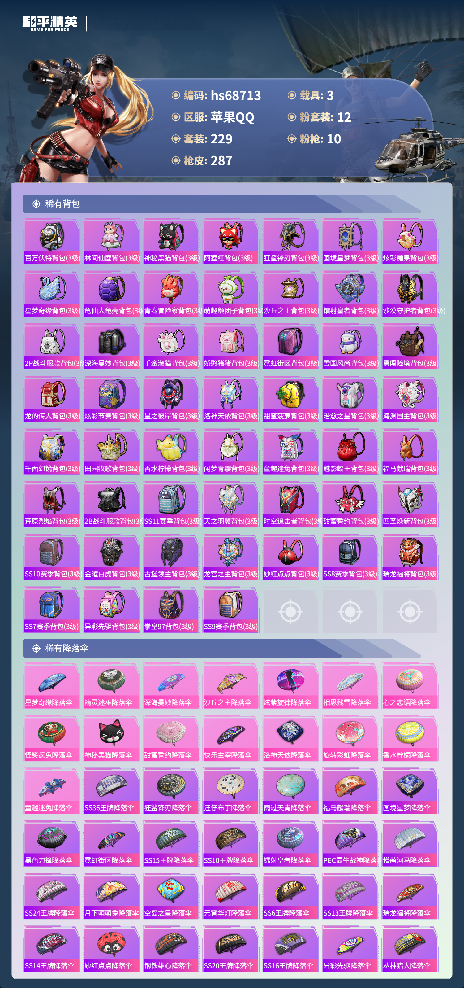 【93稀有降落伞】星梦奇缘降落伞,SS36王牌降落伞,狂鲨锋刃降落伞,汪仔布丁降落伞,雨过天青降落伞,福马献瑞降落伞,画境星梦降落伞,黑色刀锋降落伞,霓虹街区降落伞,SS15王牌降落伞,SS10王牌降落伞,镭射皇者降落伞,精灵迷巫降落伞,PEC最牛战神降落伞,深海曼妙降落伞,懵萌河马降落伞,SS24王牌降落伞,沙丘之主降落伞,月下萌萌兔降落伞,炫紫旋律降落伞,空岛之星降落伞,相思残雪降落伞,元宵华灯降落伞,SS6王牌降落伞,SS13王牌降落伞,紫菱降落伞,瑞龙福将降落伞,SS14王牌降落伞,心之恋语降落伞,妙红点点降落伞,天际突击降落伞,钢铁雄心降落伞,SS20王牌降落伞,SS16王牌降落伞,蝶舞翩翩降落伞,怪笑疯兔降落伞,异彩先驱降落伞,丛林猎人降落伞,都市猎人降落伞,青羽降落伞,天涯共此时降落伞,空投萌叽降落伞,彩虹勇气降落伞,SS22王牌降落伞,拳皇97降落伞,SS19王牌降落伞,时空追击者降落伞,普通降落伞,比翼双飞降落伞,SS18王牌降落伞,化学天才降落伞,神秘黑猫降落伞,白昼之火降落伞,2B战斗服款降落伞,众神之王降落伞,迷雾突击降落伞,甜蜜誓约降落伞,涂山之恋降落伞,迎春赐福降落伞,九霄降落伞,SS11王牌降落伞,娇憨猪猪降落伞,海域冒险降落伞,青春冒险家降落伞,寂夜之火降落伞,SS8王牌降落伞,惊鸿侠骨降落伞,快乐主宰降落伞,洛神天依降落伞,原初圣火降落伞,雏菊兔兔降落伞,SS17王牌降落伞,奇异狩猎者降落伞,SS21王牌降落伞,萌趣颜团子降落伞,旋转彩虹降落伞,SS12王牌降落伞,勇闯险境降落伞,香水柠檬降落伞,快闪甜心降落伞,梨园星光降落伞,机械英豪降落伞,田园牧歌降落伞,治愈之星降落伞,勇者同行降落伞,SS9王牌降落伞,龙宫之主降落伞,童趣迷兔降落伞,不夜海上花降落伞,甜心亚梦降落伞,电竞之星降落伞,2P战斗服款降落伞,蓝海之火降落伞