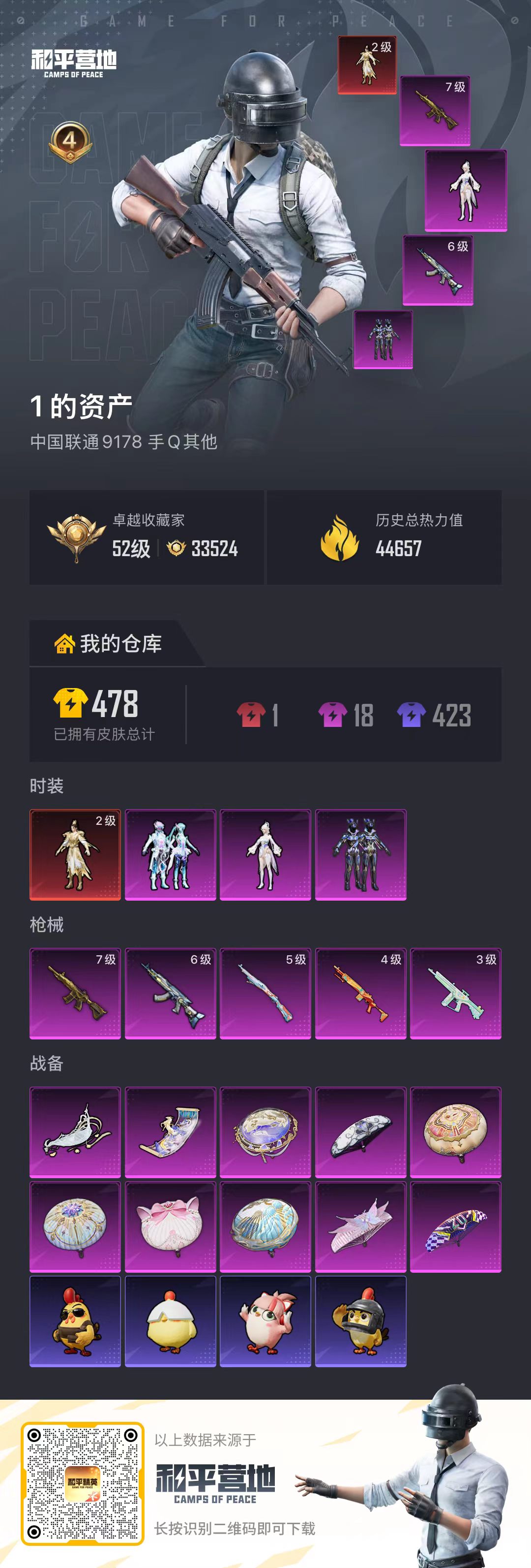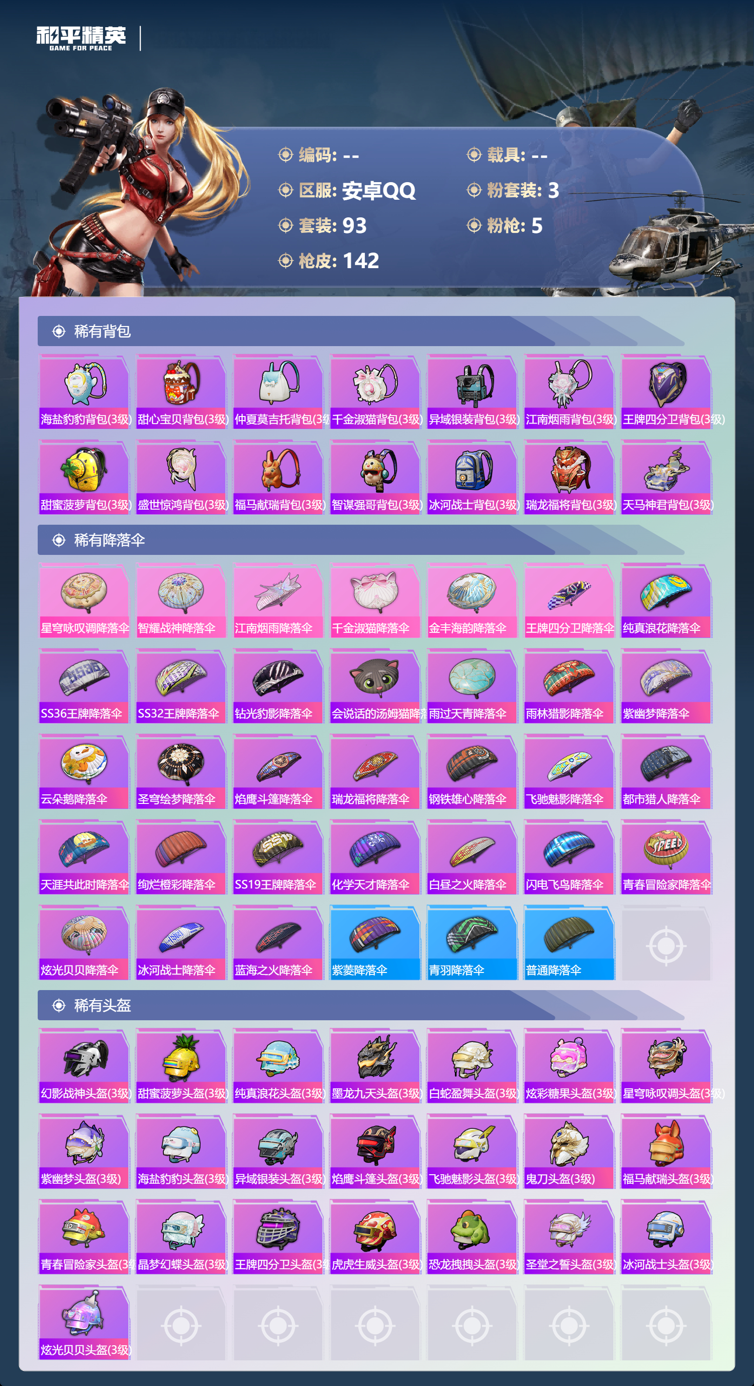 【144稀有枪械】M416-五爪金龙/7级,M762-激战未来/6级,Kar98K-巳巳如意/5级,Mk14-福马献瑞/4级,AA12-G-萌骑幻想/3级,QBZ-纯真浪花,AWM-纯真浪花,汤姆逊-纯真浪花,DBS-乌木金纹,AA12-G-纯真浪花,平底锅-纯真浪花,TMP-9-霓彩节奏,M16A4-冰河战士,MK20-H-圣域龙灵,Win94-乌木金纹,MK12-乌木金纹,PKM-紫幽梦,R45-幻彩电音,Mk14-紫幽梦,蜜獾-乌木金纹,M762-云朵鹅,S1897-紫幽梦,SVD-云朵鹅,P92-紫幽梦,SPAS-12-狂鲨锋刃,铝热弹-炫彩糖果,ARX-像素花束,大砍刀-像素花束,Kar98K-星穹咏叹调,平底锅-紫幽梦,燃烧瓶-甜梦桃焰,破片手榴弹-海盐豹豹,UMP45-海盐豹豹,Famas-乌木金纹,SPAS-12-云朵鹅,M249-无面战甲,沙漠之鹰-云朵鹅,大砍刀-云朵鹅,蜜獾-鸡智如我,M416-蓝色火焰,M416-糯团青竹,M416-绯红前夜,AKM-影袭,AKM-夜灯,AKM-破晓战魂,AKM-虎虎生威,SCAR-L-王牌四分卫,SCAR-L-夜灯,SCAR-L-炫彩节奏,M16A4-幻世战舞者,GROZA-影袭,AUG-幻影战神,AUG-甜蜜菠萝,AUG-青春冒险家,AUG-天降萌叽,QBZ-飞驰魅影,QBZ-彩虹符号,M762-瑞龙福将,Mk47-青春冒险家,G36C-乌木金纹,G36C-暗夜玫瑰,AC-VAL-天降萌叽,AC-VAL-乌木金纹,蜜獾-天降萌叽,Kar98K-飞驰魅影,Kar98K-影袭,Kar98K-炫彩节奏,M24-乌木金纹,M24-影袭,AWM-天降萌叽,AWM-王牌四分卫,AWM-焰鹰斗篷,Win94-瑞龙福将,莫辛纳甘-乌木金纹,AMR-乌木金纹,SKS-炫彩节奏,Mini14-耀粉歌者,Mini14-炫彩节奏,QBU-青春冒险家,UZI-炫彩节奏,UZI-红色方程式,UZI-影袭,UZI-幻影战神,UZI-天降萌叽,UMP45-夜灯,Vector-生命誓言,Vector-焰鹰斗篷,汤姆逊-天降萌叽,野牛-青春冒险家,野牛-王牌四分卫,MP5K-乌木金纹,P90-乌木金纹,P90-飞驰魅影,S1897-乌木金纹,S1897-飞驰魅影,S12K-瑞龙福将,S12K-夜灯,DBS-焰鹰斗篷,DBS-彩虹符号,M249-彩虹符号,M249-糯团青竹,M249-百万伏特,DP-28-焰鹰斗篷,DP-28-Alan,Walker潮音版,DP-28-彩虹符号,MG3-幻世战舞者,MG3-乌木金纹,MG3-瑞龙福将,平底锅-青春冒险家,平底锅-飞驰魅影,平底锅-瑞龙福将,平底锅-焰鹰斗篷,撬棍-绯红前夜,MP5K-天马神君,DBS-绿洲时空,MG3-火熔核心,AC-VAL-荒原烈焰,野牛-燕燕于飞,M200-乌木金纹,SPAS-12-燕燕于飞,蝎式手枪-燕燕于飞,十字弩-异域银装,S686-巳巳如意,爆炸猎弓-花中眠,Vector-燕燕于飞,AMR-鬼刀,M16A4-雨过天青,AKM-玄冥寒域,蜜獾-启元战纹,AMR-雨过天青,SLR-乌木金纹,AA12-G-雨过天青,PKM-雨过天青,沙漠之鹰-雨过天青,燃烧瓶-福马献瑞,Vector-荒原烈焰,GROZA-晶梦幻蝶,S12K-辉光之愿,汤姆逊-像素花束,P90-巳巳如意,破片手榴弹-巳巳如意,MP5K-天马神君,DBS-绿洲时空,MG3-火熔核心