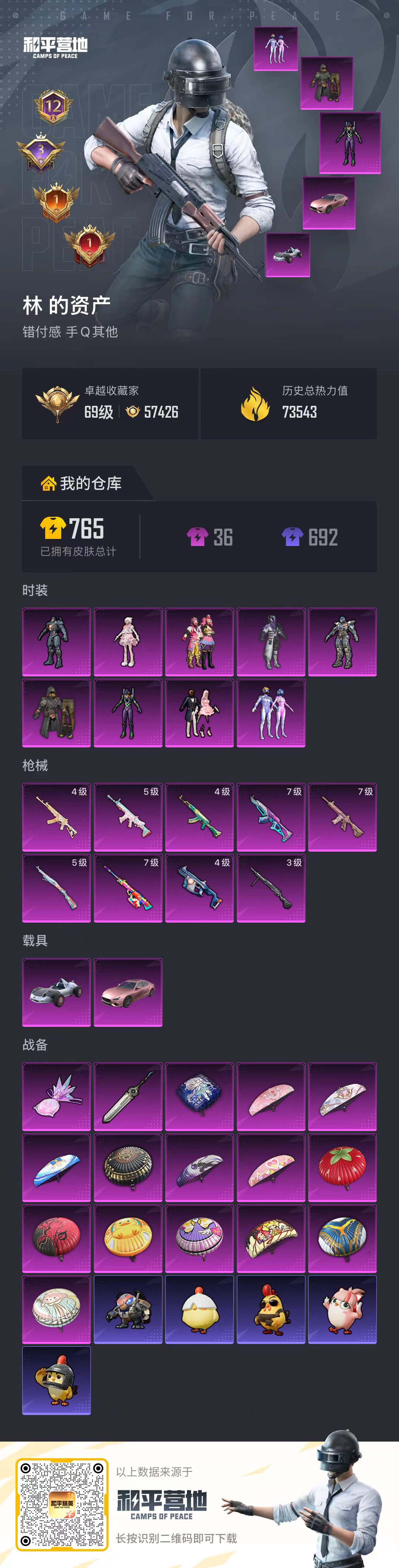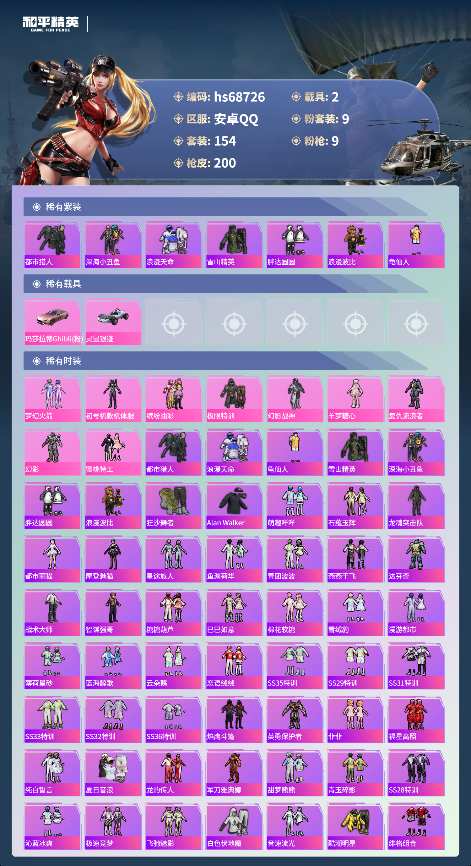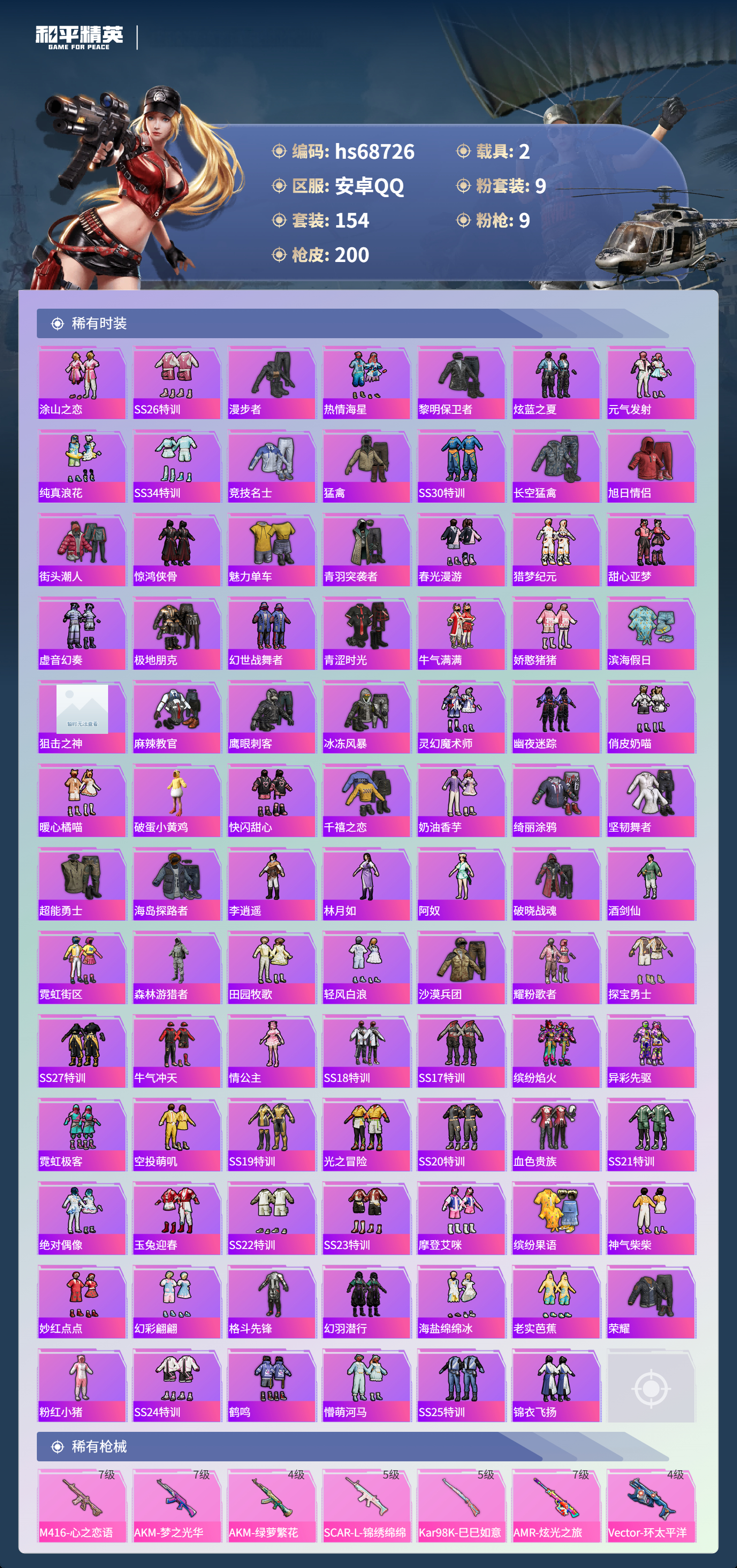 PX_2556518-,安卓手Q-12王牌印记-有战神框-9粉装-9特效枪-2载具-73543热力值-154套装-200枪皮-3卓越印记-1传奇印记