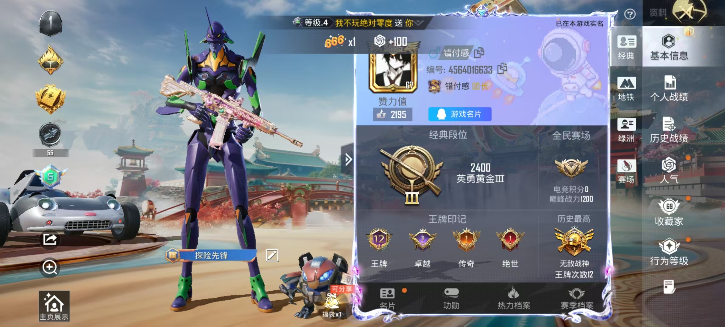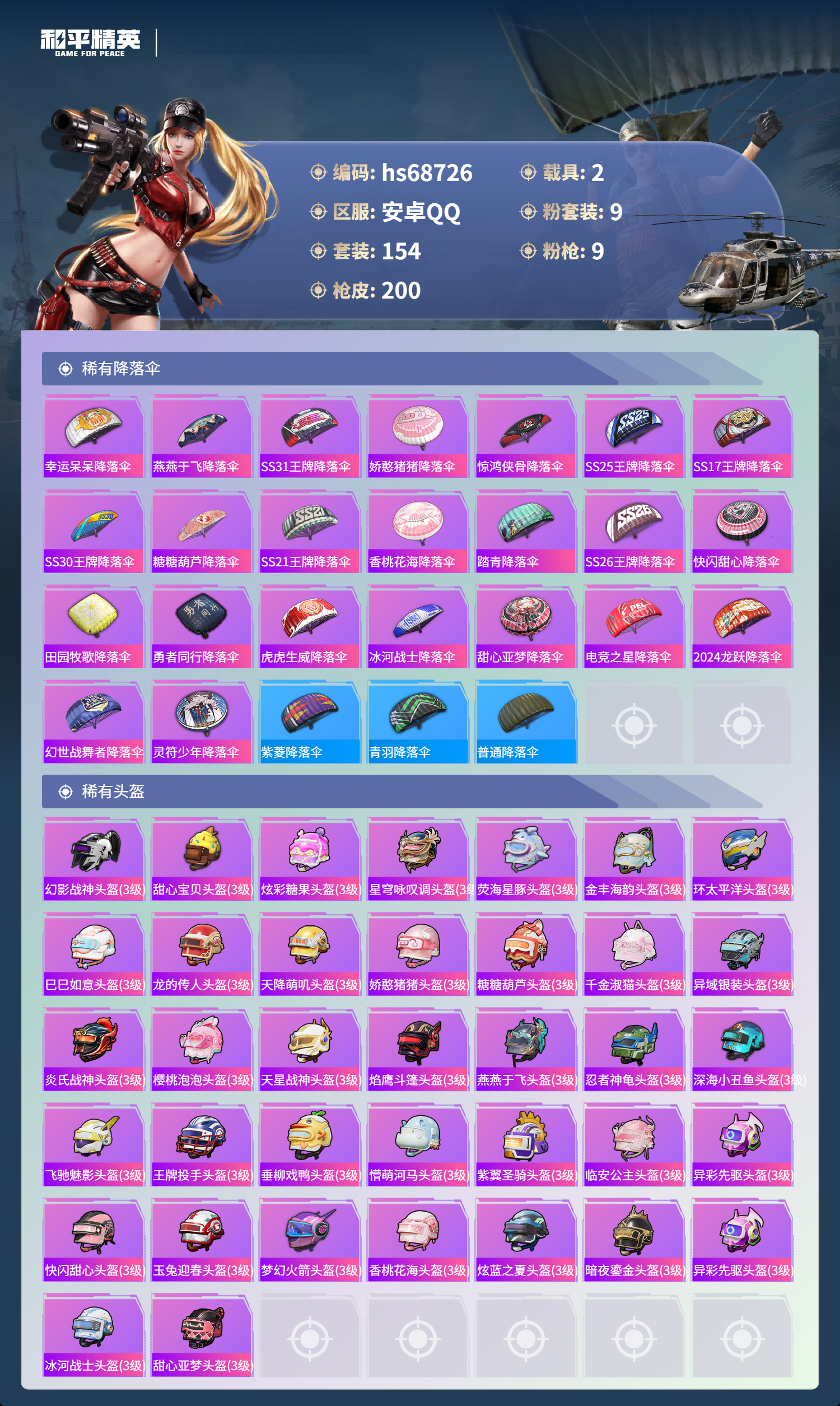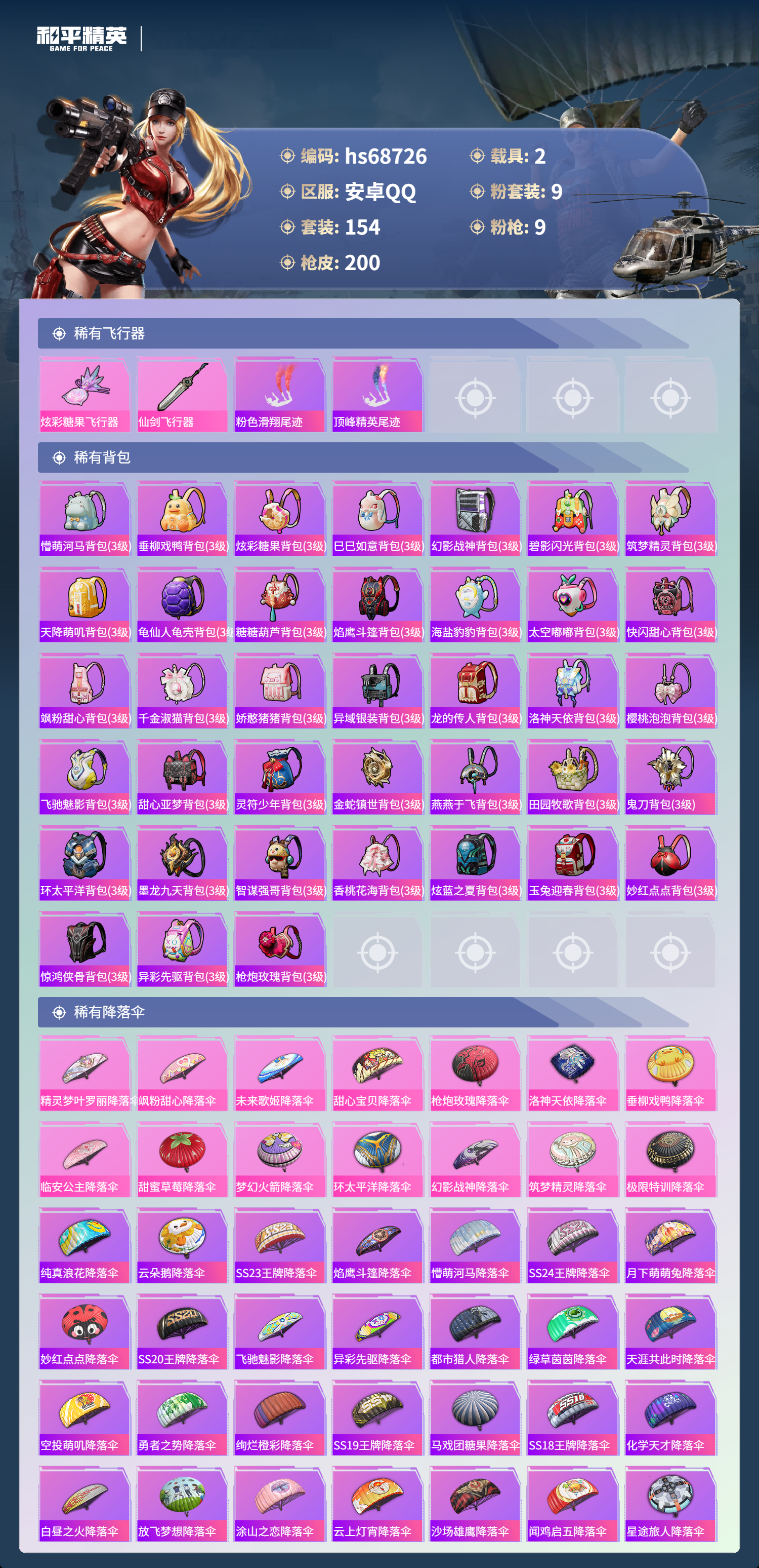 PX_2556518-,安卓手Q-12王牌印记-有战神框-9粉装-9特效枪-2载具-73543热力值-154套装-200枪皮-3卓越印记-1传奇印记