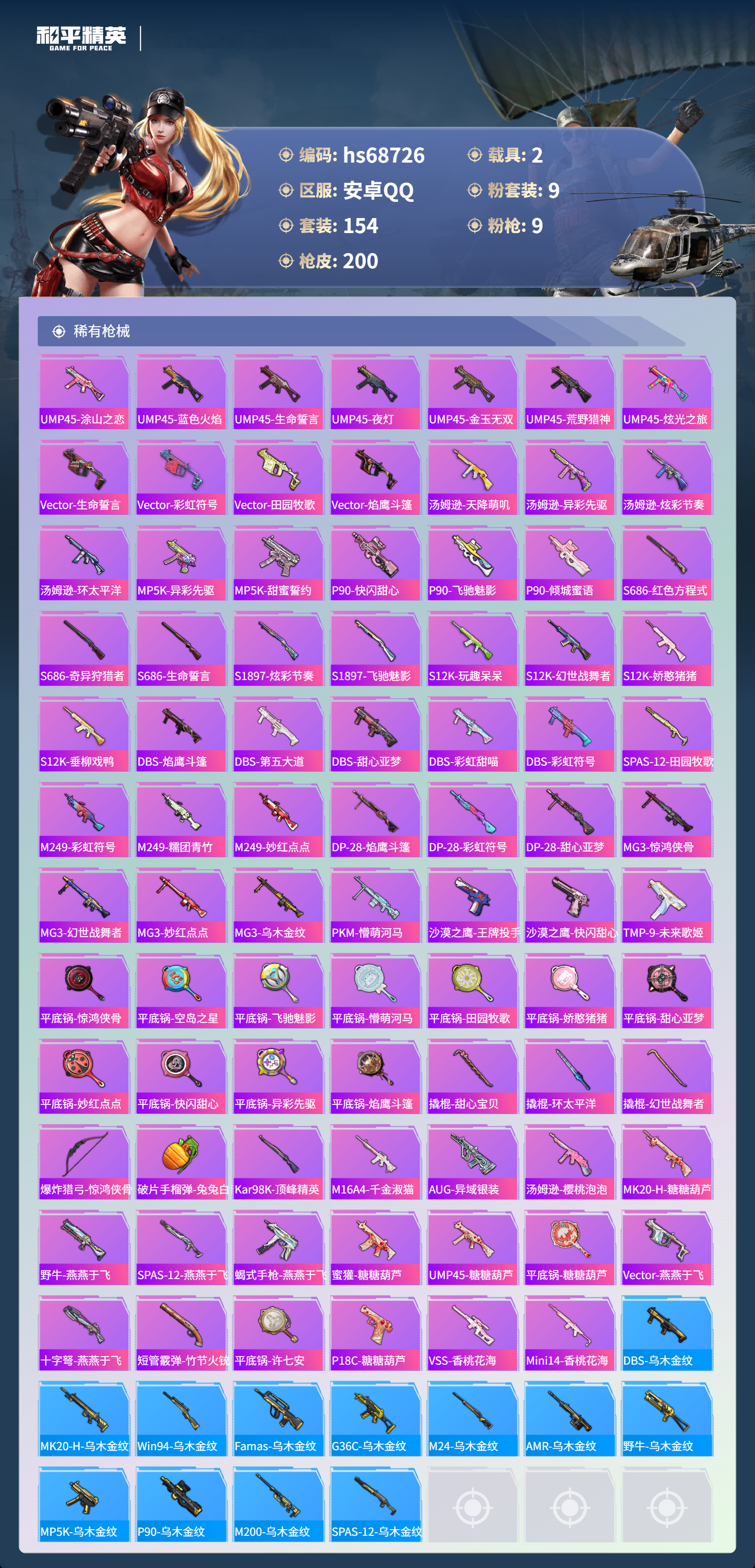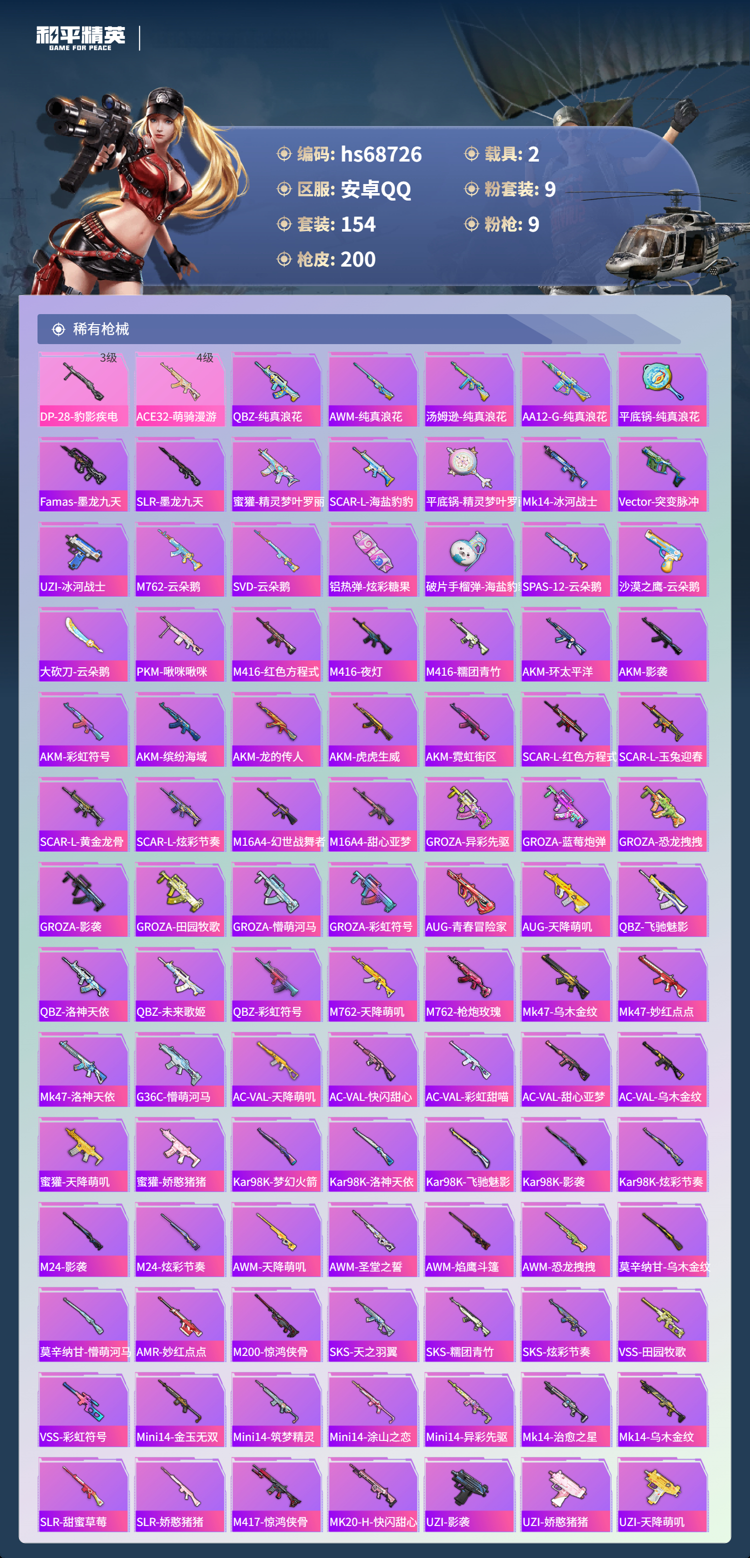 【200稀有枪械】M416-心之恋语/7级,AKM-梦之光华/7级,AKM-绿萝繁花/4级,SCAR-L-锦绣绵绵/5级,Kar98K-巳巳如意/5级,AMR-炫光之旅/7级,Vector-环太平洋/4级,DP-28-豹影疾电/3级,ACE32-萌骑漫游/4级,QBZ-纯真浪花,AWM-纯真浪花,汤姆逊-纯真浪花,DBS-乌木金纹,AA12-G-纯真浪花,平底锅-纯真浪花,Famas-墨龙九天,SLR-墨龙九天,蜜獾-精灵梦叶罗丽,SCAR-L-海盐豹豹,平底锅-精灵梦叶罗丽,Mk14-冰河战士,Vector-突变脉冲,UZI-冰河战士,MK20-H-乌木金纹,Win94-乌木金纹,M762-云朵鹅,SVD-云朵鹅,铝热弹-炫彩糖果,破片手榴弹-海盐豹豹,Famas-乌木金纹,SPAS-12-云朵鹅,沙漠之鹰-云朵鹅,大砍刀-云朵鹅,PKM-啾咪啾咪,M416-红色方程式,M416-夜灯,M416-糯团青竹,AKM-环太平洋,AKM-影袭,AKM-彩虹符号,AKM-缤纷海域,AKM-龙的传人,AKM-虎虎生威,AKM-霓虹街区,SCAR-L-红色方程式,SCAR-L-玉兔迎春,SCAR-L-黄金龙骨,SCAR-L-炫彩节奏,M16A4-幻世战舞者,M16A4-甜心亚梦,GROZA-异彩先驱,GROZA-蓝莓炮弹,GROZA-恐龙拽拽,GROZA-影袭,GROZA-田园牧歌,GROZA-懵萌河马,GROZA-彩虹符号,AUG-青春冒险家,AUG-天降萌叽,QBZ-飞驰魅影,QBZ-洛神天依,QBZ-未来歌姬,QBZ-彩虹符号,M762-天降萌叽,M762-枪炮玫瑰,Mk47-乌木金纹,Mk47-妙红点点,Mk47-洛神天依,G36C-乌木金纹,G36C-懵萌河马,AC-VAL-天降萌叽,AC-VAL-快闪甜心,AC-VAL-彩虹甜喵,AC-VAL-甜心亚梦,AC-VAL-乌木金纹,蜜獾-天降萌叽,蜜獾-娇憨猪猪,Kar98K-梦幻火箭,Kar98K-洛神天依,Kar98K-飞驰魅影,Kar98K-影袭,Kar98K-炫彩节奏,M24-乌木金纹,M24-影袭,M24-炫彩节奏,AWM-天降萌叽,AWM-圣堂之誓,AWM-焰鹰斗篷,AWM-恐龙拽拽,莫辛纳甘-乌木金纹,莫辛纳甘-懵萌河马,AMR-乌木金纹,AMR-妙红点点,M200-惊鸿侠骨,SKS-天之羽翼,SKS-糯团青竹,SKS-炫彩节奏,VSS-田园牧歌,VSS-彩虹符号,Mini14-金玉无双,Mini14-筑梦精灵,Mini14-涂山之恋,Mini14-异彩先驱,Mk14-治愈之星,Mk14-乌木金纹,SLR-甜蜜草莓,SLR-娇憨猪猪,M417-惊鸿侠骨,MK20-H-快闪甜心,UZI-影袭,UZI-娇憨猪猪,UZI-天降萌叽,UMP45-涂山之恋,UMP45-蓝色火焰,UMP45-生命誓言,UMP45-夜灯,UMP45-金玉无双,UMP45-荒野猎神,UMP45-炫光之旅,Vector-生命誓言,Vector-彩虹符号,Vector-田园牧歌,Vector-焰鹰斗篷,汤姆逊-天降萌叽,汤姆逊-异彩先驱,汤姆逊-炫彩节奏,汤姆逊-环太平洋,野牛-乌木金纹,MP5K-异彩先驱,MP5K-甜蜜誓约,MP5K-乌木金纹,P90-乌木金纹,P90-快闪甜心,P90-飞驰魅影,P90-倾城蜜语,S686-红色方程式,S686-奇异狩猎者,S686-生命誓言,S1897-炫彩节奏,S1897-飞驰魅影,S12K-玩趣呆呆,S12K-幻世战舞者,S12K-娇憨猪猪,S12K-垂柳戏鸭,DBS-焰鹰斗篷,DBS-第五大道,DBS-甜心亚梦,DBS-彩虹甜喵,DBS-彩虹符号,SPAS-12-田园牧歌,M249-彩虹符号,M249-糯团青竹,M249-妙红点点,DP-28-焰鹰斗篷,DP-28-彩虹符号,DP-28-甜心亚梦,MG3-惊鸿侠骨,MG3-幻世战舞者,MG3-妙红点点,MG3-乌木金纹,PKM-懵萌河马,沙漠之鹰-王牌投手,沙漠之鹰-快闪甜心,TMP-9-未来歌姬,平底锅-惊鸿侠骨,平底锅-空岛之星,平底锅-飞驰魅影,平底锅-懵萌河马,平底锅-田园牧歌,平底锅-娇憨猪猪,平底锅-甜心亚梦,平底锅-妙红点点,平底锅-快闪甜心,平底锅-异彩先驱,平底锅-焰鹰斗篷,撬棍-甜心宝贝,撬棍-环太平洋,撬棍-幻世战舞者,爆炸猎弓-惊鸿侠骨,破片手榴弹-兔兔白日梦,Kar98K-顶峰精英,M16A4-千金淑猫,AUG-异域银装,汤姆逊-樱桃泡泡,MK20-H-糖糖葫芦,野牛-燕燕于飞,M200-乌木金纹,SPAS-12-燕燕于飞,蝎式手枪-燕燕于飞,蜜獾-糖糖葫芦,UMP45-糖糖葫芦,SPAS-12-乌木金纹,平底锅-糖糖葫芦,Vector-燕燕于飞,十字弩-燕燕于飞,短管霰弹-竹节火铳,平底锅-许七安,P18C-糖糖葫芦,VSS-香桃花海,Mini14-香桃花海