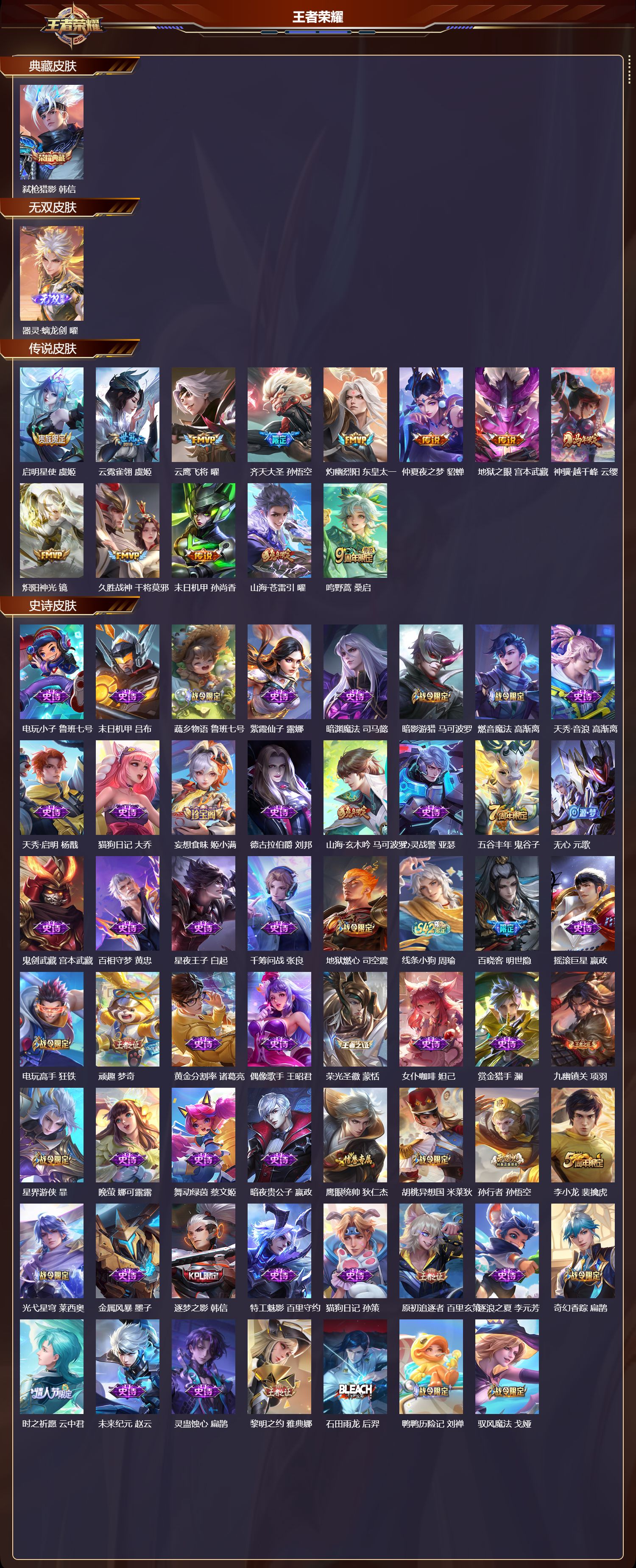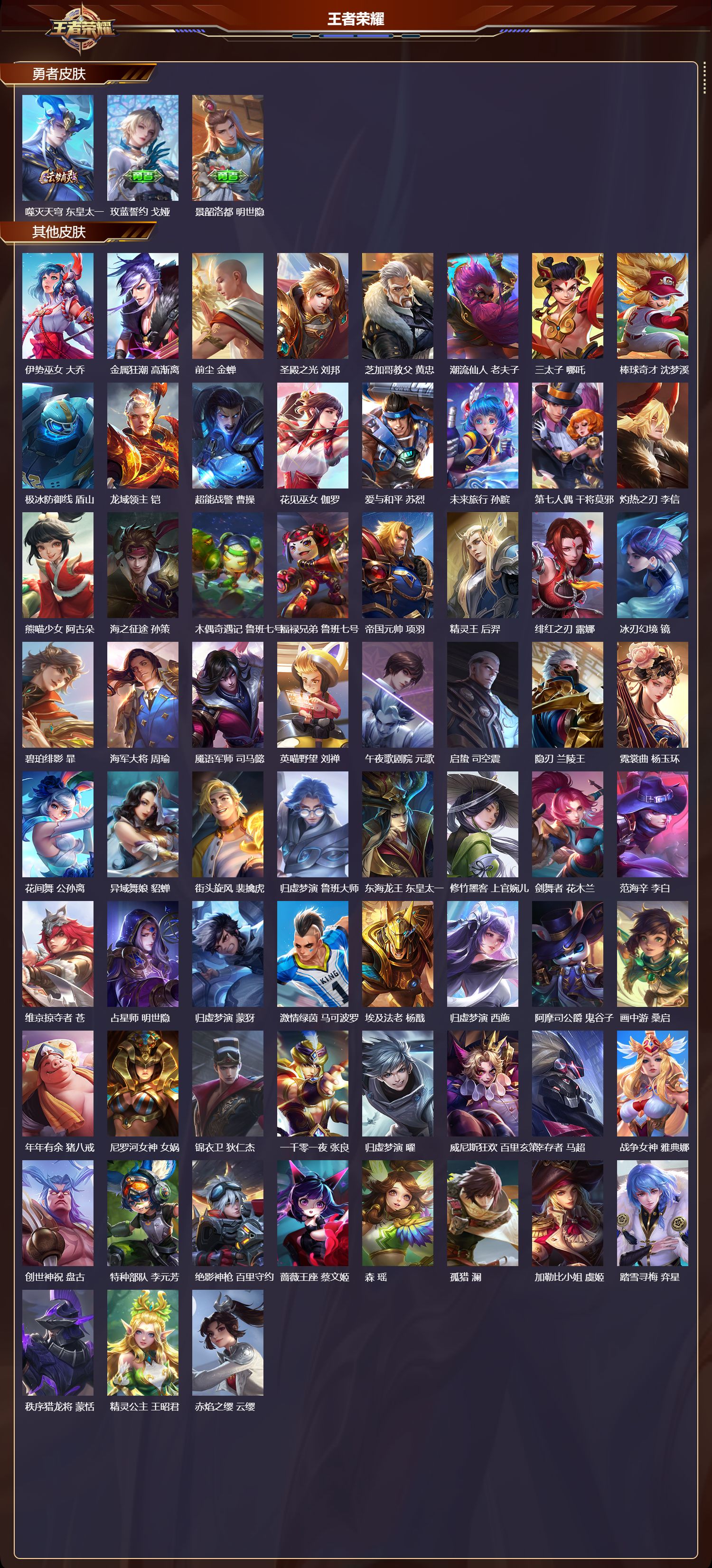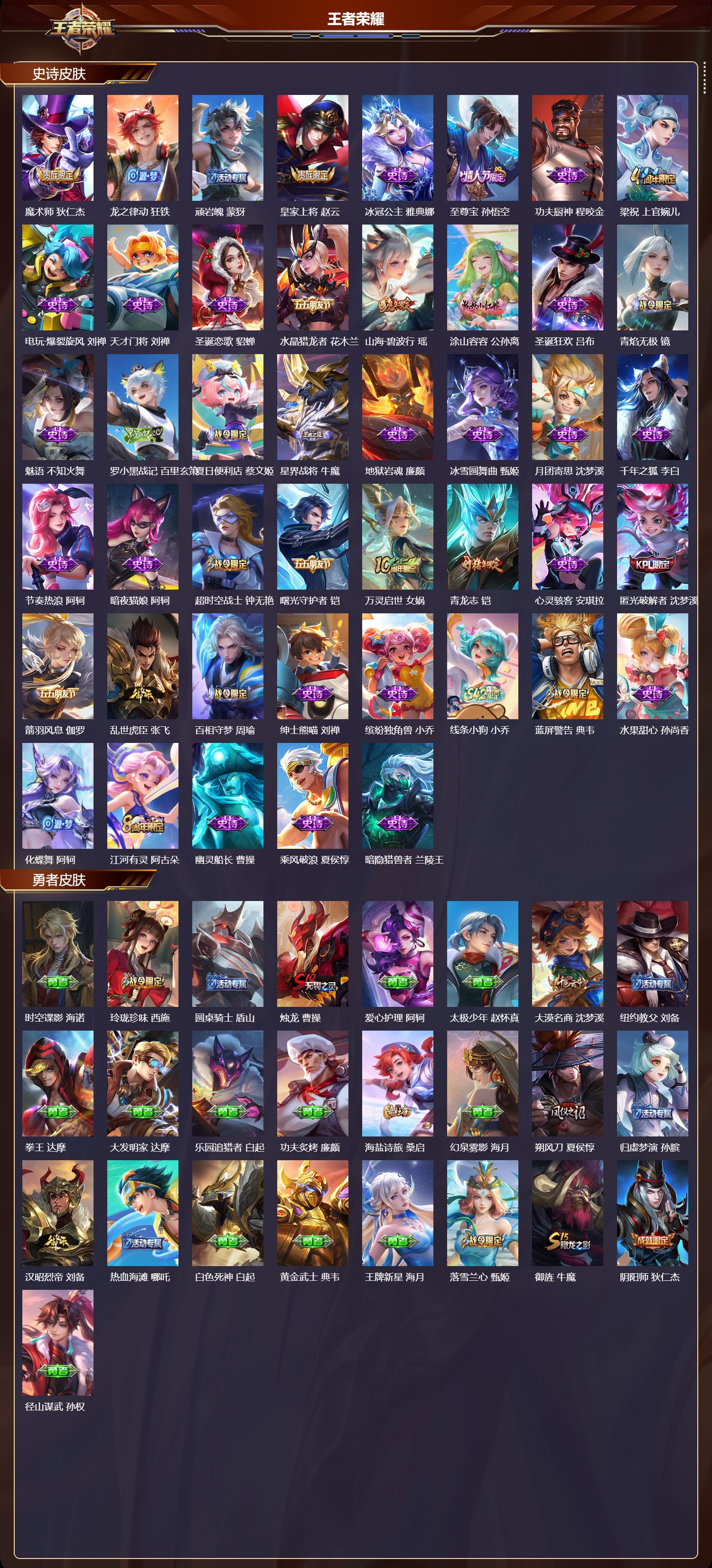 【100,史诗皮肤】电玩小子,鲁班七号,末日机甲,吕布,蔬乡物语,鲁班七号,紫霞仙子,露娜,暗渊魔法,司马懿,暗影游猎,马可波罗,燃音魔法,高渐离,天秀·音浪,高渐离,天秀·启明,杨戬,猫狗日记,大乔,妄想食味,姬小满,德古拉伯爵,刘邦,山海·玄木吟,马可波罗,心灵战警,亚瑟,五谷丰年,鬼谷子,无心,元歌,鬼剑武藏,宫本武藏,百相守梦,黄忠,星夜王子,白起,千筹问战,张良,地狱燃心,司空震,线条小狗,周瑜,百晓客,明世隐,摇滚巨星,嬴政,电玩高手,狂铁,顽趣,梦奇,黄金分割率,诸葛亮,偶像歌手,王昭君,荣光圣徽,蒙恬,女仆咖啡,妲己,赏金猎手,澜,九幽镇关,项羽,星界游侠,暃,晚萤,娜可露露,舞动绿茵,蔡文姬,暗夜贵公子,嬴政,鹰眼统帅,狄仁杰,胡桃异想国,米莱狄,孙行者,孙悟空,李小龙,裴擒虎,光弋星穹,莱西奥,金属风暴,墨子,逐梦之影,韩信,特工魅影,百里守约,猫狗日记,孙策,原初追逐者,百里玄策,逐浪之夏,李元芳,奇幻香踪,扁鹊,时之祈愿,云中君,未来纪元,赵云,灵蛊蚀心,扁鹊,黎明之约,雅典娜,石田雨龙,后羿,鸭鸭历险记,刘禅,驭风魔法,戈娅,魔术师,狄仁杰,龙之律动,狂铁,顽岩魄,蒙犽,皇家上将,赵云,冰冠公主,雅典娜,至尊宝,孙悟空,功夫厨神,程咬金,梁祝,上官婉儿,电玩·爆裂旋风,刘禅,天才门将,刘禅,圣诞恋歌,貂蝉,水晶猎龙者,花木兰,山海·碧波行,瑶,涂山容容,公孙离,圣诞狂欢,吕布,青焰无极,镜,魅语,不知火舞,罗小黑战记,百里玄策,夏日便利店,蔡文姬,星界战将,牛魔,地狱岩魂,廉颇,冰雪圆舞曲,甄姬,月团寄思,沈梦溪,千年之狐,李白,节奏热浪,阿轲,暗夜猫娘,阿轲,超时空战士,钟无艳,曙光守护者,铠,万灵启世,女娲,青龙志,铠,心灵骇客,安琪拉,匿光破解者,沈梦溪,箭羽风息,伽罗,乱世虎臣,张飞,百相守梦,周瑜,绅士熊喵,刘禅,缤纷独角兽,小乔,线条小狗,小乔,蓝屏警告,典韦,水果甜心,孙尚香,化蝶舞,阿轲,江河有灵,阿古朵,幽灵船长,曹操,乘风破浪,夏侯惇,暗隐猎兽者,兰陵王,