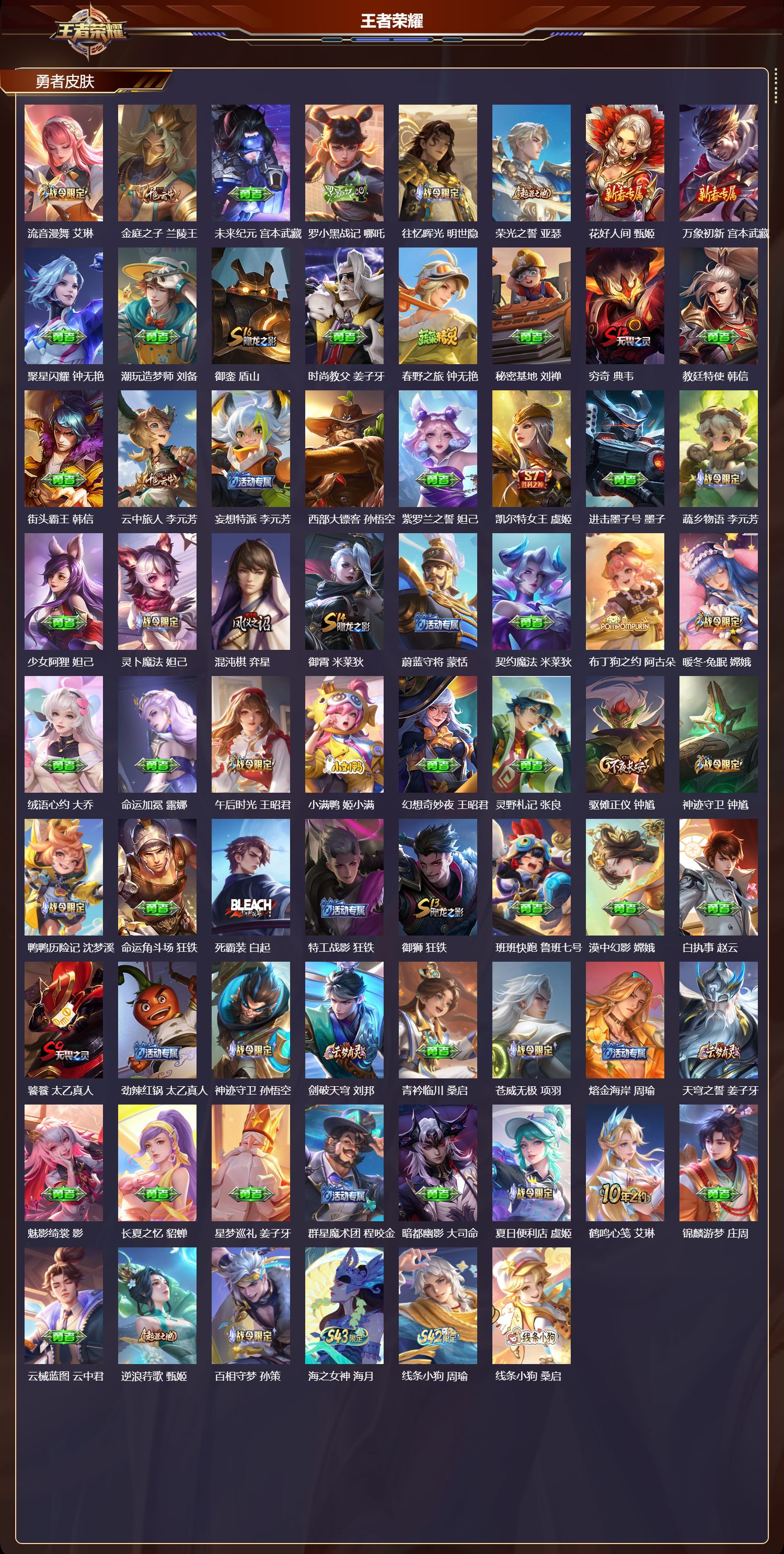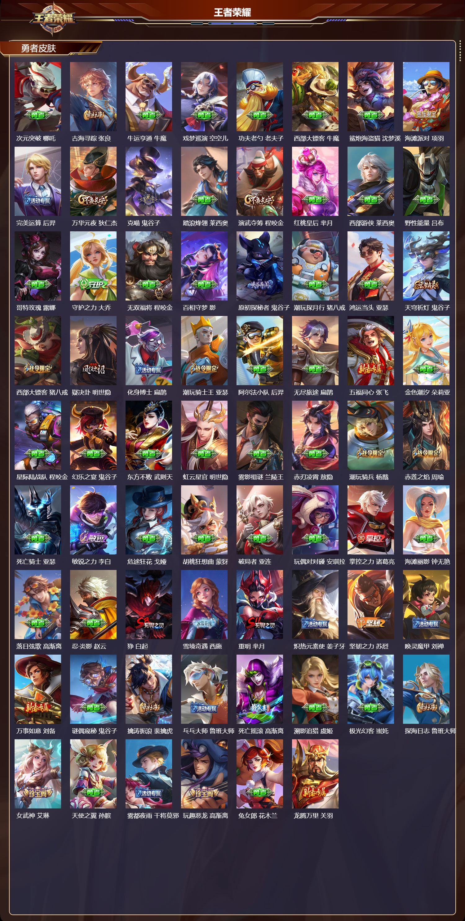 【168,勇者皮肤】时空谍影,海诺,玲珑珍味,西施,圆桌骑士,盾山,烛龙,曹操,爱心护理,阿轲,太极少年,赵怀真,大漠名商,沈梦溪,纽约教父,刘备,拳王,达摩,大发明家,达摩,乐园追猎者,白起,功夫炙烤,廉颇,海盐诗旅,桑启,幻泉雾影,海月,朔风刀,夏侯惇,归虚梦演,孙膑,汉昭烈帝,刘备,热血海滩,哪吒,白色死神,白起,黄金武士,典韦,王牌新星,海月,落雪兰心,甄姬,御旌,牛魔,阴阳师,狄仁杰,径山谋武,孙权,次元突破,哪吒,古海寻踪,张良,牛运亨通,牛魔,戏梦巡演,空空儿,功夫老勺,老夫子,西部大镖客,牛魔,鲨炮海盗猫,沈梦溪,海滩派对,项羽,完美运算,后羿,万华元夜,狄仁杰,克喵,鬼谷子,踏浪烽翎,莱西奥,演武夺筹,程咬金,红桃皇后,芈月,西部游侠,莱西奥,野性能量,吕布,哥特玫瑰,露娜,守护之力,大乔,无双福将,程咬金,百相守梦,影,原初探秘者,鬼谷子,潮玩探月行,猪八戒,鸿运当头,亚瑟,天穹祈灯,鬼谷子,西部大镖客,猪八戒,疑决卦,明世隐,化身博士,扁鹊,潮玩骑士王,亚瑟,阿尔法小队,后羿,无尽旅途,扁鹊,五福同心,张飞,金色潮汐,朵莉亚,星际陆战队,程咬金,幻乐之宴,鬼谷子,东方不败,武则天,虹云星官,明世隐,雾影缉谜,兰陵王,赤刃凌霄,敖隐,潮玩骑兵,杨戬,赤莲之焰,周瑜,死亡骑士,亚瑟,敏锐之力,李白,危途狂花,戈娅,胡桃狂想曲,蒙犽,破局者,亚连,玩偶对对碰,安琪拉,掌控之力,诸葛亮,海滩丽影,钟无艳,落日弦歌,高渐离,忍·炎影,赵云,狰,白起,雪境奇遇,西施,重明,芈月,炽热元素使,姜子牙,坚韧之力,苏烈,唤灵魔甲,刘禅,万事如意,刘备,谜偶窥秘,鬼谷子,擒涛扼浪,裴擒虎,乓乓大师,鲁班大师,死亡摇滚,高渐离,溯影追猎,虞姬,极光幻客,蚩奼,探海日志,鲁班大师,女武神,艾琳,天使之翼,孙膑,雾都夜雨,干将莫邪,玩趣恶龙,高渐离,兔女郎,花木兰,龙腾万里,关羽,流音漫舞,艾琳,金庭之子,兰陵王,未来纪元,宫本武藏,罗小黑战记,哪吒,往忆晖光,明世隐,荣光之誓,亚瑟,花好人间,甄姬,万象初新,宫本武藏,聚星闪耀,钟无艳,潮玩造梦师,刘备,御銮,盾山,时尚教父,姜子牙,春野之旅,钟无艳,秘密基地,刘禅,穷奇,典韦,教廷特使,韩信,街头霸王,韩信,云中旅人,李元芳,妄想特派,李元芳,西部大镖客,孙悟空,紫罗兰之誓,妲己,凯尔特女王,虞姬,进击墨子号,墨子,蔬乡物语,李元芳,少女阿狸,妲己,灵卜魔法,妲己,混沌棋,弈星,御霄,米莱狄,蔚蓝守将,蒙恬,契约魔法,米莱狄,布丁狗之约,阿古朵,暖冬·兔眠,嫦娥,绒语心约,大乔,命运加冕,露娜,午后时光,王昭君,小满鸭,姬小满,幻想奇妙夜,王昭君,灵野札记,张良,驱傩正仪,钟馗,神迹守卫,钟馗,鸭鸭历险记,沈梦溪,命运角斗场,狂铁,死霸装,白起,特工战影,狂铁,御狮,狂铁,班班快跑,鲁班七号,漠中幻影,嫦娥,白执事,赵云,饕餮,太乙真人,劲辣红锅,太乙真人,神迹守卫,孙悟空,剑破天穹,刘邦,青衿临川,桑启,苍威无极,项羽,熔金海岸,周瑜,天穹之誓,姜子牙,魅影绮裳,影,长夏之忆,貂蝉,星梦巡礼,姜子牙,群星魔术团,程咬金,暗都幽影,大司命,夏日便利店,虞姬,鹤鸣心笺,艾琳,锦麟游梦,庄周,云械蓝图,云中君,逆浪荇歌,甄姬,百相守梦,孙策,海之女神,海月,线条小狗,周瑜,线条小狗,桑启,噬灭天穹,东皇太一,玫蓝誓约,戈娅,景韶洛都,明世隐,