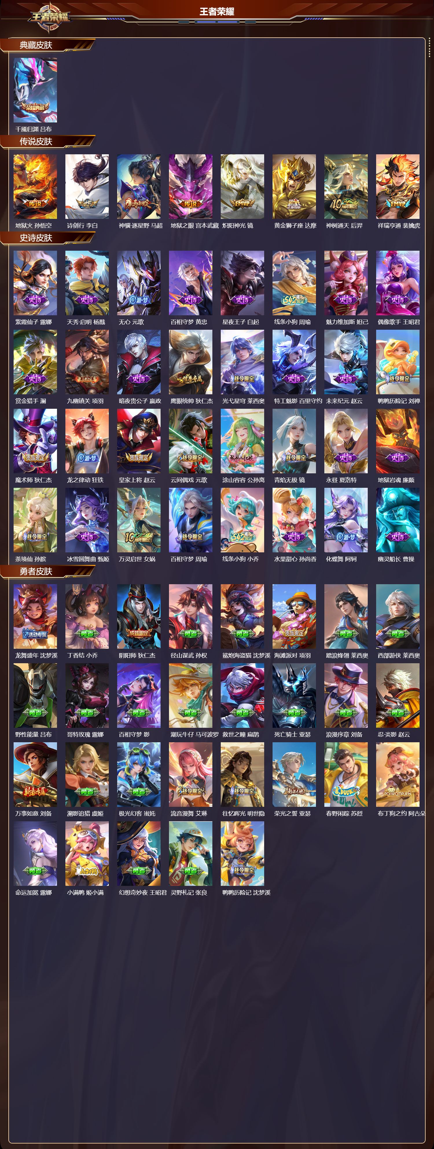 【32,史诗皮肤】紫霞仙子,露娜,天秀·启明,杨戬,无心,元歌,百相守梦,黄忠,星夜王子,白起,线条小狗,周瑜,魅力维加斯,妲己,偶像歌手,王昭君,赏金猎手,澜,九幽镇关,项羽,暗夜贵公子,嬴政,鹰眼统帅,狄仁杰,光弋星穹,莱西奥,特工魅影,百里守约,未来纪元,赵云,鸭鸭历险记,刘禅,魔术师,狄仁杰,龙之律动,狂铁,皇家上将,赵云,云间偶戏,元歌,涂山容容,公孙离,青焰无极,镜,永昼,夏洛特,地狱岩魂,廉颇,茶境仙,孙膑,冰雪圆舞曲,甄姬,万灵启世,女娲,百相守梦,周瑜,线条小狗,小乔,水果甜心,孙尚香,化蝶舞,阿轲,幽灵船长,曹操,