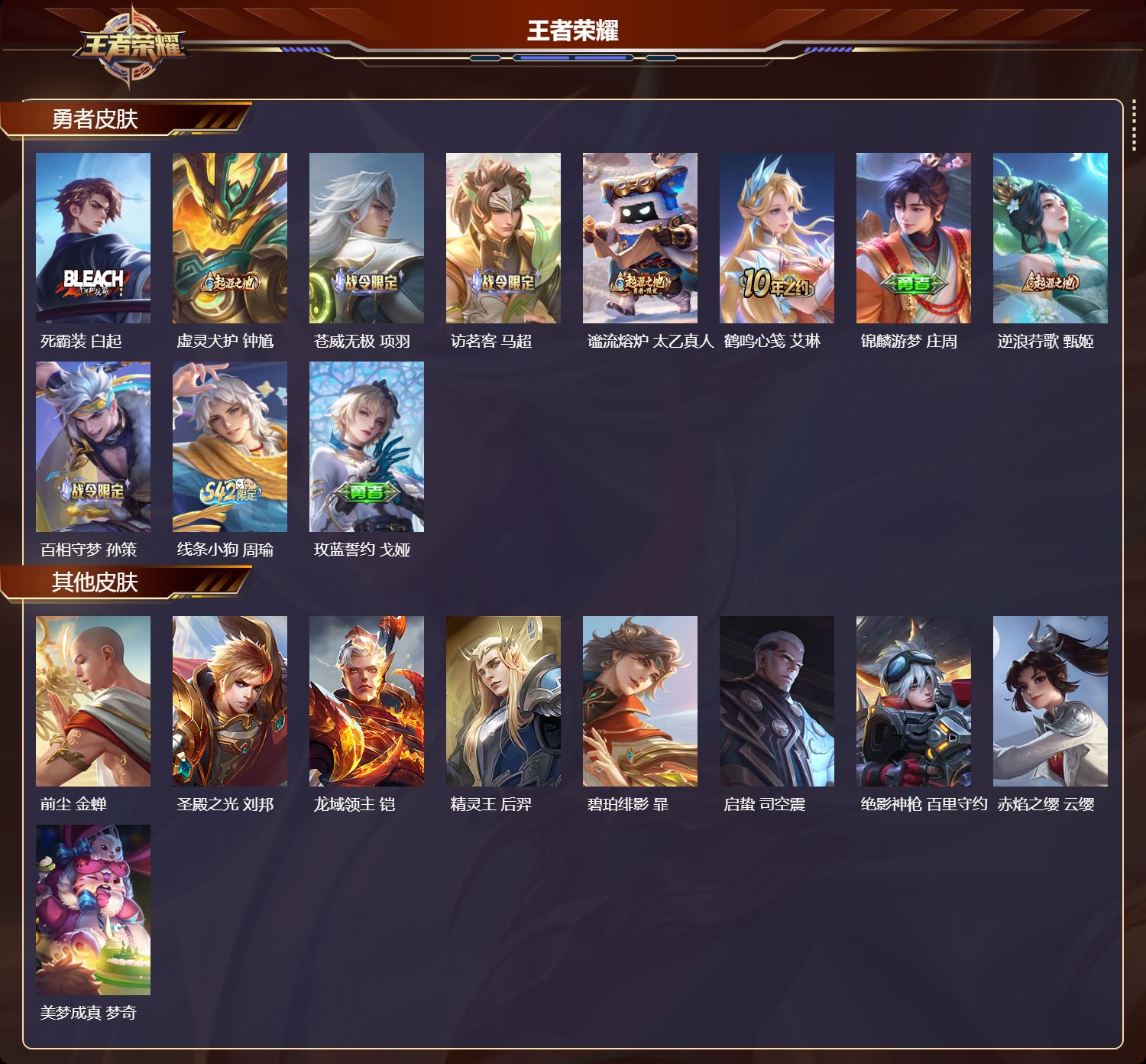 【9,其他皮肤】前尘,金蝉,圣殿之光,刘邦,龙域领主,铠,精灵王,后羿,碧珀绯影,暃,启蛰,司空震,绝影神枪,百里守约,赤焰之缨,云缨,美梦成真,梦奇,