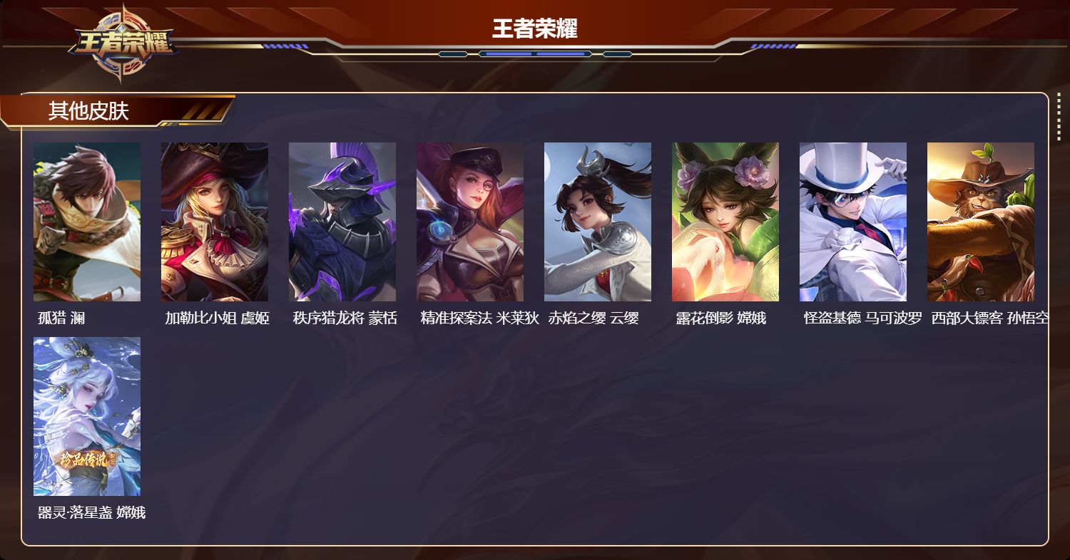 【32,其他皮肤】龙域领主,铠,花见巫女,伽罗,灼热之刃,李信,熊喵少女,阿古朵,海之征途,孙策,木偶奇遇记,鲁班七号,精灵王,后羿,冰刃幻境,镜,碧珀绯影,暃,启蛰,司空震,花间舞,公孙离,街头旋风,裴擒虎,修竹墨客,上官婉儿,剑舞者,花木兰,维京掠夺者,苍,激情绿茵,马可波罗,埃及法老,杨戬,归虚梦演,西施,威尼斯狂欢,百里玄策,幸存者,马超,创世神祝,盘古,特种部队,李元芳,绝影神枪,百里守约,孤猎,澜,加勒比小姐,虞姬,秩序猎龙将,蒙恬,精准探案法,米莱狄,赤焰之缨,云缨,露花倒影,嫦娥,怪盗基德,马可波罗,西部大镖客,孙悟空,器灵·落星盏,嫦娥,