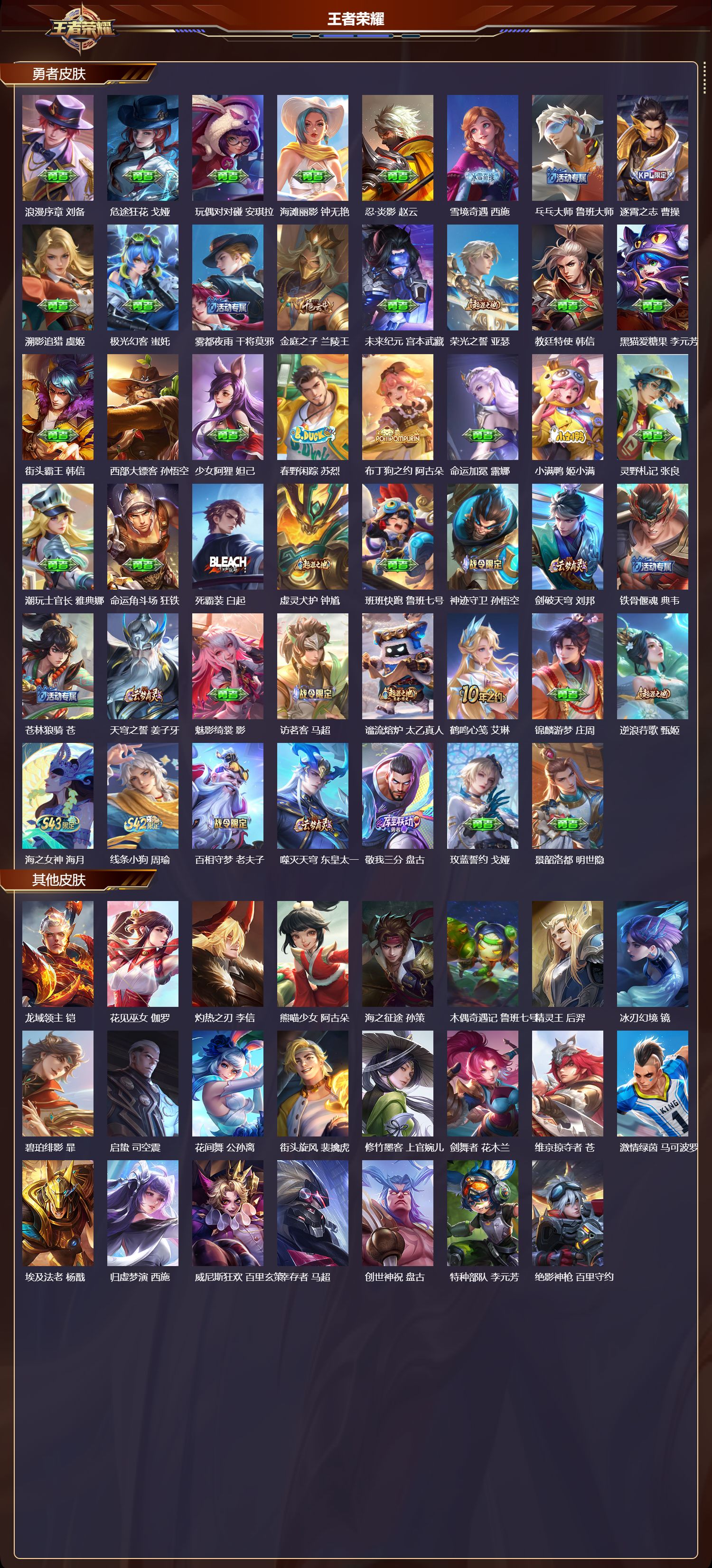 【68,勇者皮肤】胡桃夹子,干将莫邪,太极少年,赵怀真,龙舞盛年,沈梦溪,丁香结,小乔,铁甲之心,典韦,白色死神,白起,黄金武士,典韦,阴阳师,狄仁杰,径山谋武,孙权,海滩派对,项羽,克喵,鬼谷子,踏浪烽翎,莱西奥,红桃皇后,芈月,西部游侠,莱西奥,野性能量,吕布,哥特玫瑰,露娜,无双福将,程咬金,百相守梦,影,潮玩探月行,猪八戒,五福同心,张飞,赤刃凌霄,敖隐,浪漫序章,刘备,危途狂花,戈娅,玩偶对对碰,安琪拉,海滩丽影,钟无艳,忍·炎影,赵云,雪境奇遇,西施,乓乓大师,鲁班大师,逐霄之志,曹操,溯影追猎,虞姬,极光幻客,蚩奼,雾都夜雨,干将莫邪,金庭之子,兰陵王,未来纪元,宫本武藏,荣光之誓,亚瑟,教廷特使,韩信,黑猫爱糖果,李元芳,街头霸王,韩信,西部大镖客,孙悟空,少女阿狸,妲己,春野闲踪,苏烈,布丁狗之约,阿古朵,命运加冕,露娜,小满鸭,姬小满,灵野札记,张良,潮玩士官长,雅典娜,命运角斗场,狂铁,死霸装,白起,虚灵犬护,钟馗,班班快跑,鲁班七号,神迹守卫,孙悟空,剑破天穹,刘邦,铁骨偃魂,典韦,苍林狼骑,苍,天穹之誓,姜子牙,魅影绮裳,影,访茗客,马超,谧流熔炉,太乙真人,鹤鸣心笺,艾琳,锦麟游梦,庄周,逆浪荇歌,甄姬,海之女神,海月,线条小狗,周瑜,百相守梦,老夫子,噬灭天穹,东皇太一,敬我三分,盘古,玫蓝誓约,戈娅,景韶洛都,明世隐,