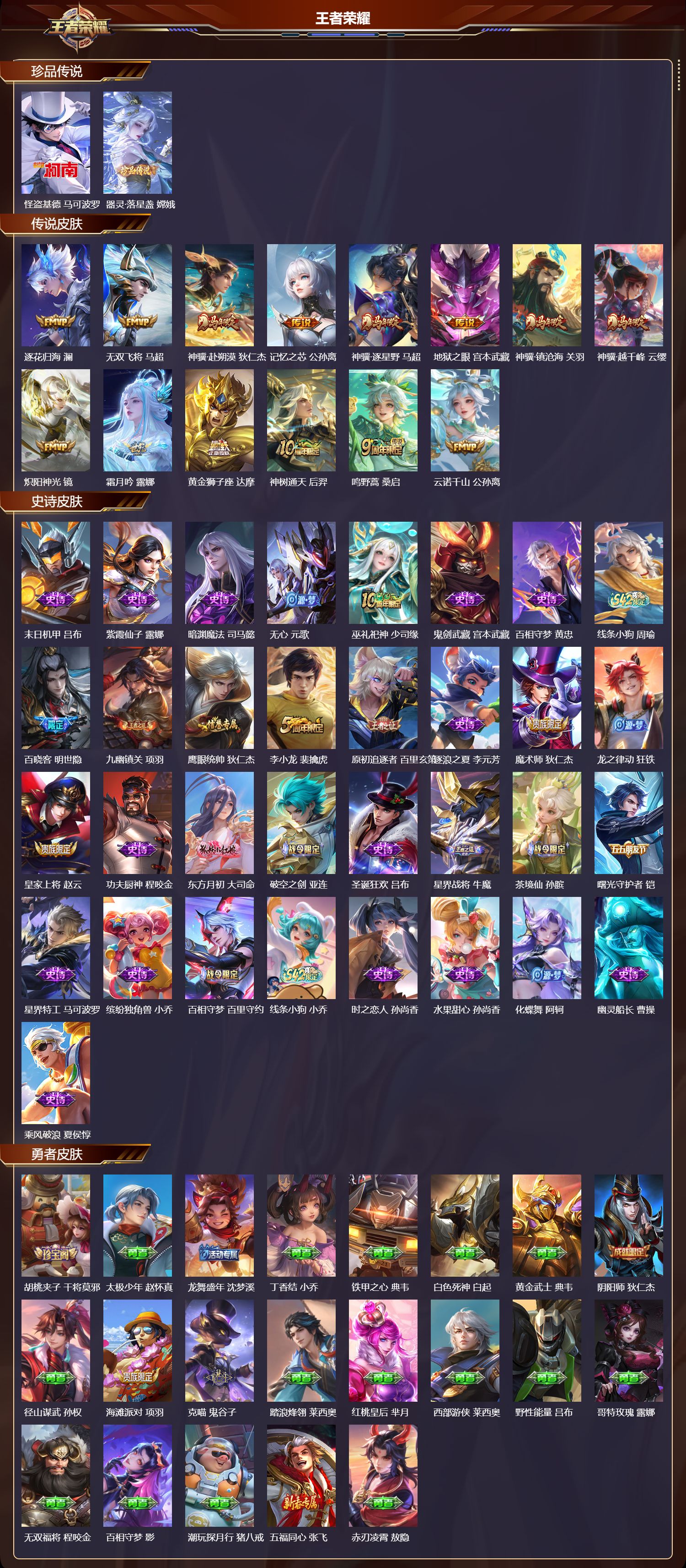 【33,史诗皮肤】末日机甲,吕布,紫霞仙子,露娜,暗渊魔法,司马懿,无心,元歌,巫礼祀神,少司缘,鬼剑武藏,宫本武藏,百相守梦,黄忠,线条小狗,周瑜,百晓客,明世隐,九幽镇关,项羽,鹰眼统帅,狄仁杰,李小龙,裴擒虎,原初追逐者,百里玄策,逐浪之夏,李元芳,魔术师,狄仁杰,龙之律动,狂铁,皇家上将,赵云,功夫厨神,程咬金,东方月初,大司命,破空之剑,亚连,圣诞狂欢,吕布,星界战将,牛魔,茶境仙,孙膑,曙光守护者,铠,星界特工,马可波罗,缤纷独角兽,小乔,百相守梦,百里守约,线条小狗,小乔,时之恋人,孙尚香,水果甜心,孙尚香,化蝶舞,阿轲,幽灵船长,曹操,乘风破浪,夏侯惇,