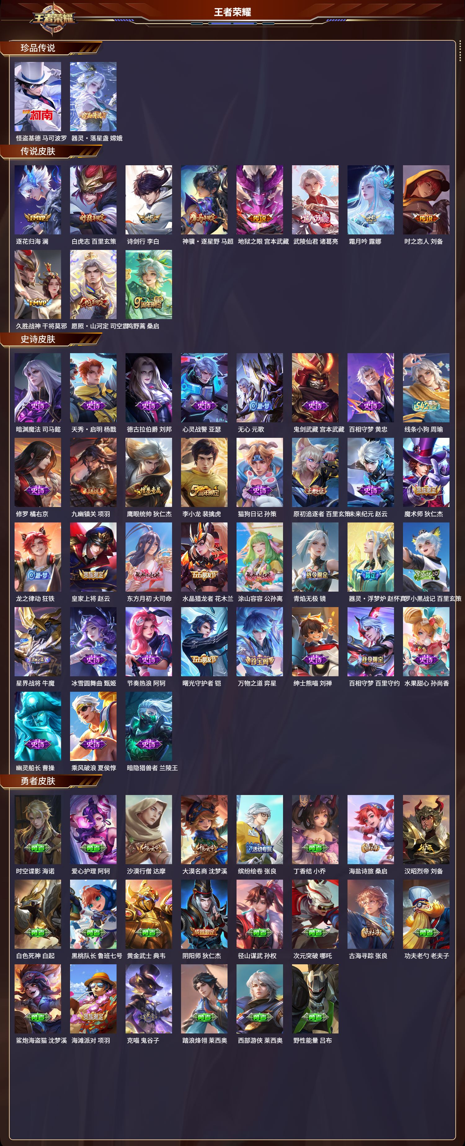 【35,史诗皮肤】暗渊魔法,司马懿,天秀·启明,杨戬,德古拉伯爵,刘邦,心灵战警,亚瑟,无心,元歌,鬼剑武藏,宫本武藏,百相守梦,黄忠,线条小狗,周瑜,修罗,橘右京,九幽镇关,项羽,鹰眼统帅,狄仁杰,李小龙,裴擒虎,猫狗日记,孙策,原初追逐者,百里玄策,未来纪元,赵云,魔术师,狄仁杰,龙之律动,狂铁,皇家上将,赵云,东方月初,大司命,水晶猎龙者,花木兰,涂山容容,公孙离,青焰无极,镜,器灵·浮梦炉,赵怀真,罗小黑战记,百里玄策,星界战将,牛魔,冰雪圆舞曲,甄姬,节奏热浪,阿轲,曙光守护者,铠,万物之道,弈星,绅士熊喵,刘禅,百相守梦,百里守约,水果甜心,孙尚香,幽灵船长,曹操,乘风破浪,夏侯惇,暗隐猎兽者,兰陵王,