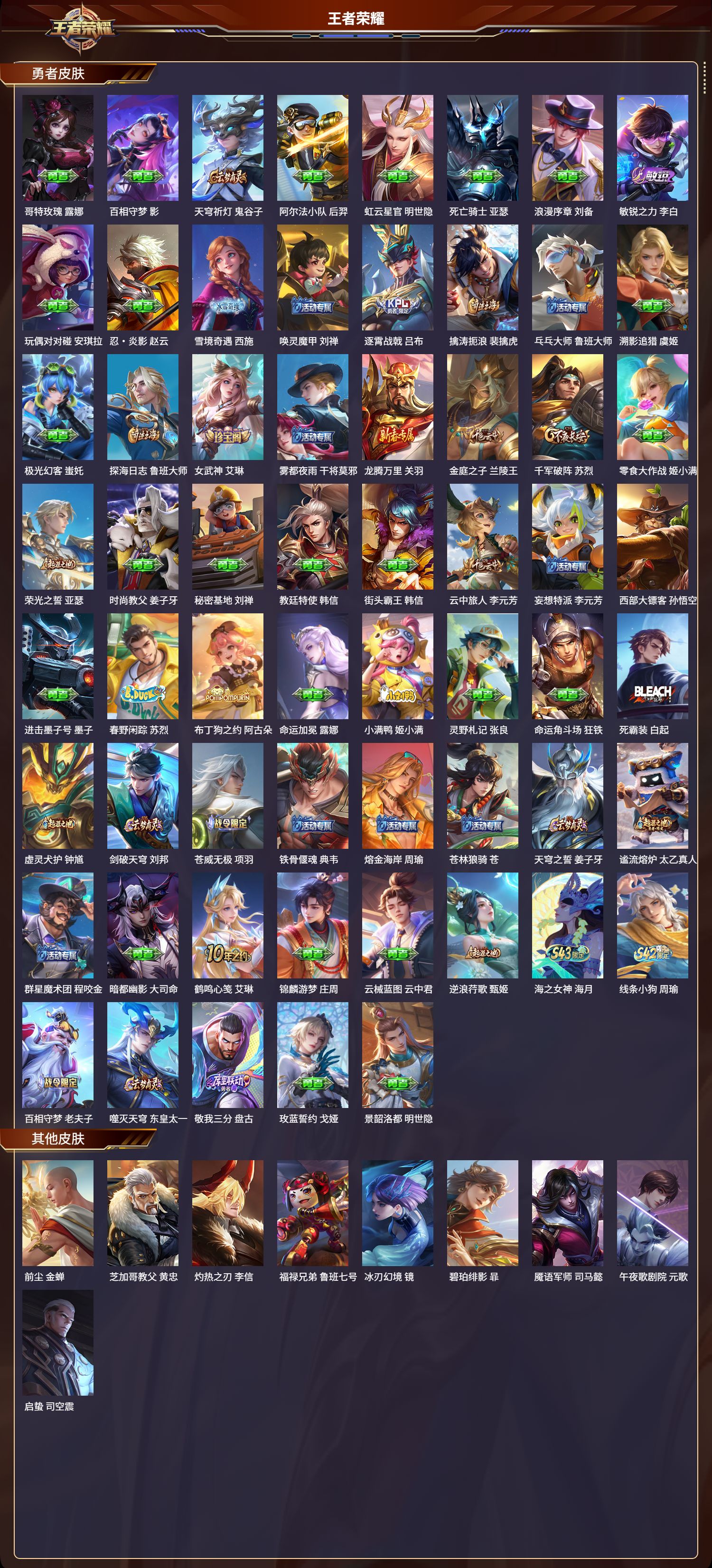 【83,勇者皮肤】时空谍影,海诺,爱心护理,阿轲,沙漠行僧,达摩,大漠名商,沈梦溪,缤纷绘卷,张良,丁香结,小乔,海盐诗旅,桑启,汉昭烈帝,刘备,白色死神,白起,黑桃队长,鲁班七号,黄金武士,典韦,阴阳师,狄仁杰,径山谋武,孙权,次元突破,哪吒,古海寻踪,张良,功夫老勺,老夫子,鲨炮海盗猫,沈梦溪,海滩派对,项羽,克喵,鬼谷子,踏浪烽翎,莱西奥,西部游侠,莱西奥,野性能量,吕布,哥特玫瑰,露娜,百相守梦,影,天穹祈灯,鬼谷子,阿尔法小队,后羿,虹云星官,明世隐,死亡骑士,亚瑟,浪漫序章,刘备,敏锐之力,李白,玩偶对对碰,安琪拉,忍·炎影,赵云,雪境奇遇,西施,唤灵魔甲,刘禅,逐霄战戟,吕布,擒涛扼浪,裴擒虎,乓乓大师,鲁班大师,溯影追猎,虞姬,极光幻客,蚩奼,探海日志,鲁班大师,女武神,艾琳,雾都夜雨,干将莫邪,龙腾万里,关羽,金庭之子,兰陵王,千军破阵,苏烈,零食大作战,姬小满,荣光之誓,亚瑟,时尚教父,姜子牙,秘密基地,刘禅,教廷特使,韩信,街头霸王,韩信,云中旅人,李元芳,妄想特派,李元芳,西部大镖客,孙悟空,进击墨子号,墨子,春野闲踪,苏烈,布丁狗之约,阿古朵,命运加冕,露娜,小满鸭,姬小满,灵野札记,张良,命运角斗场,狂铁,死霸装,白起,虚灵犬护,钟馗,剑破天穹,刘邦,苍威无极,项羽,铁骨偃魂,典韦,熔金海岸,周瑜,苍林狼骑,苍,天穹之誓,姜子牙,谧流熔炉,太乙真人,群星魔术团,程咬金,暗都幽影,大司命,鹤鸣心笺,艾琳,锦麟游梦,庄周,云械蓝图,云中君,逆浪荇歌,甄姬,海之女神,海月,线条小狗,周瑜,百相守梦,老夫子,噬灭天穹,东皇太一,敬我三分,盘古,玫蓝誓约,戈娅,景韶洛都,明世隐,