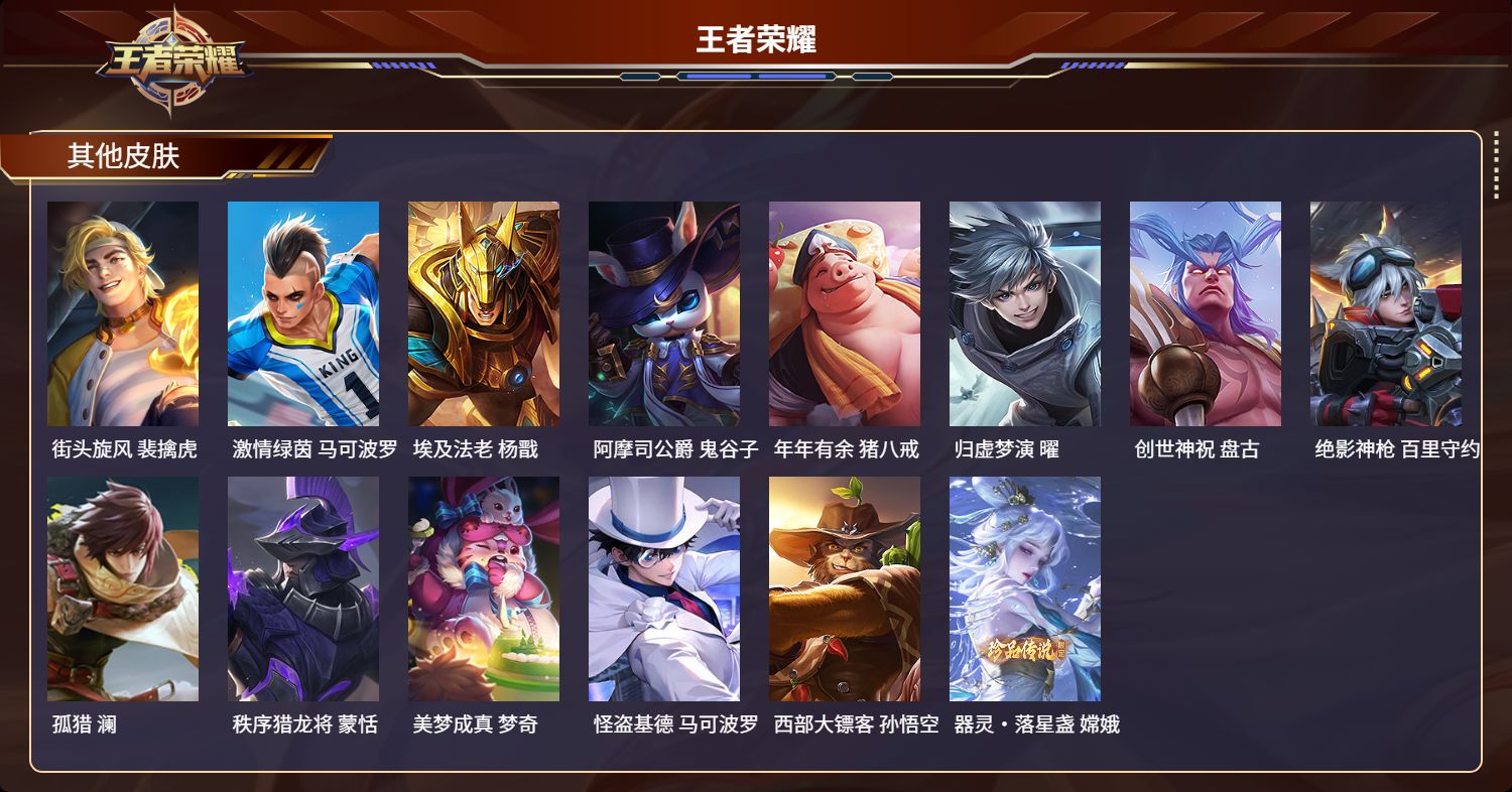 【23,其他皮肤】前尘,金蝉,芝加哥教父,黄忠,灼热之刃,李信,福禄兄弟,鲁班七号,冰刃幻境,镜,碧珀绯影,暃,魇语军师,司马懿,午夜歌剧院,元歌,启蛰,司空震,街头旋风,裴擒虎,激情绿茵,马可波罗,埃及法老,杨戬,阿摩司公爵,鬼谷子,年年有余,猪八戒,归虚梦演,曜,创世神祝,盘古,绝影神枪,百里守约,孤猎,澜,秩序猎龙将,蒙恬,美梦成真,梦奇,怪盗基德,马可波罗,西部大镖客,孙悟空,器灵·落星盏,嫦娥,