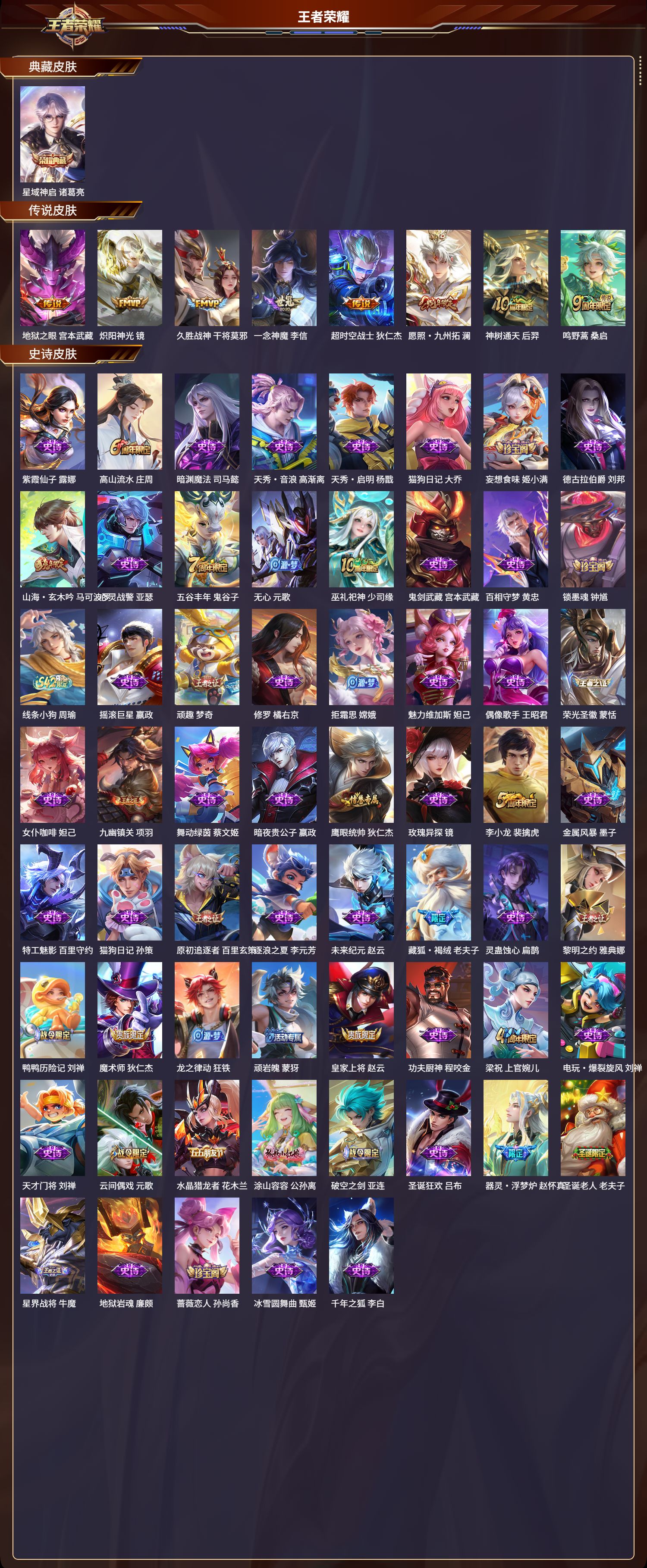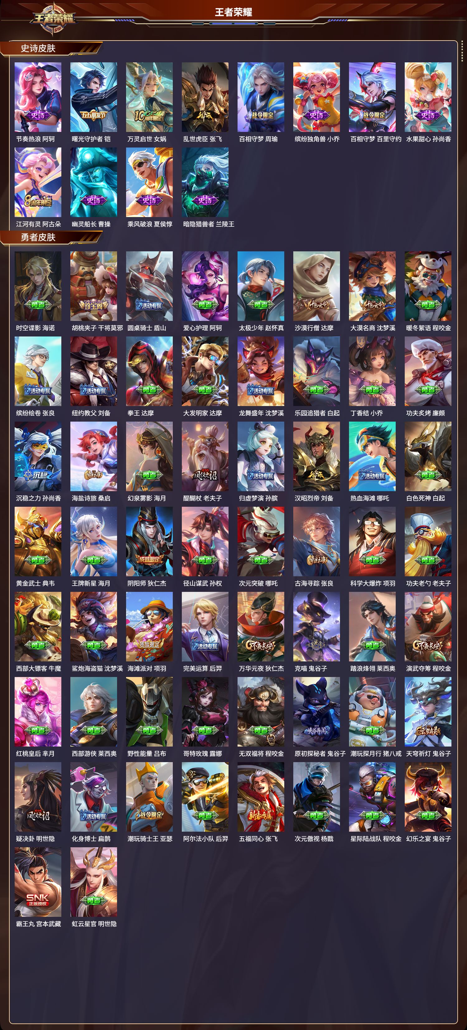 【73,史诗皮肤】紫霞仙子,露娜,高山流水,庄周,暗渊魔法,司马懿,天秀·音浪,高渐离,天秀·启明,杨戬,猫狗日记,大乔,妄想食味,姬小满,德古拉伯爵,刘邦,山海·玄木吟,马可波罗,心灵战警,亚瑟,五谷丰年,鬼谷子,无心,元歌,巫礼祀神,少司缘,鬼剑武藏,宫本武藏,百相守梦,黄忠,锁墨魂,钟馗,线条小狗,周瑜,摇滚巨星,嬴政,顽趣,梦奇,修罗,橘右京,拒霜思,嫦娥,魅力维加斯,妲己,偶像歌手,王昭君,荣光圣徽,蒙恬,女仆咖啡,妲己,九幽镇关,项羽,舞动绿茵,蔡文姬,暗夜贵公子,嬴政,鹰眼统帅,狄仁杰,玫瑰异探,镜,李小龙,裴擒虎,金属风暴,墨子,特工魅影,百里守约,猫狗日记,孙策,原初追逐者,百里玄策,逐浪之夏,李元芳,未来纪元,赵云,藏狐·褐绒,老夫子,灵蛊蚀心,扁鹊,黎明之约,雅典娜,鸭鸭历险记,刘禅,魔术师,狄仁杰,龙之律动,狂铁,顽岩魄,蒙犽,皇家上将,赵云,功夫厨神,程咬金,梁祝,上官婉儿,电玩·爆裂旋风,刘禅,天才门将,刘禅,云间偶戏,元歌,水晶猎龙者,花木兰,涂山容容,公孙离,破空之剑,亚连,圣诞狂欢,吕布,器灵·浮梦炉,赵怀真,圣诞老人,老夫子,星界战将,牛魔,地狱岩魂,廉颇,蔷薇恋人,孙尚香,冰雪圆舞曲,甄姬,千年之狐,李白,节奏热浪,阿轲,曙光守护者,铠,万灵启世,女娲,乱世虎臣,张飞,百相守梦,周瑜,缤纷独角兽,小乔,百相守梦,百里守约,水果甜心,孙尚香,江河有灵,阿古朵,幽灵船长,曹操,乘风破浪,夏侯惇,暗隐猎兽者,兰陵王,