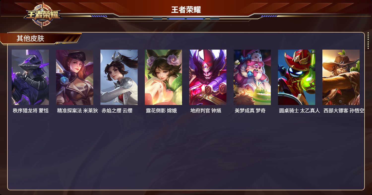 【64,其他皮肤】伊势巫女,大乔,金属狂潮,高渐离,前尘,金蝉,圣殿之光,刘邦,芝加哥教父,黄忠,潮流仙人,老夫子,三太子,哪吒,棒球奇才,沈梦溪,龙域领主,铠,生化警戒,钟无艳,超能战警,曹操,花见巫女,伽罗,爱与和平,苏烈,未来旅行,孙膑,第七人偶,干将莫邪,万圣前夜,小乔,灼热之刃,李信,熊喵少女,阿古朵,海之征途,孙策,木偶奇遇记,鲁班七号,精灵王,后羿,冰刃幻境,镜,碧珀绯影,暃,海军大将,周瑜,星航指挥官,诸葛亮,魇语军师,司马懿,英喵野望,刘禅,午夜歌剧院,元歌,启蛰,司空震,隐刃,兰陵王,花间舞,公孙离,街头旋风,裴擒虎,东海龙王,东皇太一,修竹墨客,上官婉儿,范海辛,李白,维京掠夺者,苍,占星师,明世隐,归虚梦演,蒙犽,激情绿茵,马可波罗,埃及法老,杨戬,画中游,桑启,年年有余,猪八戒,尼罗河女神,女娲,锦衣卫,狄仁杰,一千零一夜,张良,归虚梦演,曜,威尼斯狂欢,百里玄策,幸存者,马超,战争女神,雅典娜,荷鲁斯之眼,云中君,创世神祝,盘古,特种部队,李元芳,绝影神枪,百里守约,孤猎,澜,加勒比小姐,虞姬,踏雪寻梅,弈星,秩序猎龙将,蒙恬,精准探案法,米莱狄,赤焰之缨,云缨,露花倒影,嫦娥,地府判官,钟馗,美梦成真,梦奇,圆桌骑士,太乙真人,西部大镖客,孙悟空,