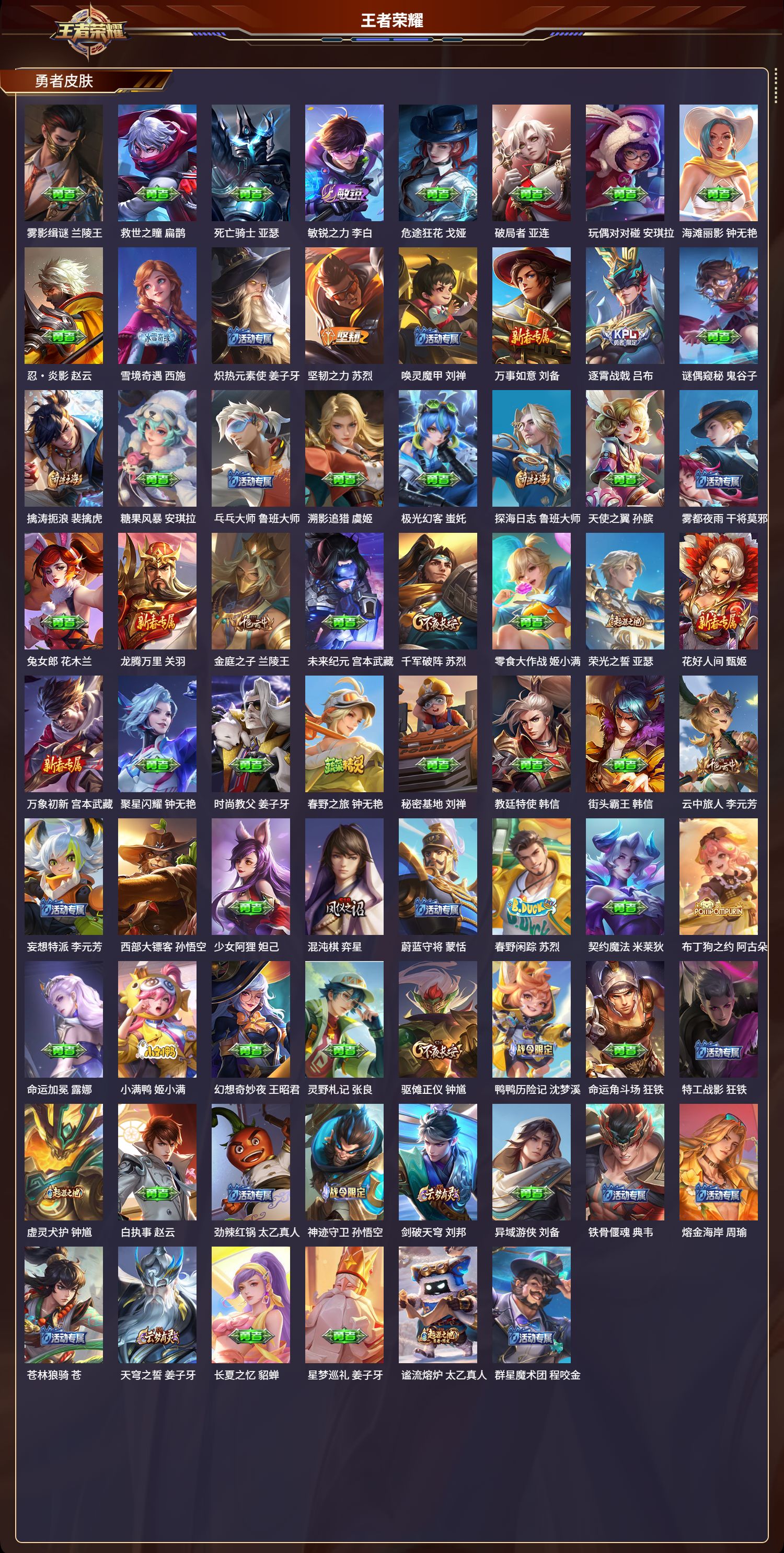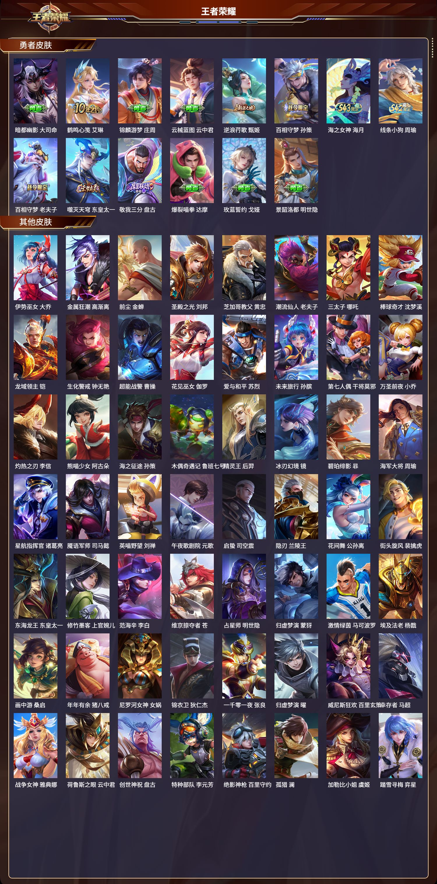 【142,勇者皮肤】时空谍影,海诺,胡桃夹子,干将莫邪,圆桌骑士,盾山,爱心护理,阿轲,太极少年,赵怀真,沙漠行僧,达摩,大漠名商,沈梦溪,暖冬絮语,程咬金,缤纷绘卷,张良,纽约教父,刘备,拳王,达摩,大发明家,达摩,龙舞盛年,沈梦溪,乐园追猎者,白起,丁香结,小乔,功夫炙烤,廉颇,沉稳之力,孙尚香,海盐诗旅,桑启,幻泉雾影,海月,醍醐杖,老夫子,归虚梦演,孙膑,汉昭烈帝,刘备,热血海滩,哪吒,白色死神,白起,黄金武士,典韦,王牌新星,海月,阴阳师,狄仁杰,径山谋武,孙权,次元突破,哪吒,古海寻踪,张良,科学大爆炸,项羽,功夫老勺,老夫子,西部大镖客,牛魔,鲨炮海盗猫,沈梦溪,海滩派对,项羽,完美运算,后羿,万华元夜,狄仁杰,克喵,鬼谷子,踏浪烽翎,莱西奥,演武夺筹,程咬金,红桃皇后,芈月,西部游侠,莱西奥,野性能量,吕布,哥特玫瑰,露娜,无双福将,程咬金,原初探秘者,鬼谷子,潮玩探月行,猪八戒,天穹祈灯,鬼谷子,疑决卦,明世隐,化身博士,扁鹊,潮玩骑士王,亚瑟,阿尔法小队,后羿,五福同心,张飞,次元傲视,杨戬,星际陆战队,程咬金,幻乐之宴,鬼谷子,霸王丸,宫本武藏,虹云星官,明世隐,雾影缉谜,兰陵王,救世之瞳,扁鹊,死亡骑士,亚瑟,敏锐之力,李白,危途狂花,戈娅,破局者,亚连,玩偶对对碰,安琪拉,海滩丽影,钟无艳,忍·炎影,赵云,雪境奇遇,西施,炽热元素使,姜子牙,坚韧之力,苏烈,唤灵魔甲,刘禅,万事如意,刘备,逐霄战戟,吕布,谜偶窥秘,鬼谷子,擒涛扼浪,裴擒虎,糖果风暴,安琪拉,乓乓大师,鲁班大师,溯影追猎,虞姬,极光幻客,蚩奼,探海日志,鲁班大师,天使之翼,孙膑,雾都夜雨,干将莫邪,兔女郎,花木兰,龙腾万里,关羽,金庭之子,兰陵王,未来纪元,宫本武藏,千军破阵,苏烈,零食大作战,姬小满,荣光之誓,亚瑟,花好人间,甄姬,万象初新,宫本武藏,聚星闪耀,钟无艳,时尚教父,姜子牙,春野之旅,钟无艳,秘密基地,刘禅,教廷特使,韩信,街头霸王,韩信,云中旅人,李元芳,妄想特派,李元芳,西部大镖客,孙悟空,少女阿狸,妲己,混沌棋,弈星,蔚蓝守将,蒙恬,春野闲踪,苏烈,契约魔法,米莱狄,布丁狗之约,阿古朵,命运加冕,露娜,小满鸭,姬小满,幻想奇妙夜,王昭君,灵野札记,张良,驱傩正仪,钟馗,鸭鸭历险记,沈梦溪,命运角斗场,狂铁,特工战影,狂铁,虚灵犬护,钟馗,白执事,赵云,劲辣红锅,太乙真人,神迹守卫,孙悟空,剑破天穹,刘邦,异域游侠,刘备,铁骨偃魂,典韦,熔金海岸,周瑜,苍林狼骑,苍,天穹之誓,姜子牙,长夏之忆,貂蝉,星梦巡礼,姜子牙,谧流熔炉,太乙真人,群星魔术团,程咬金,暗都幽影,大司命,鹤鸣心笺,艾琳,锦麟游梦,庄周,云械蓝图,云中君,逆浪荇歌,甄姬,百相守梦,孙策,海之女神,海月,线条小狗,周瑜,百相守梦,老夫子,噬灭天穹,东皇太一,敬我三分,盘古,爆裂喵拳,达摩,玫蓝誓约,戈娅,景韶洛都,明世隐,