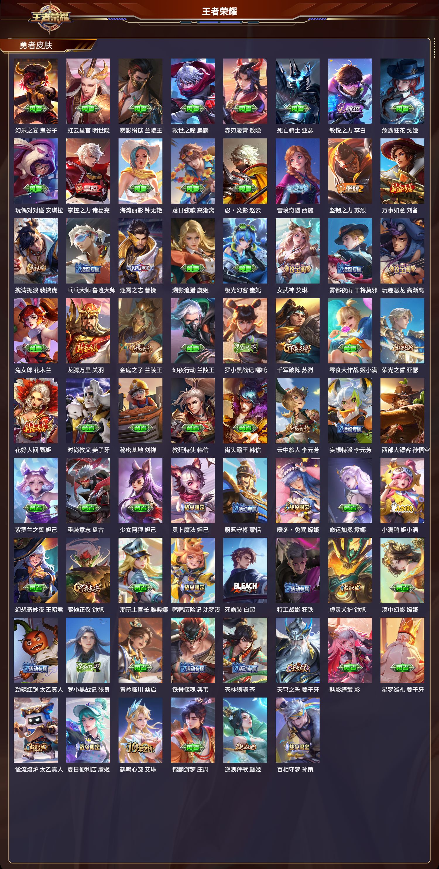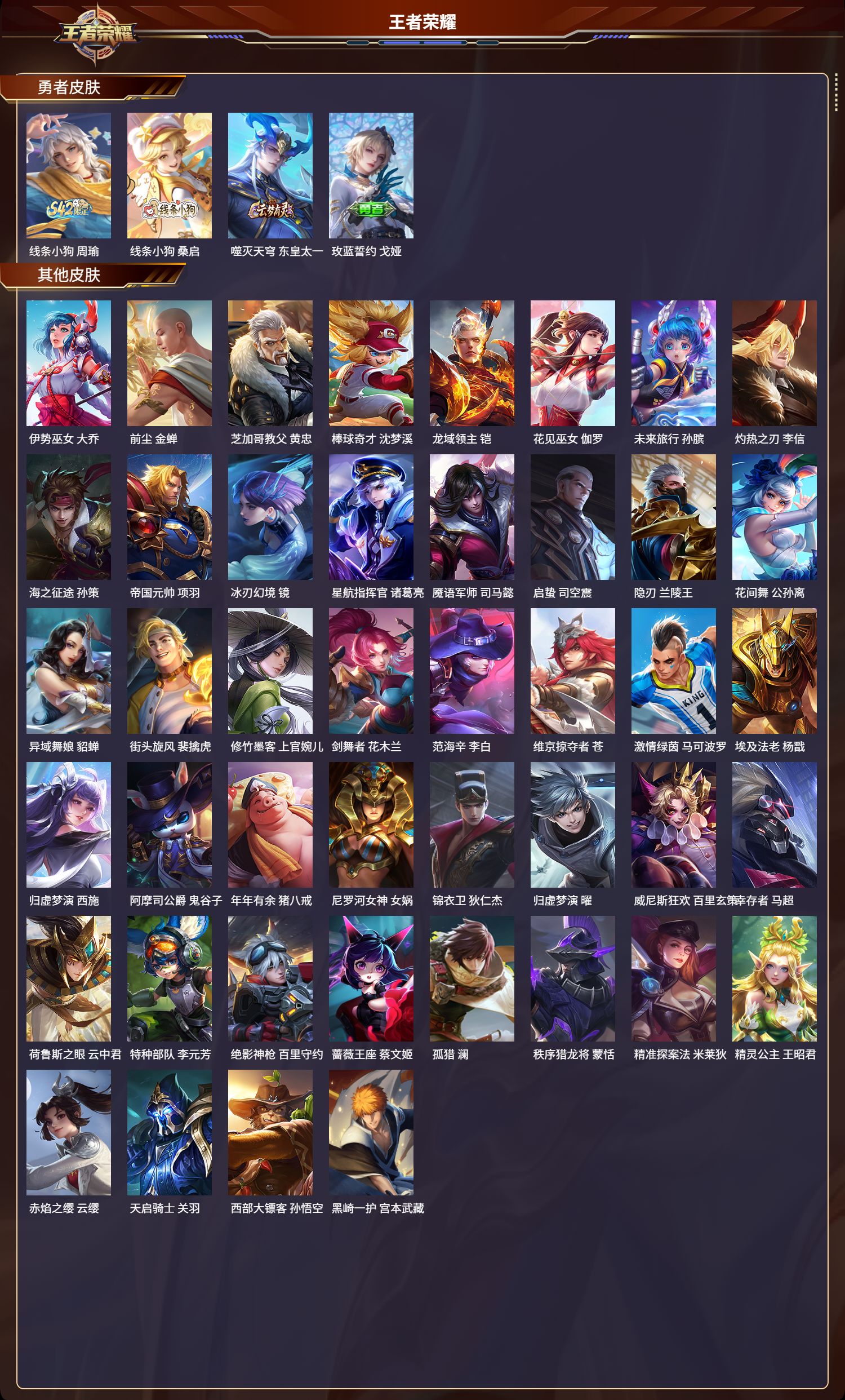 【114,勇者皮肤】时空谍影,海诺,爱心护理,阿轲,沙漠行僧,达摩,大漠名商,沈梦溪,纽约教父,刘备,拳王,达摩,大发明家,达摩,龙舞盛年,沈梦溪,乐园追猎者,白起,功夫炙烤,廉颇,沉稳之力,孙尚香,海盐诗旅,桑启,汉昭烈帝,刘备,白色死神,白起,黄金武士,典韦,阴阳师,狄仁杰,径山谋武,孙权,次元突破,哪吒,古海寻踪,张良,牛运亨通,牛魔,戏梦巡演,空空儿,功夫老勺,老夫子,西部大镖客,牛魔,鲨炮海盗猫,沈梦溪,海滩派对,项羽,完美运算,后羿,克喵,鬼谷子,踏浪烽翎,莱西奥,演武夺筹,程咬金,野性能量,吕布,哥特玫瑰,露娜,守护之力,大乔,无双福将,程咬金,百相守梦,影,原初探秘者,鬼谷子,潮玩探月行,猪八戒,天穹祈灯,鬼谷子,潮玩骑士王,亚瑟,金色潮汐,朵莉亚,星际陆战队,程咬金,幻乐之宴,鬼谷子,虹云星官,明世隐,雾影缉谜,兰陵王,救世之瞳,扁鹊,赤刃凌霄,敖隐,死亡骑士,亚瑟,敏锐之力,李白,危途狂花,戈娅,玩偶对对碰,安琪拉,掌控之力,诸葛亮,海滩丽影,钟无艳,落日弦歌,高渐离,忍·炎影,赵云,雪境奇遇,西施,坚韧之力,苏烈,万事如意,刘备,擒涛扼浪,裴擒虎,乓乓大师,鲁班大师,逐霄之志,曹操,溯影追猎,虞姬,极光幻客,蚩奼,女武神,艾琳,雾都夜雨,干将莫邪,玩趣恶龙,高渐离,兔女郎,花木兰,龙腾万里,关羽,金庭之子,兰陵王,幻夜行动,兰陵王,罗小黑战记,哪吒,千军破阵,苏烈,零食大作战,姬小满,荣光之誓,亚瑟,花好人间,甄姬,时尚教父,姜子牙,秘密基地,刘禅,教廷特使,韩信,街头霸王,韩信,云中旅人,李元芳,妄想特派,李元芳,西部大镖客,孙悟空,紫罗兰之誓,妲己,重装意志,盘古,少女阿狸,妲己,灵卜魔法,妲己,蔚蓝守将,蒙恬,暖冬·兔眠,嫦娥,命运加冕,露娜,小满鸭,姬小满,幻想奇妙夜,王昭君,驱傩正仪,钟馗,潮玩士官长,雅典娜,鸭鸭历险记,沈梦溪,死霸装,白起,特工战影,狂铁,虚灵犬护,钟馗,漠中幻影,嫦娥,劲辣红锅,太乙真人,罗小黑战记,张良,青衿临川,桑启,铁骨偃魂,典韦,苍林狼骑,苍,天穹之誓,姜子牙,魅影绮裳,影,星梦巡礼,姜子牙,谧流熔炉,太乙真人,夏日便利店,虞姬,鹤鸣心笺,艾琳,锦麟游梦,庄周,逆浪荇歌,甄姬,百相守梦,孙策,线条小狗,周瑜,线条小狗,桑启,噬灭天穹,东皇太一,玫蓝誓约,戈娅,