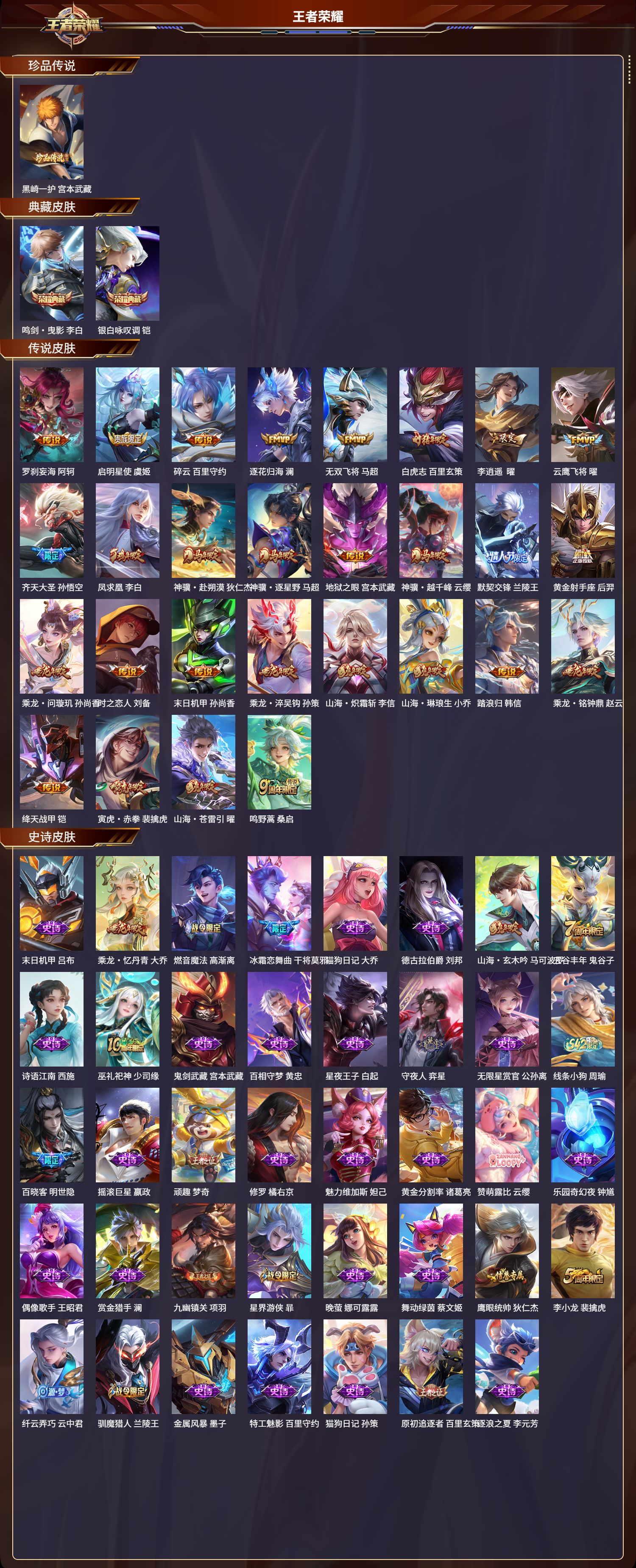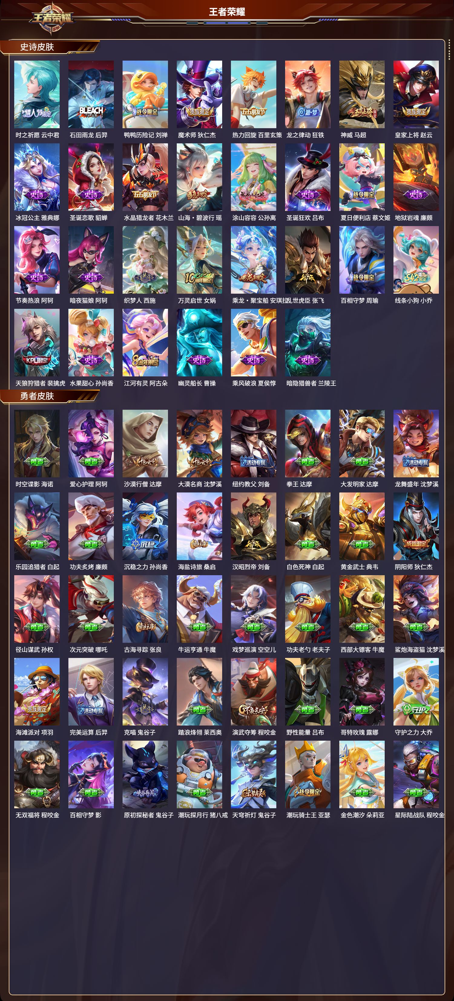 【69,史诗皮肤】末日机甲,吕布,乘龙·忆丹青,大乔,燃音魔法,高渐离,冰霜恋舞曲,干将莫邪,猫狗日记,大乔,德古拉伯爵,刘邦,山海·玄木吟,马可波罗,五谷丰年,鬼谷子,诗语江南,西施,巫礼祀神,少司缘,鬼剑武藏,宫本武藏,百相守梦,黄忠,星夜王子,白起,守夜人,弈星,无限星赏官,公孙离,线条小狗,周瑜,百晓客,明世隐,摇滚巨星,嬴政,顽趣,梦奇,修罗,橘右京,魅力维加斯,妲己,黄金分割率,诸葛亮,赞萌露比,云缨,乐园奇幻夜,钟馗,偶像歌手,王昭君,赏金猎手,澜,九幽镇关,项羽,星界游侠,暃,晚萤,娜可露露,舞动绿茵,蔡文姬,鹰眼统帅,狄仁杰,李小龙,裴擒虎,纤云弄巧,云中君,驯魔猎人,兰陵王,金属风暴,墨子,特工魅影,百里守约,猫狗日记,孙策,原初追逐者,百里玄策,逐浪之夏,李元芳,时之祈愿,云中君,石田雨龙,后羿,鸭鸭历险记,刘禅,魔术师,狄仁杰,热力回旋,百里玄策,龙之律动,狂铁,神威,马超,皇家上将,赵云,冰冠公主,雅典娜,圣诞恋歌,貂蝉,水晶猎龙者,花木兰,山海·碧波行,瑶,涂山容容,公孙离,圣诞狂欢,吕布,夏日便利店,蔡文姬,地狱岩魂,廉颇,节奏热浪,阿轲,暗夜猫娘,阿轲,织梦人,西施,万灵启世,女娲,乘龙·聚宝船,安琪拉,乱世虎臣,张飞,百相守梦,周瑜,线条小狗,小乔,天狼狩猎者,裴擒虎,水果甜心,孙尚香,江河有灵,阿古朵,幽灵船长,曹操,乘风破浪,夏侯惇,暗隐猎兽者,兰陵王,