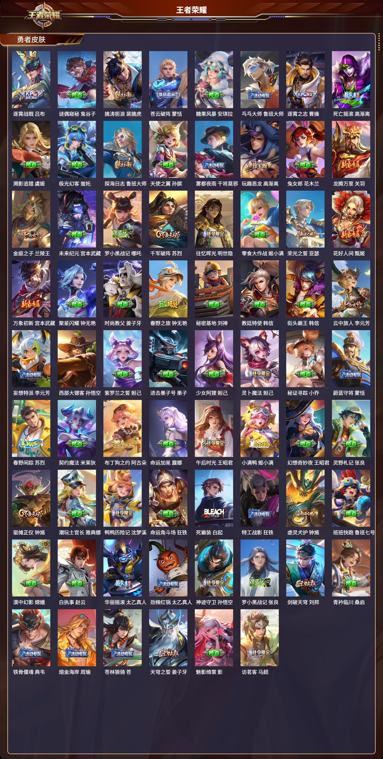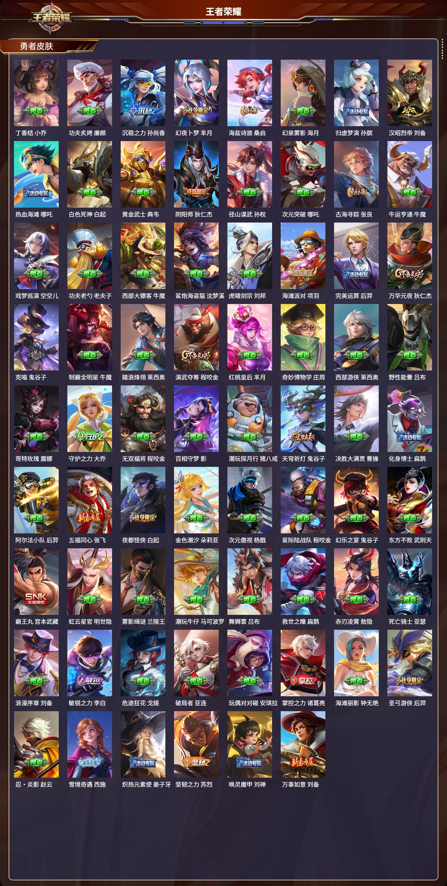 【176,勇者皮肤】时空谍影,海诺,圆桌骑士,盾山,爱心护理,阿轲,太极少年,赵怀真,星际陆战队,达摩,沙漠行僧,达摩,大漠名商,沈梦溪,缤纷绘卷,张良,纽约教父,刘备,拳王,达摩,大发明家,达摩,龙舞盛年,沈梦溪,乐园追猎者,白起,丁香结,小乔,功夫炙烤,廉颇,沉稳之力,孙尚香,幻夜卜梦,芈月,海盐诗旅,桑启,幻泉雾影,海月,归虚梦演,孙膑,汉昭烈帝,刘备,热血海滩,哪吒,白色死神,白起,黄金武士,典韦,阴阳师,狄仁杰,径山谋武,孙权,次元突破,哪吒,古海寻踪,张良,牛运亨通,牛魔,戏梦巡演,空空儿,功夫老勺,老夫子,西部大镖客,牛魔,鲨炮海盗猫,沈梦溪,虎啸剑宗,刘邦,海滩派对,项羽,完美运算,后羿,万华元夜,狄仁杰,克喵,鬼谷子,制霸全明星,牛魔,踏浪烽翎,莱西奥,演武夺筹,程咬金,红桃皇后,芈月,奇妙博物学,庄周,西部游侠,莱西奥,野性能量,吕布,哥特玫瑰,露娜,守护之力,大乔,无双福将,程咬金,百相守梦,影,潮玩探月行,猪八戒,天穹祈灯,鬼谷子,决胜大满贯,曹操,化身博士,扁鹊,阿尔法小队,后羿,五福同心,张飞,夜都怪侠,白起,金色潮汐,朵莉亚,次元傲视,杨戬,星际陆战队,程咬金,幻乐之宴,鬼谷子,东方不败,武则天,霸王丸,宫本武藏,虹云星官,明世隐,雾影缉谜,兰陵王,潮玩牛仔,马可波罗,舞狮寰,吕布,救世之瞳,扁鹊,赤刃凌霄,敖隐,死亡骑士,亚瑟,浪漫序章,刘备,敏锐之力,李白,危途狂花,戈娅,破局者,亚连,玩偶对对碰,安琪拉,掌控之力,诸葛亮,海滩丽影,钟无艳,圣弓游侠,后羿,忍·炎影,赵云,雪境奇遇,西施,炽热元素使,姜子牙,坚韧之力,苏烈,唤灵魔甲,刘禅,万事如意,刘备,逐霄战戟,吕布,谜偶窥秘,鬼谷子,擒涛扼浪,裴擒虎,苍云破阵,蒙恬,糖果风暴,安琪拉,乓乓大师,鲁班大师,逐霄之志,曹操,死亡摇滚,高渐离,溯影追猎,虞姬,极光幻客,蚩奼,探海日志,鲁班大师,天使之翼,孙膑,雾都夜雨,干将莫邪,玩趣恶龙,高渐离,兔女郎,花木兰,龙腾万里,关羽,金庭之子,兰陵王,未来纪元,宫本武藏,罗小黑战记,哪吒,千军破阵,苏烈,往忆晖光,明世隐,零食大作战,姬小满,荣光之誓,亚瑟,花好人间,甄姬,万象初新,宫本武藏,聚星闪耀,钟无艳,时尚教父,姜子牙,春野之旅,钟无艳,秘密基地,刘禅,教廷特使,韩信,街头霸王,韩信,云中旅人,李元芳,妄想特派,李元芳,西部大镖客,孙悟空,紫罗兰之誓,妲己,进击墨子号,墨子,少女阿狸,妲己,灵卜魔法,妲己,秘证寻踪,小乔,蔚蓝守将,蒙恬,春野闲踪,苏烈,契约魔法,米莱狄,布丁狗之约,阿古朵,命运加冕,露娜,午后时光,王昭君,小满鸭,姬小满,幻想奇妙夜,王昭君,灵野札记,张良,驱傩正仪,钟馗,潮玩士官长,雅典娜,鸭鸭历险记,沈梦溪,命运角斗场,狂铁,死霸装,白起,特工战影,狂铁,虚灵犬护,钟馗,班班快跑,鲁班七号,漠中幻影,嫦娥,白执事,赵云,华丽摇滚,太乙真人,劲辣红锅,太乙真人,神迹守卫,孙悟空,罗小黑战记,张良,剑破天穹,刘邦,青衿临川,桑启,铁骨偃魂,典韦,熔金海岸,周瑜,苍林狼骑,苍,天穹之誓,姜子牙,魅影绮裳,影,访茗客,马超,星梦巡礼,姜子牙,谧流熔炉,太乙真人,金福满堂,东皇太一,群星魔术团,程咬金,暗都幽影,大司命,夏日便利店,虞姬,鹤鸣心笺,艾琳,线条小狗,妲己,锦麟游梦,庄周,云械蓝图,云中君,逆浪荇歌,甄姬,百相守梦,孙策,海之女神,海月,微风如诗,大乔,线条小狗,周瑜,线条小狗,桑启,百相守梦,老夫子,噬灭天穹,东皇太一,灵卦秘语,少司缘,敬我三分,盘古,爆裂喵拳,达摩,玫蓝誓约,戈娅,景韶洛都,明世隐,